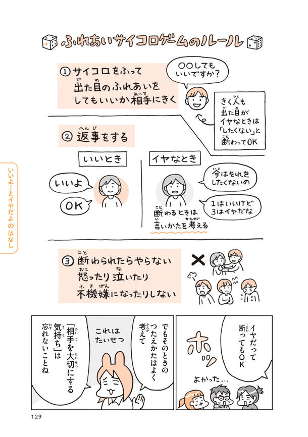『こどもせいきょういくはじめます』(著:フクチマミ・村瀬幸浩・北山ひと美)におきまして、第四刷より表現の見直しを行いましたのでお知らせします。 ●【6章 いいよ!とイヤだよ のはなし/第17話 いざ!ふれあいサイコロゲーム!】P129 ふれあいサイコロゲームのルールについて、教育現場の実践に即して表現を見直しました。詳細は以下となります。 【第17話 いざ!ふれあいサイコロゲーム】