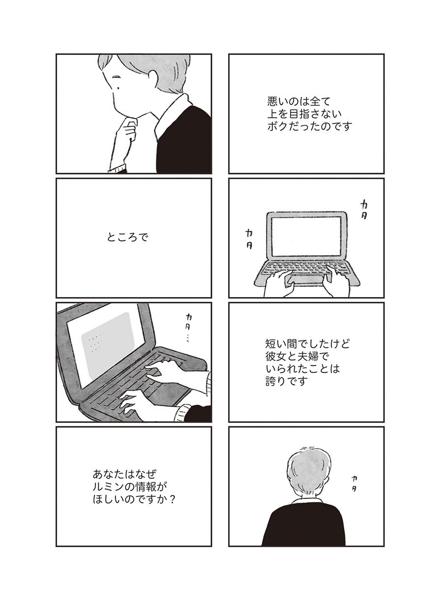 合言葉は「みんなで幸せになろう」。人気エッセイスト・中井ルミンが主宰するオンラインサロンには彼女を慕う大勢のファンが集まる。子どもの学校の担任との不和、義理の姉との確執、悩みに寄り添ってくれるルミンは尊敬できて、魅力的な存在。だけど何か違和感がある…。ルミンがブログに綴るのは、中学時代の同級生のSちゃんとの思い出。酪農家の娘Sちゃんは同級生から「牛の糞臭い」とからかわれ不登校になり、そんな同級生たちをルミンが嗜め、彼女の発案でSちゃんに手紙を渡し学校に来るようになったという話。そのブログをたまたま目にした旧友がいた。「このブログ…うそばっかり。だって沙世ちゃんあの次の日、自殺未遂を起こしたのに…」。サロンのメンバー、同級生や元夫、仕事仲間、ルミンをめぐる様々な人の思惑と言い分が交錯するミステリーコミックエッセイ。彼女は「いい人」? それとも「悪魔」? 本当のことを言っているのは一体誰なのか―――!?