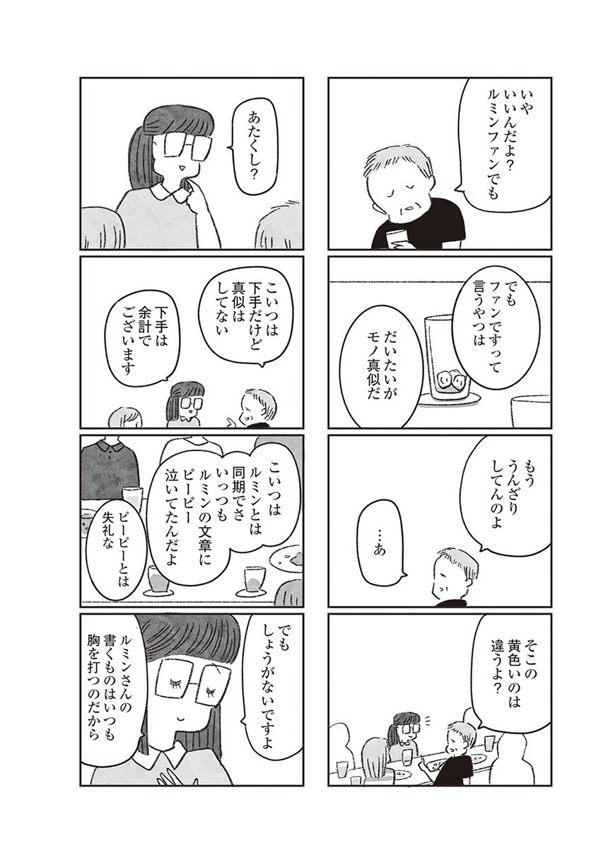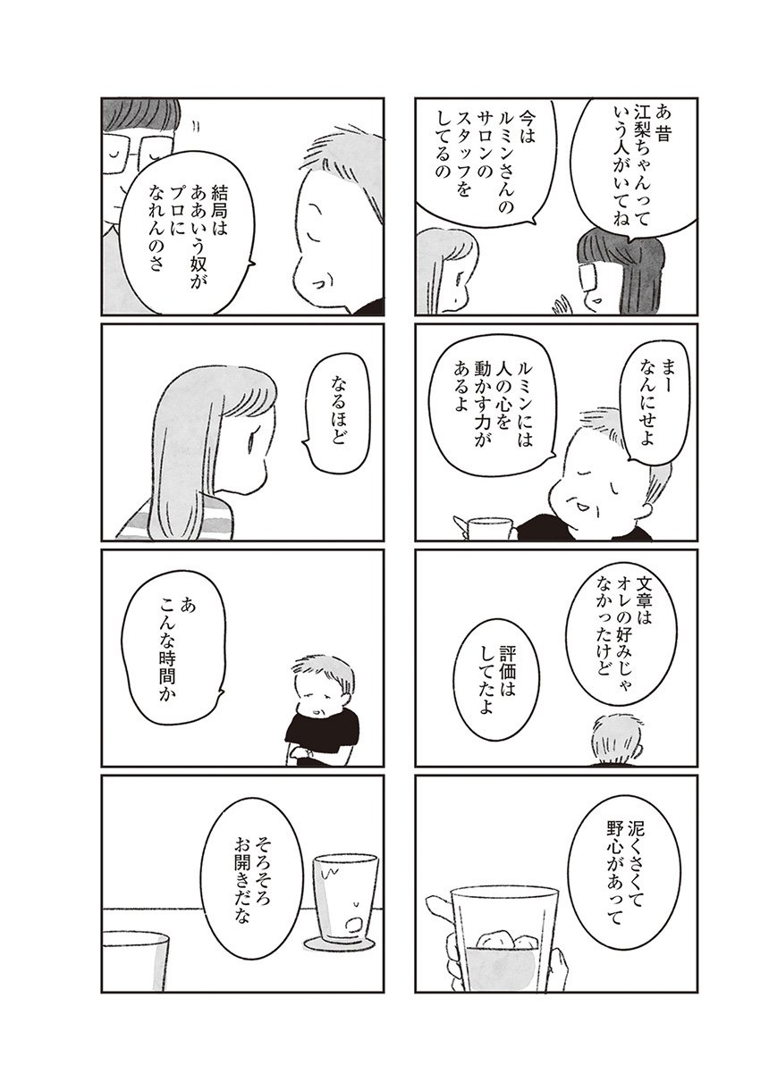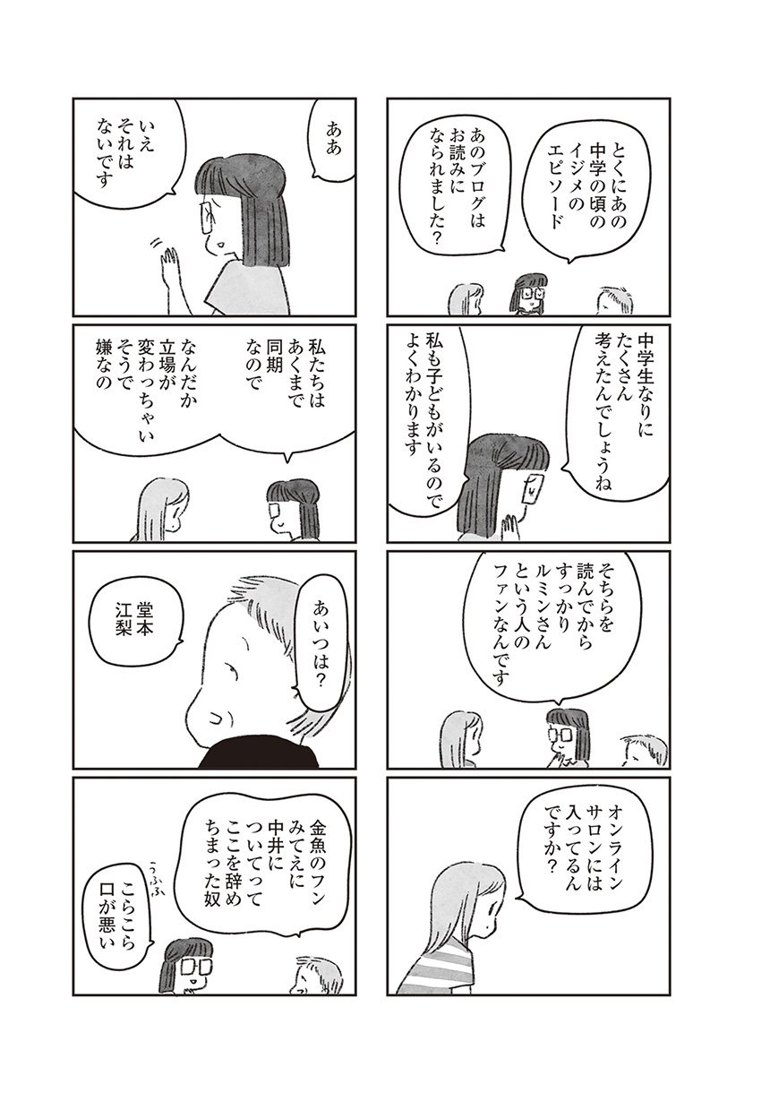 合言葉は「みんなで幸せになろう」。人気エッセイスト・中井ルミンが主宰するオンラインサロンには彼女を慕う大勢のファンが集まる。子どもの学校の担任との不和、義理の姉との確執、悩みに寄り添ってくれるルミンは尊敬できて、魅力的な存在。だけど何か違和感がある…。ルミンがブログに綴るのは、中学時代の同級生のSちゃんとの思い出。酪農家の娘Sちゃんは同級生から「牛の糞臭い」とからかわれ不登校になり、そんな同級生たちをルミンが嗜め、彼女の発案でSちゃんに手紙を渡し学校に来るようになったという話。そのブログをたまたま目にした旧友がいた。「このブログ…うそばっかり。だって沙世ちゃんあの次の日、自殺未遂を起こしたのに…」。サロンのメンバー、同級生や元夫、仕事仲間、ルミンをめぐる様々な人の思惑と言い分が交錯するミステリーコミックエッセイ。彼女は「いい人」? それとも「悪魔」? 本当のことを言っているのは一体誰なのか―――!?