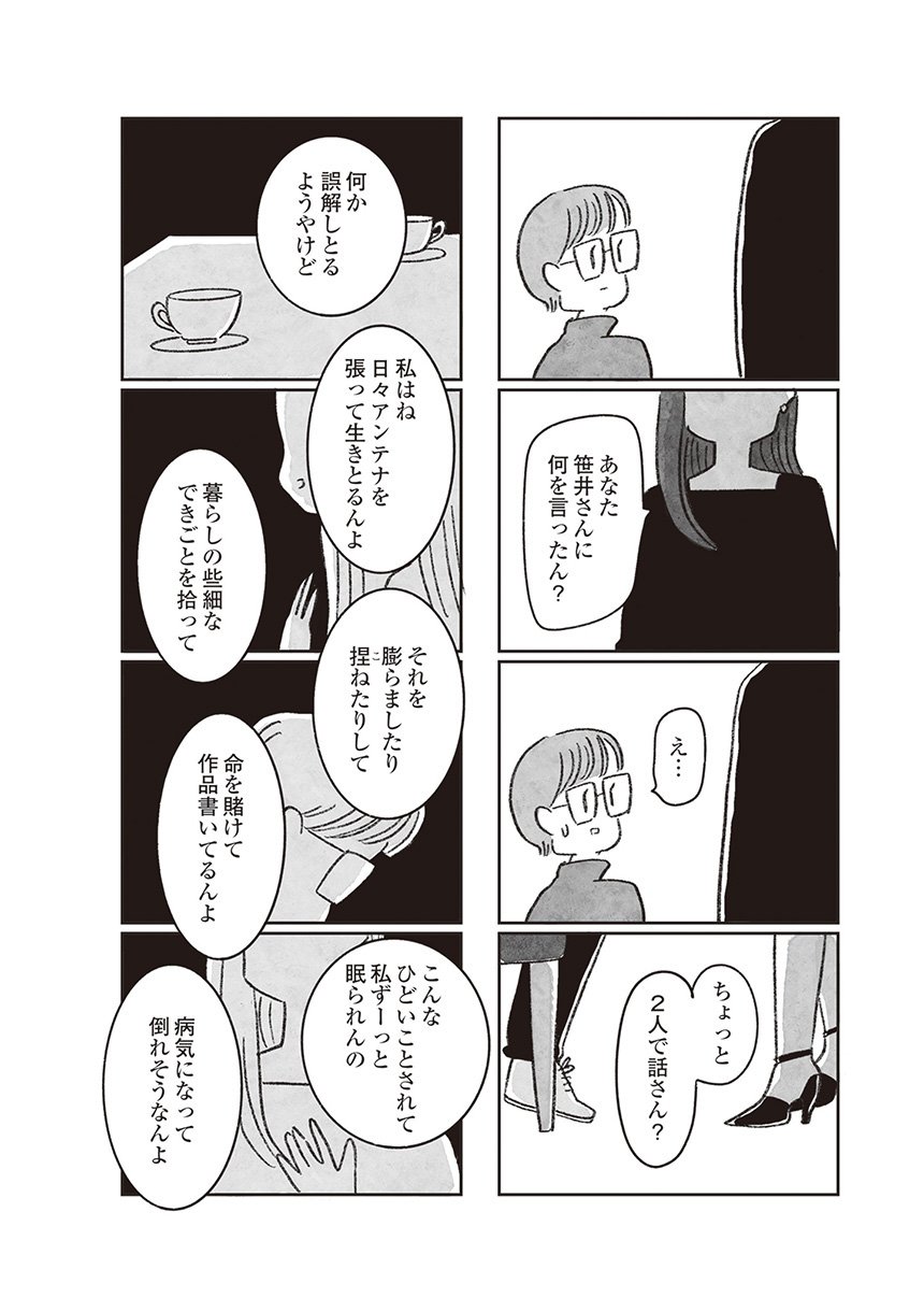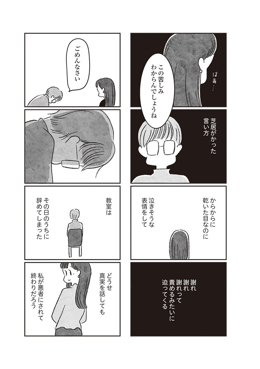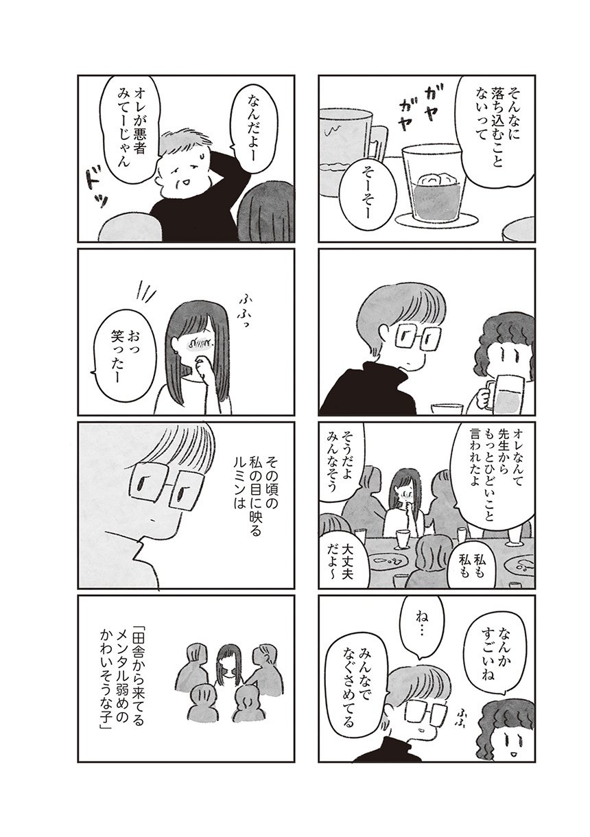 合言葉は「みんなで幸せになろう」。人気エッセイスト・中井ルミンが主宰するオンラインサロンには彼女を慕う大勢のファンが集まる。子どもの学校の担任との不和、義理の姉との確執、悩みに寄り添ってくれるルミンは尊敬できて、魅力的な存在。だけど何か違和感がある…。ルミンがブログに綴るのは、中学時代の同級生のSちゃんとの思い出。酪農家の娘Sちゃんは同級生から「牛の糞臭い」とからかわれ不登校になり、そんな同級生たちをルミンが嗜め、彼女の発案でSちゃんに手紙を渡し学校に来るようになったという話。そのブログをたまたま目にした旧友がいた。「このブログ…うそばっかり。だって沙世ちゃんあの次の日、自殺未遂を起こしたのに…」。サロンのメンバー、同級生や元夫、仕事仲間、ルミンをめぐる様々な人の思惑と言い分が交錯するミステリーコミックエッセイ。彼女は「いい人」? それとも「悪魔」? 本当のことを言っているのは一体誰なのか―――!?