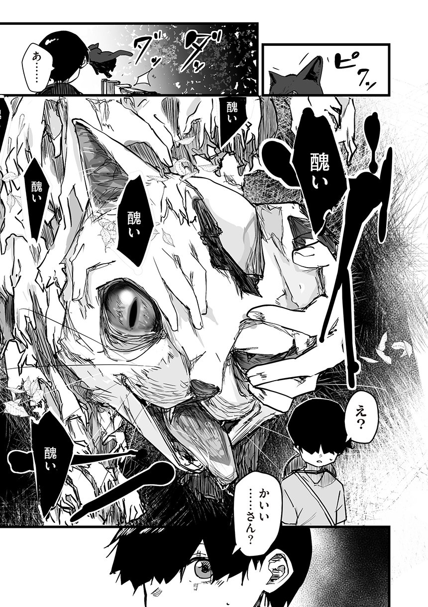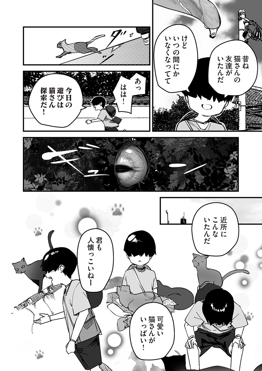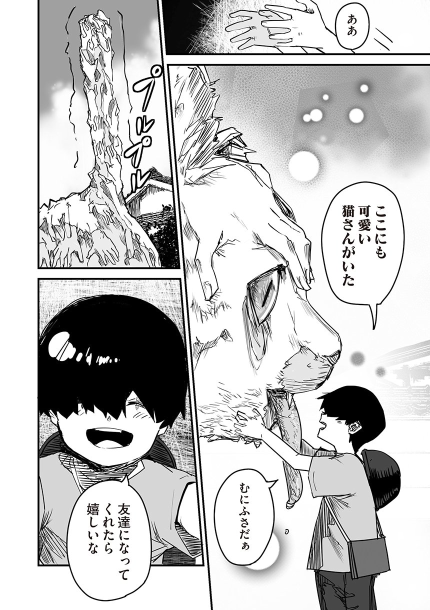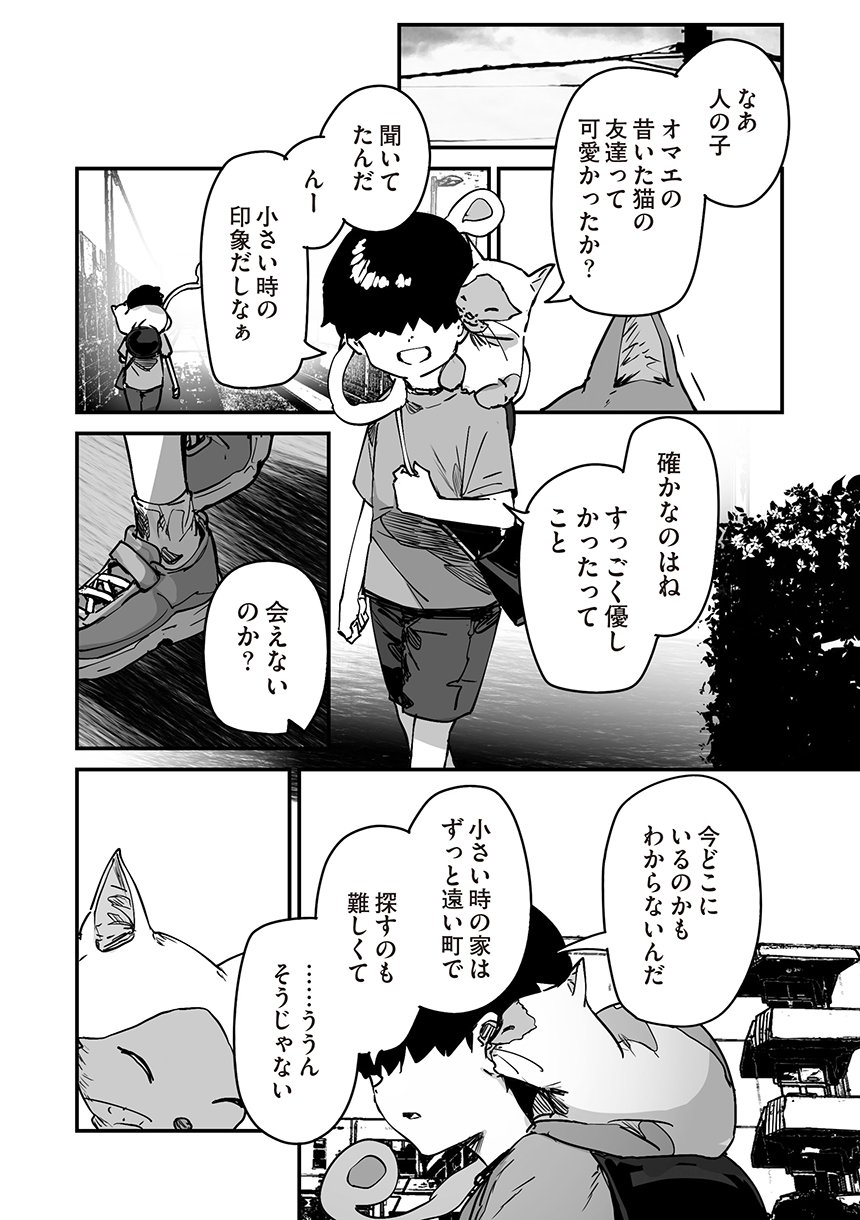 化け猫のミコは怪異が見える少年と出会う。両親を亡くして引き取られた先で暮らす少年の孤独を埋めるように友好を深めていくミコであったが、人間でないが故に本当の家族になってあげることは叶わなかった。