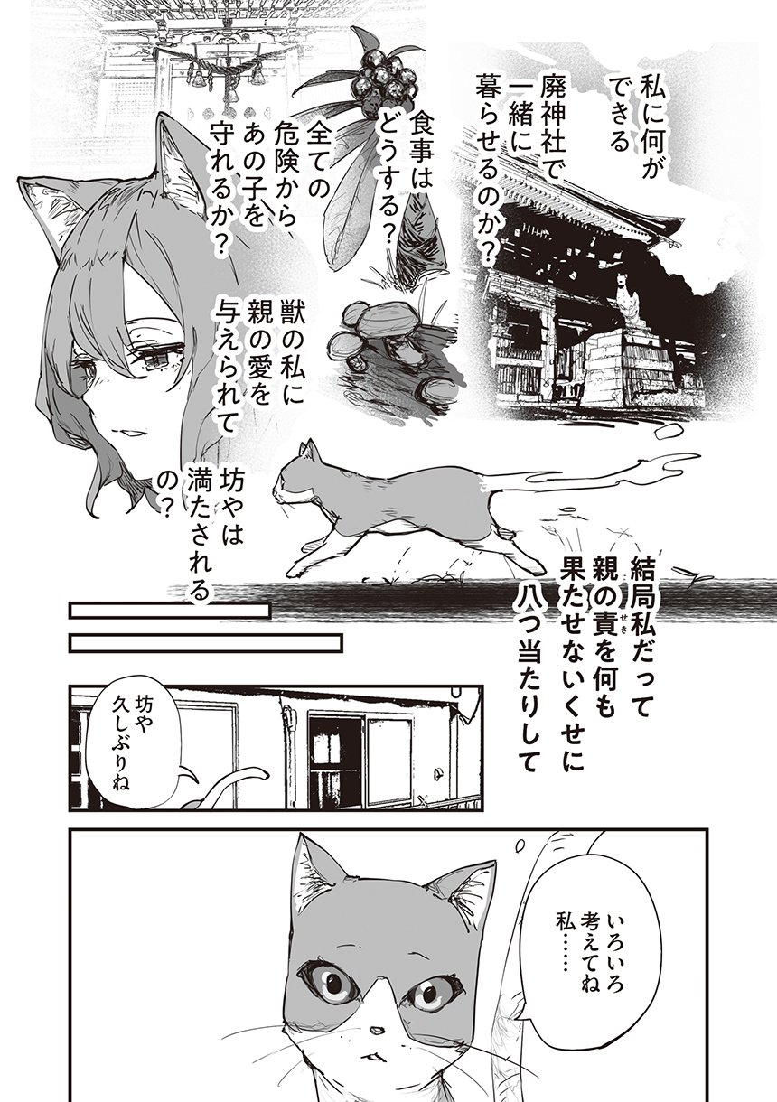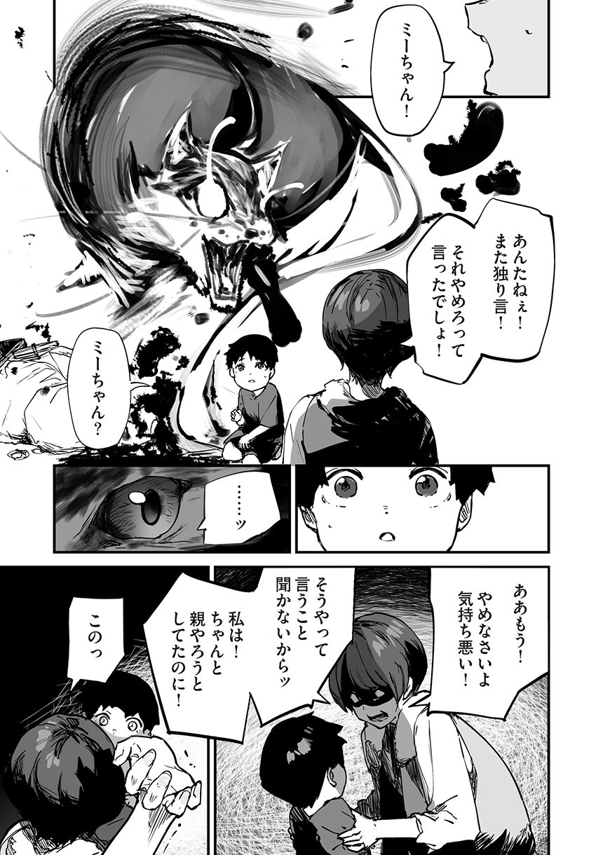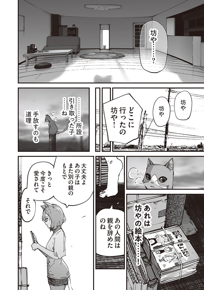 化け猫のミコは怪異が見える少年と出会う。両親を亡くして引き取られた先で暮らす少年の孤独を埋めるように友好を深めていくミコであったが、人間でないが故に本当の家族になってあげることは叶わなかった。