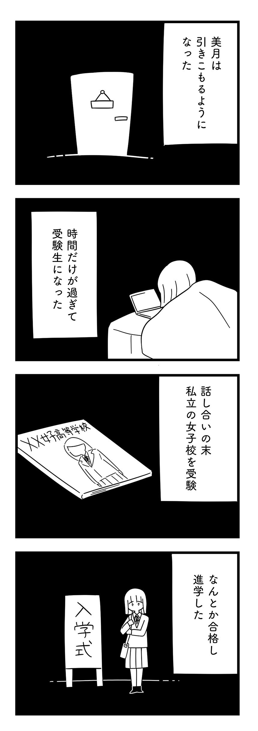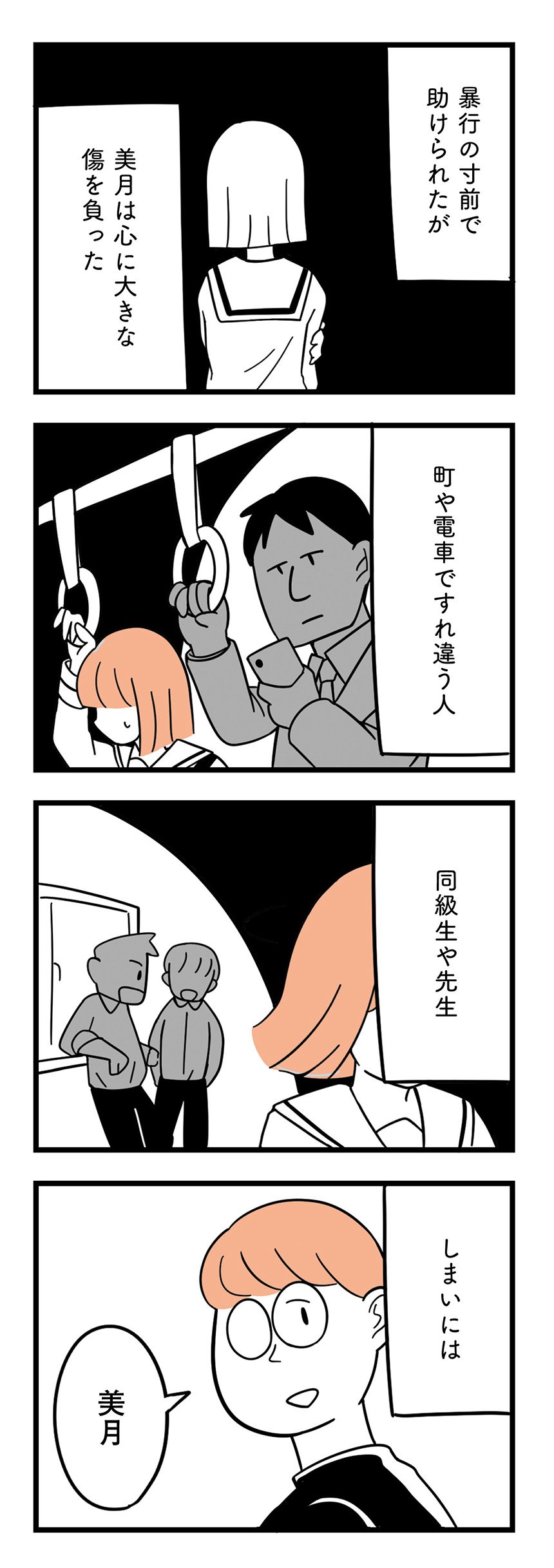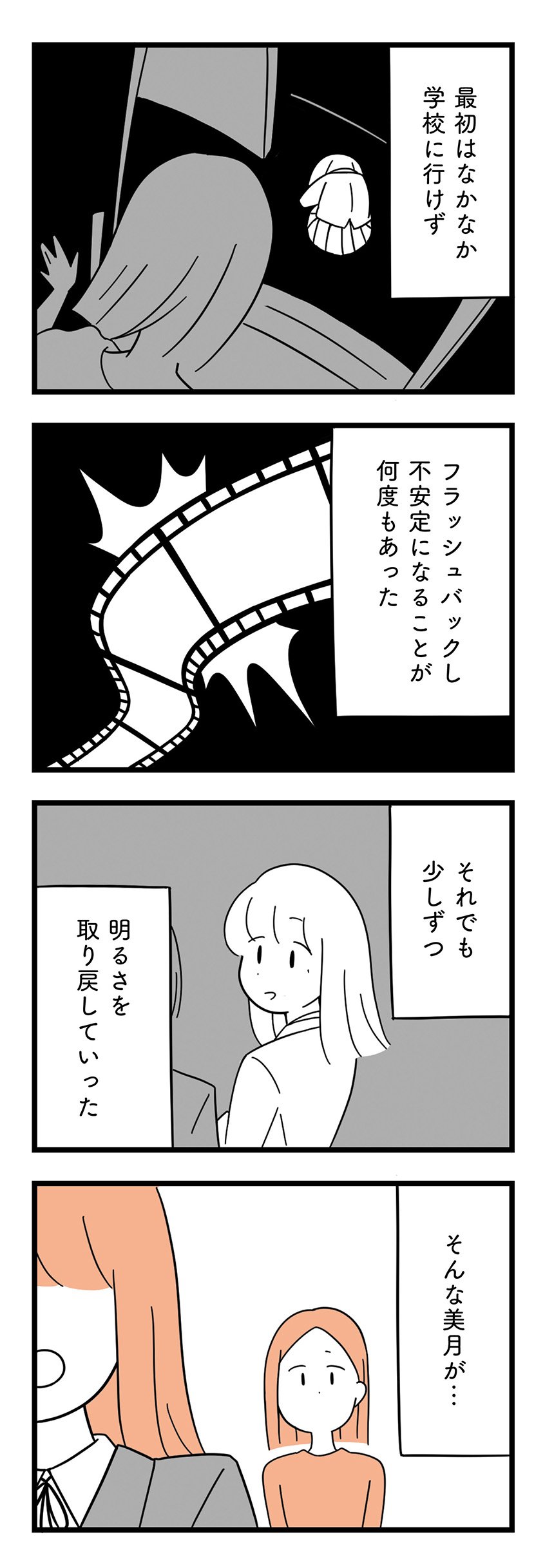 美月はかつてストーカー被害に遭い、男性恐怖症になった過去があり、彼氏ができたことを知った優子は感慨にふける。