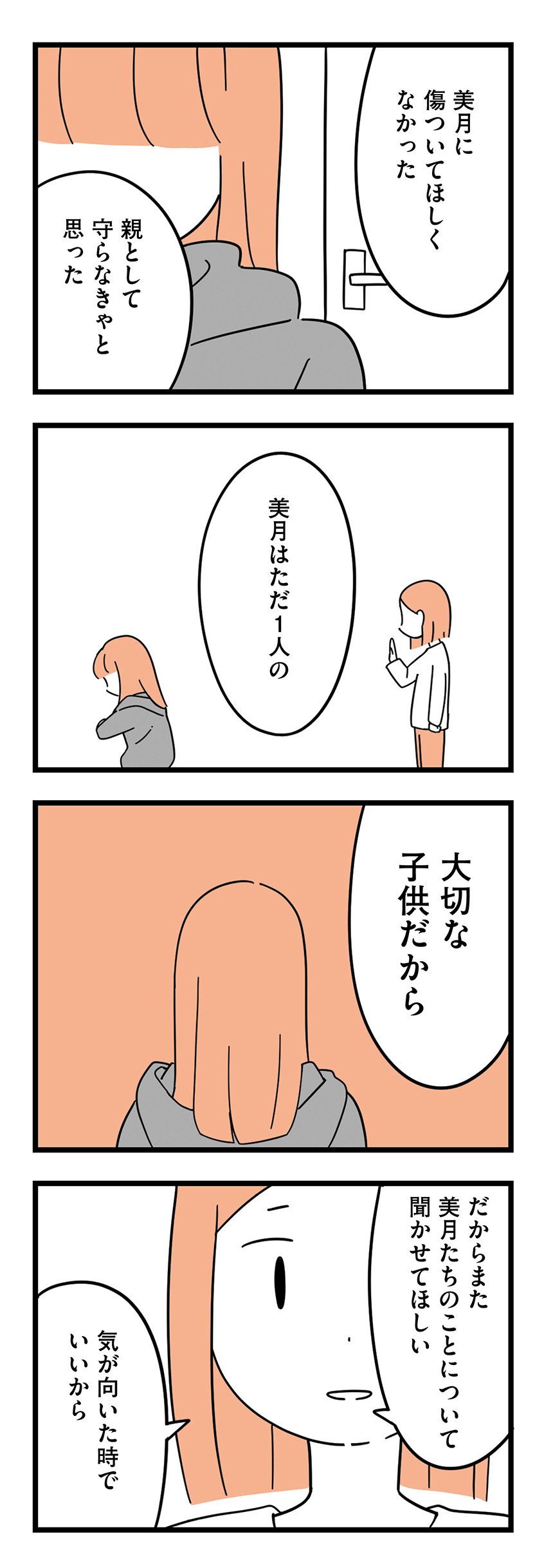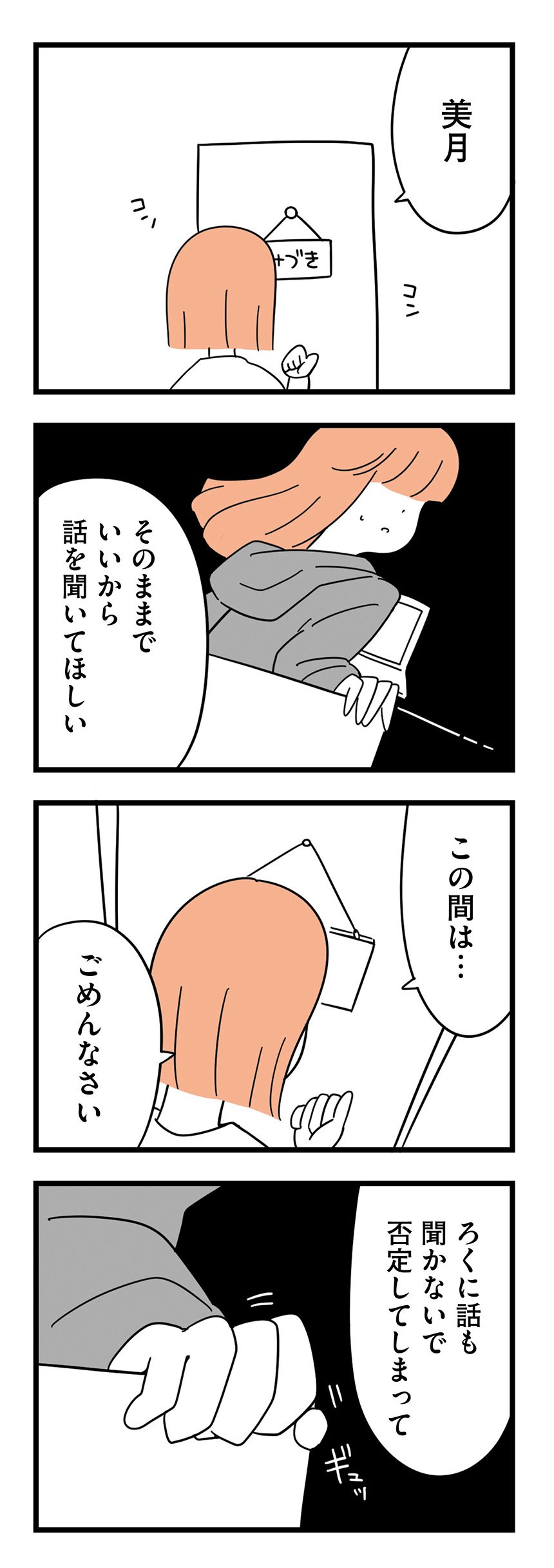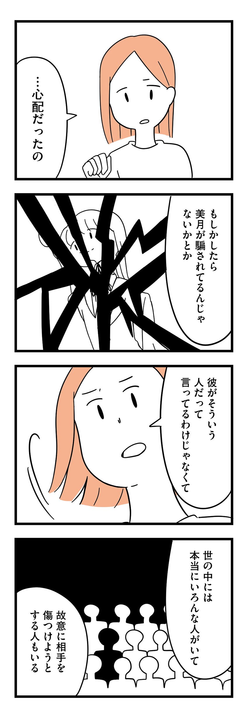 美月はかつてストーカー被害に遭い、男性恐怖症になった過去があり、彼氏ができたことを知った優子は感慨にふける。