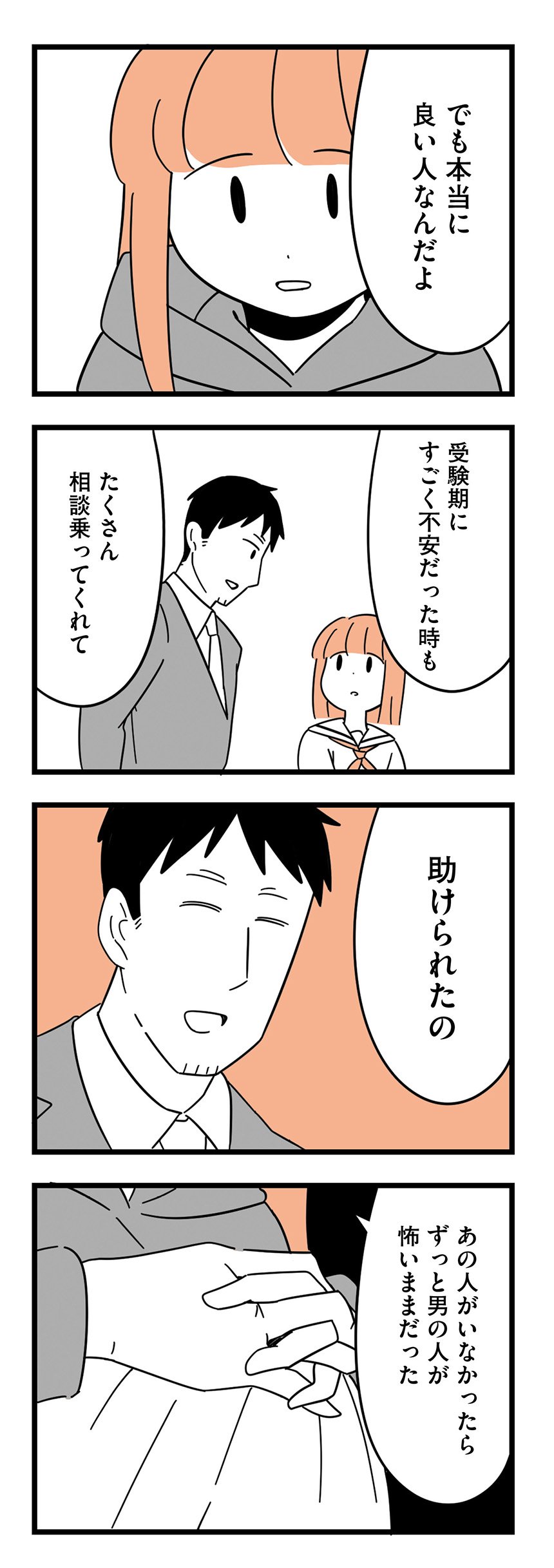 美月はかつてストーカー被害に遭い、男性恐怖症になった過去があり、彼氏ができたことを知った優子は感慨にふける。