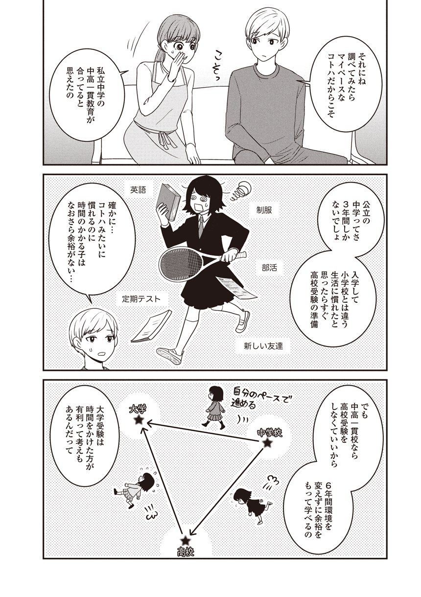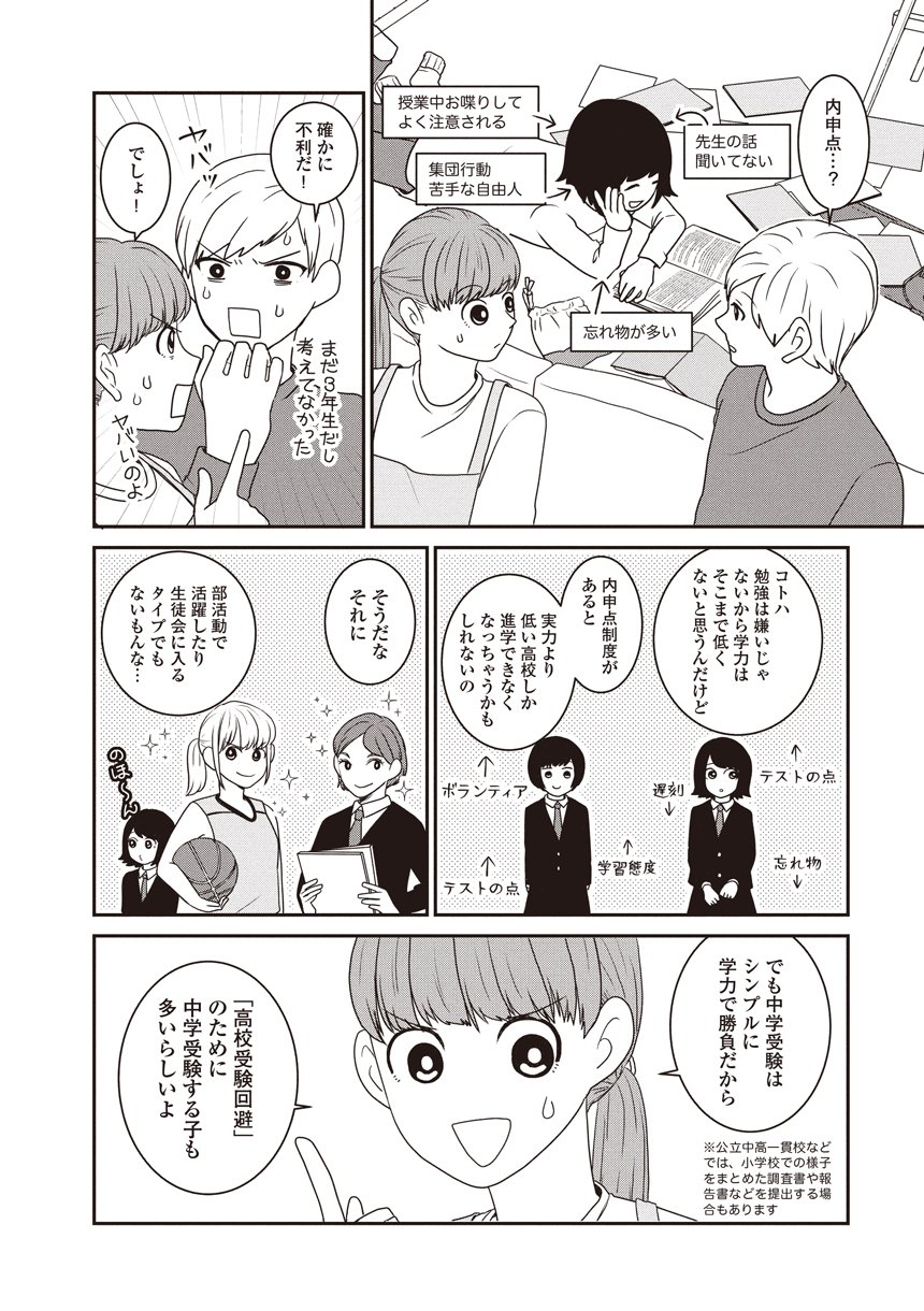 ひとりひとり異なる特性を持つ4人の子どもたちと家族が、「受験を決意した理由」「塾選び」「学校選び」「勉強方法」「発達障害の診断を受けるか(薬を服用して受験に臨むか)」「緊張の合否」「受験した学校へ進学して感じたこと」などテーマごとに、向き合った壁や大切にしたことなどを描きます。マンガの間には、医師の視点&中学受験専門家の視点で、親の不安を解決するコラムも充実。