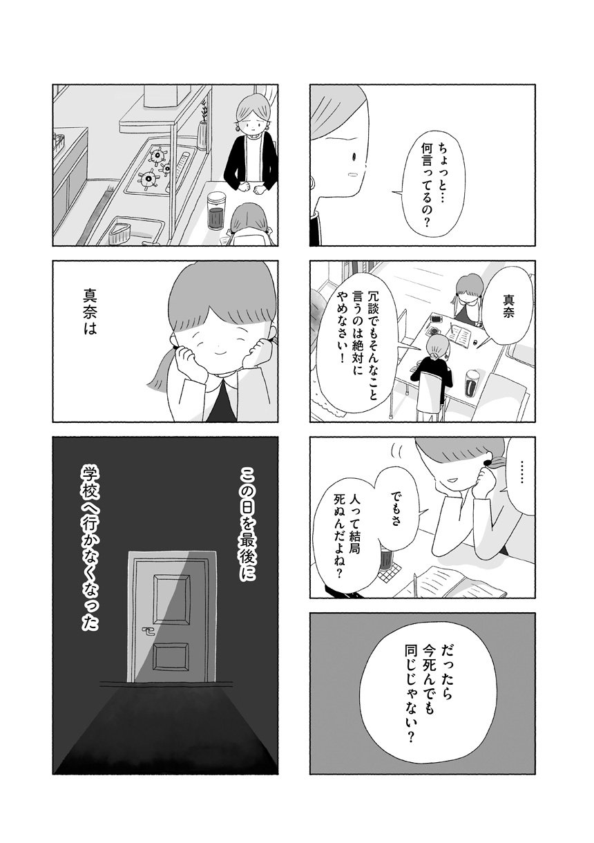 そう呟いた小学5年生で一人娘の真奈は、その日を境に学校へ行かなくなってしまった。成績も良く、友達もたくさんいて、親とも良好な関係を築いていた娘がなぜ、突然休むようになってしまったのか? その理由は、担任の教師と面談をしても、真奈の親友のママ友と話しても、わからなくなっていくばかりだった。友達が家を訪ねてきたのをきっかけに、一度は学校へ行くことができた真奈だったが、帰宅するなり自室にこもると、暴言まで吐くようになってしまう。理解していたはずの娘の気持ちが掴めず、様々な解決策を試すものの事態は悪化の一途をたどる。いったい娘になにがあったのか――。
