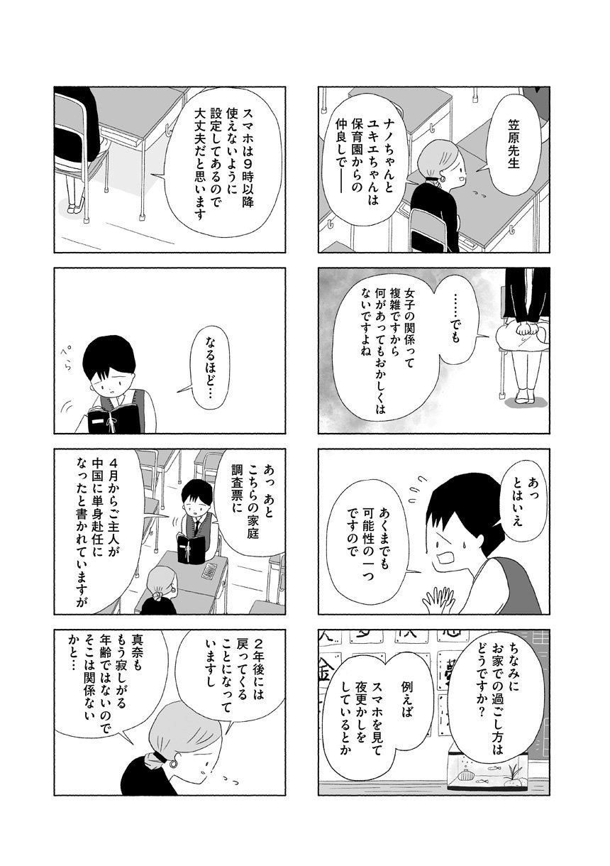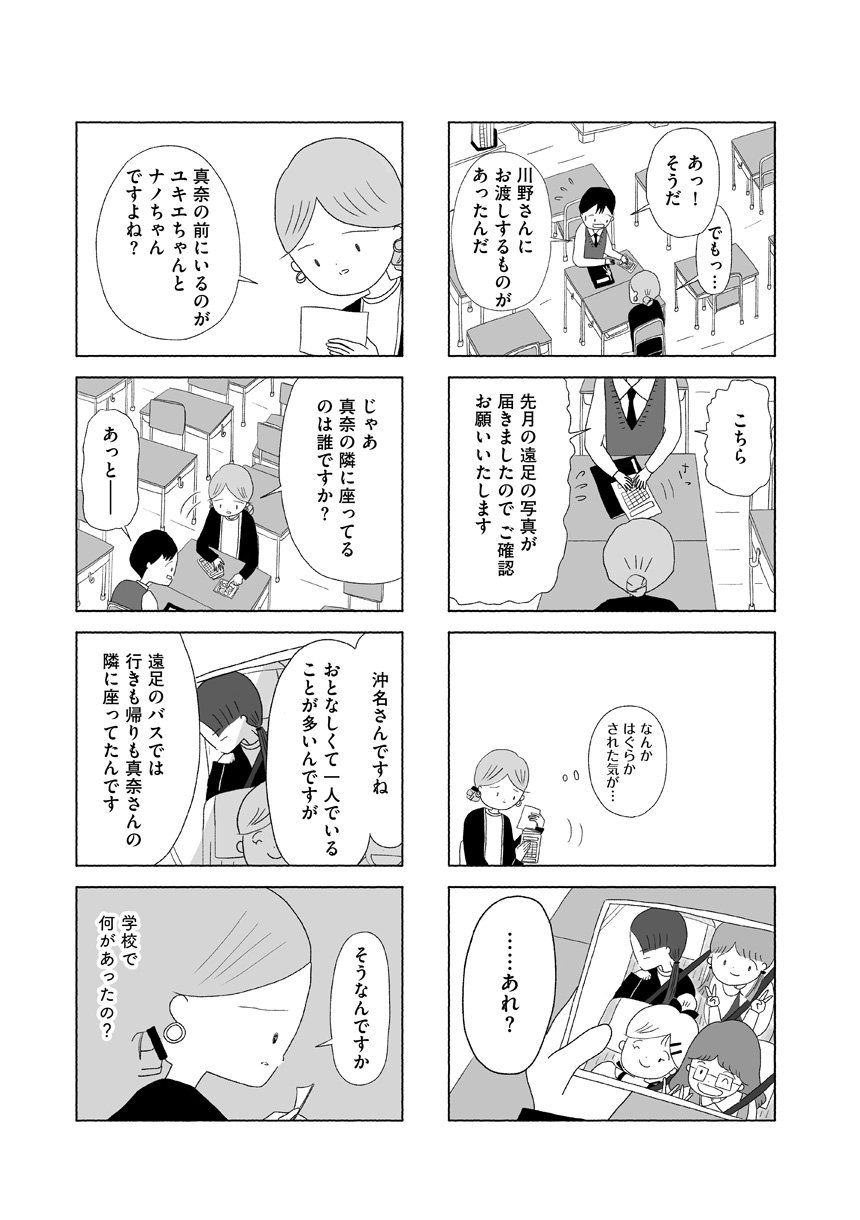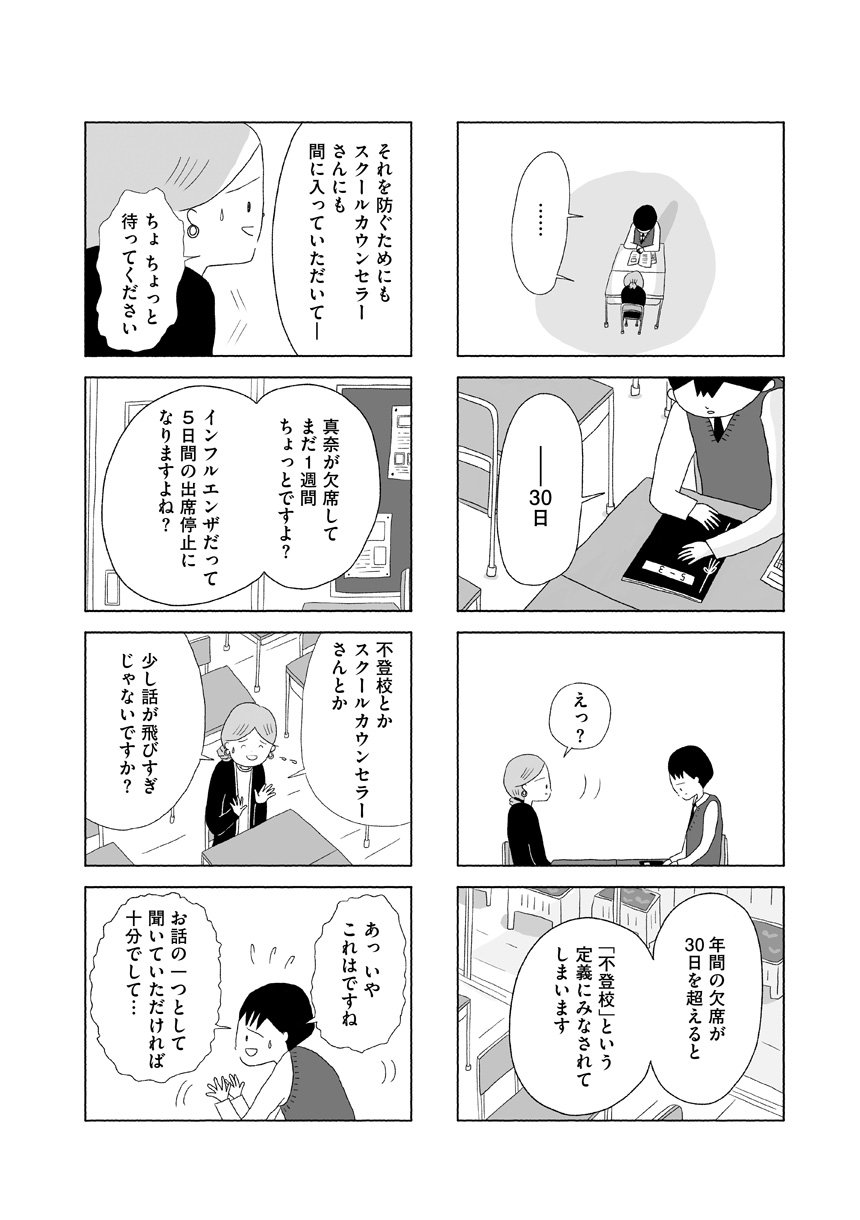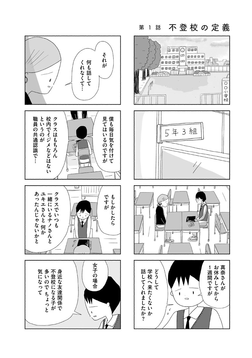 そう呟いた小学5年生で一人娘の真奈は、その日を境に学校へ行かなくなってしまった。成績も良く、友達もたくさんいて、親とも良好な関係を築いていた娘がなぜ、突然休むようになってしまったのか? その理由は、担任の教師と面談をしても、真奈の親友のママ友と話しても、わからなくなっていくばかりだった。友達が家を訪ねてきたのをきっかけに、一度は学校へ行くことができた真奈だったが、帰宅するなり自室にこもると、暴言まで吐くようになってしまう。理解していたはずの娘の気持ちが掴めず、様々な解決策を試すものの事態は悪化の一途をたどる。いったい娘になにがあったのか――。