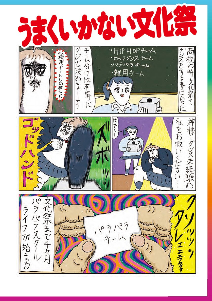 貧乏すぎてコップがすべてワンカップの空き瓶だった幼少時代、抜いても抜いても生えてくる福毛の話、ギガサイズ化した友達の金魚の話など、すべてどうでもいいのに泣くほど笑えて元気が出るエピソード満載。著者のつたない記憶とオリジナリティあふれる解釈で描いた「おむすびころりん」「ジャックと豆の木」など、「テキトーだけど泣くほど笑える! カッラフルなむっっかし話」も特別収録。疲れた心にぶっっ刺さる! いろんなことがどうでもよくなる全部実話のコミックエッセイ!!