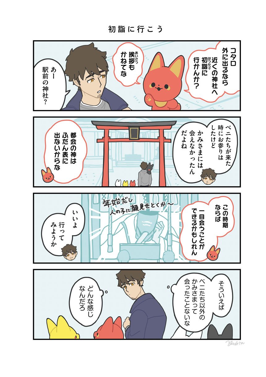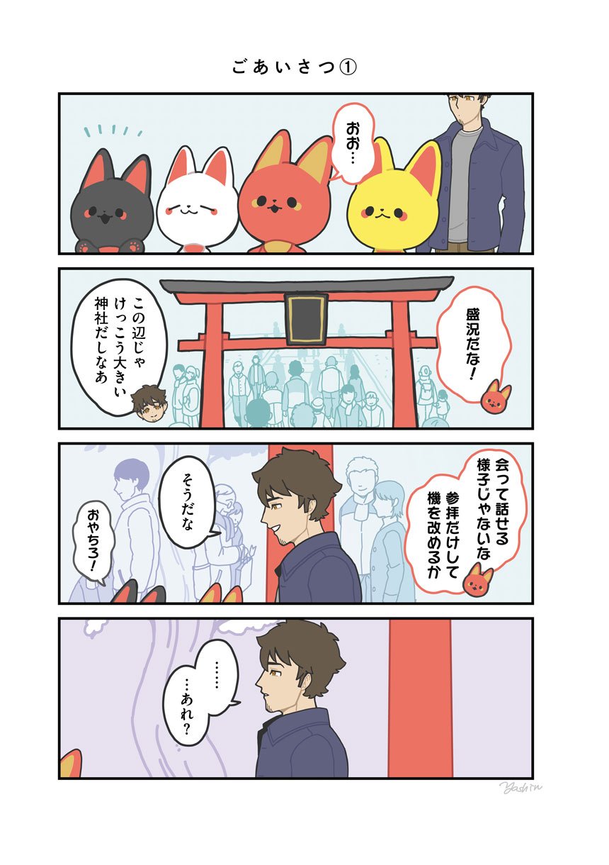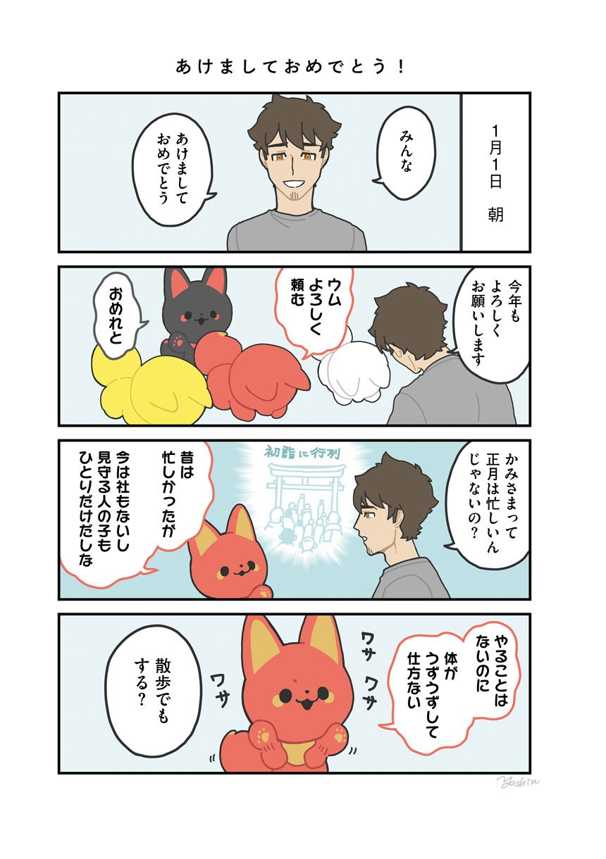 32歳サラリーマンのコタローは4柱のかみさまキツネたちと暮らしています。商売繁盛を司るおしゃべりなベニ、五穀豊穣を司る頑固なキン、悪疫退散を司る照れ屋なシロ、開運招福を司る幼げなクロと個性豊かなかみさまたちに加えて、最近は猫又のスミハチも家に遊びに来るようになりました。初詣から節分、お花見と季節の行事をかみさまたちと過ごしてく中で、また新しい人外たちとの出会いが訪れます。描き下ろしエピソードとしてスミハチの過去編を収録!