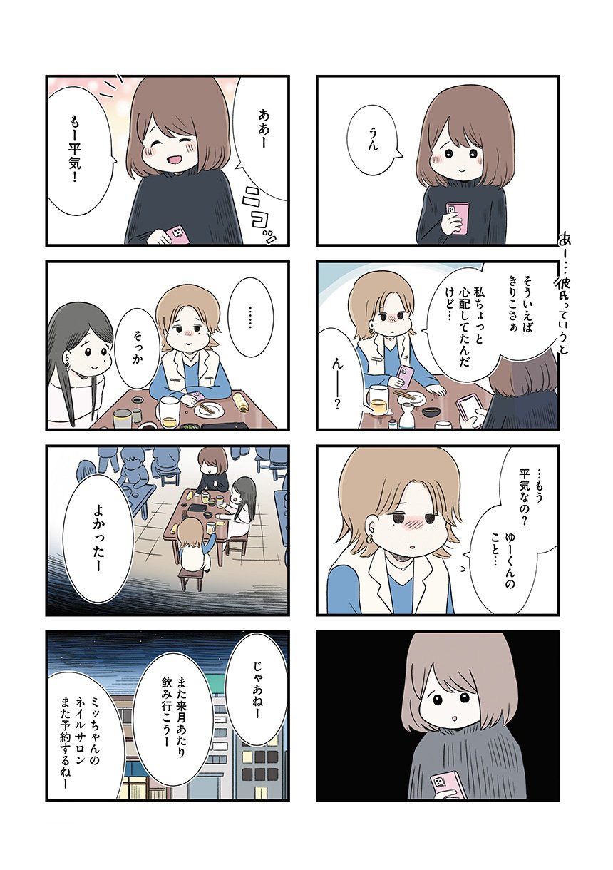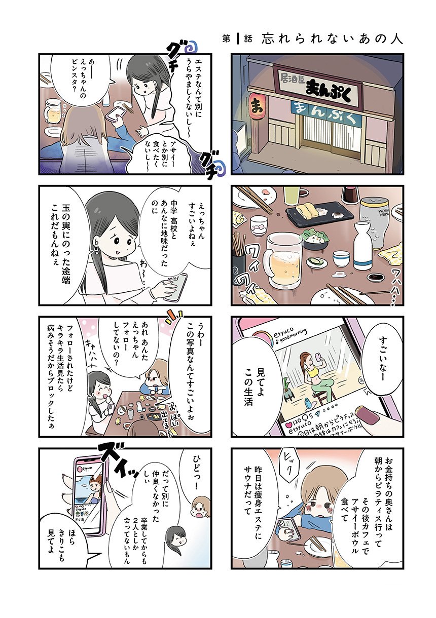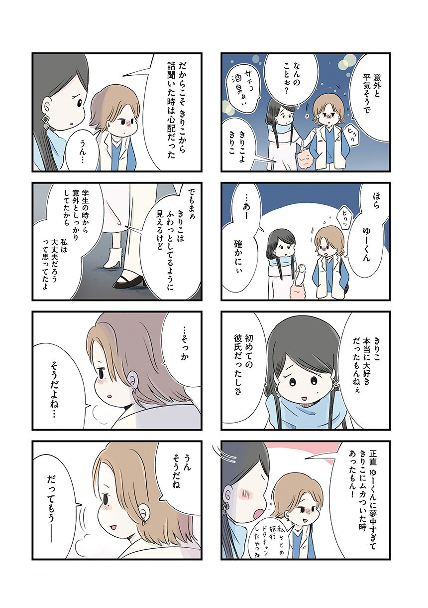 大学時代にできた初彼氏ゆうだいに別れを告げられて1年、きりこは彼への気持ちを手放せずにいた。それどころか、架空のなりすましアカウントを使ってゆうだいの裏アカをチェックするのが唯一の楽しみで、日々の些細な動向に一喜一憂する毎日を送っていた。そんななか、ひょんなことから再びゆうだいと連絡を取りはじめ、一緒にご飯に行くことに。「私たちなら、きっとまた元の関係に戻れる」そう信じて、美容に洋服、お店選びもばっちりで迎えた当日、ゆうだいから新しく気になる人ができたと告げられて……。