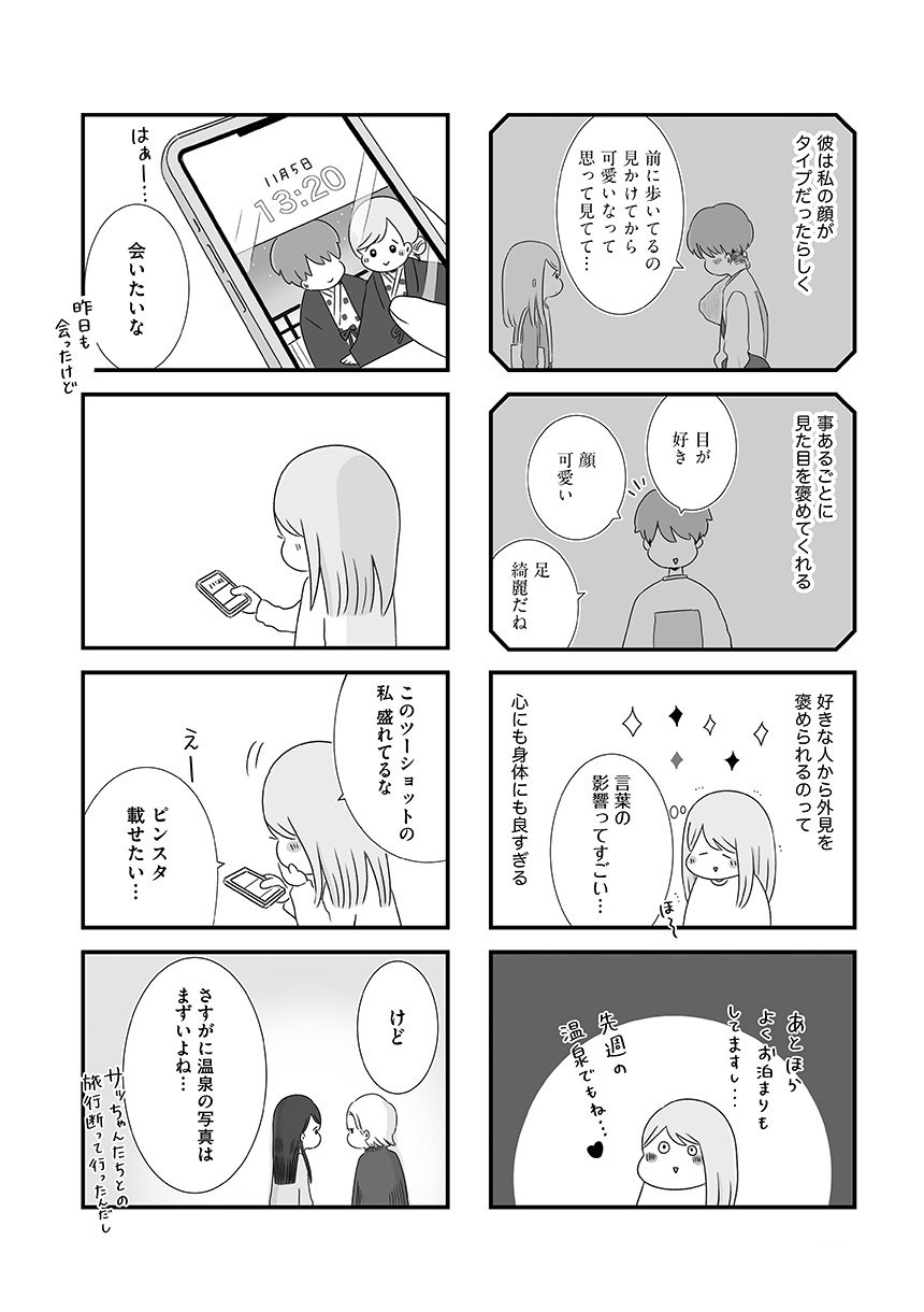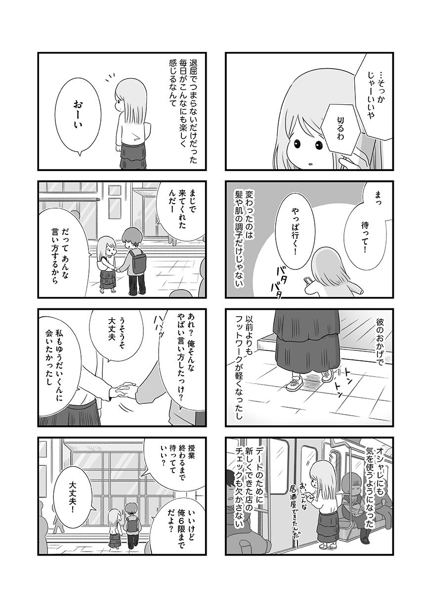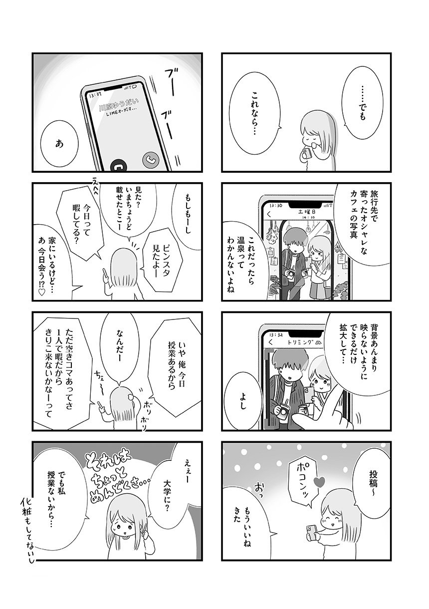 大学時代にできた初彼氏ゆうだいに別れを告げられて1年、きりこは彼への気持ちを手放せずにいた。それどころか、架空のなりすましアカウントを使ってゆうだいの裏アカをチェックするのが唯一の楽しみで、日々の些細な動向に一喜一憂する毎日を送っていた。そんななか、ひょんなことから再びゆうだいと連絡を取りはじめ、一緒にご飯に行くことに。「私たちなら、きっとまた元の関係に戻れる」そう信じて、美容に洋服、お店選びもばっちりで迎えた当日、ゆうだいから新しく気になる人ができたと告げられて……。