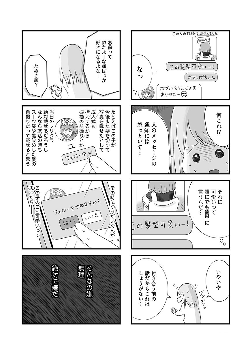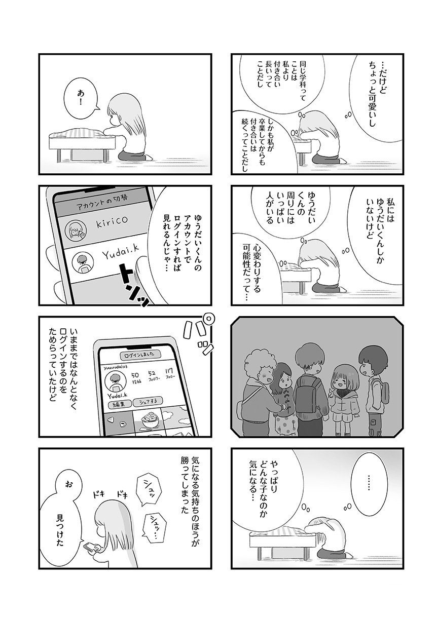 本当に好きな人にフラれたとき、あなたなら諦めることはできますか? 大学時代にできた初彼氏ゆうだいに別れを告げられて1年、きりこは彼を忘れるどころか、架空のなりすましアカウントを使って日々の動向をチェックする毎日を送っていた。そしてとうとう再会を果たしたゆうだいに告げられた一言は…。きりこの恋心は執着なのか、それとも――過剰な愛の先に待っていた、衝撃の結末!