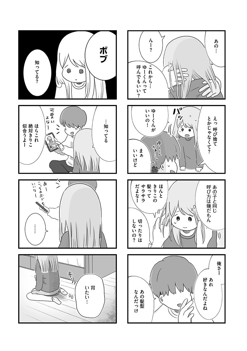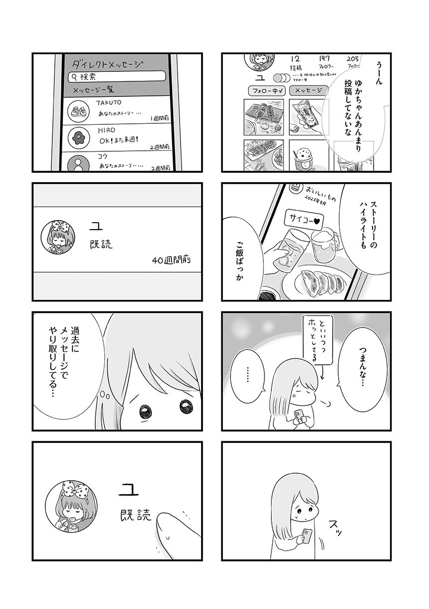 大学時代にできた初彼氏ゆうだいに別れを告げられて1年、きりこは彼への気持ちを手放せずにいた。それどころか、架空のなりすましアカウントを使ってゆうだいの裏アカをチェックするのが唯一の楽しみで、日々の些細な動向に一喜一憂する毎日を送っていた。そんななか、ひょんなことから再びゆうだいと連絡を取りはじめ、一緒にご飯に行くことに。「私たちなら、きっとまた元の関係に戻れる」そう信じて、美容に洋服、お店選びもばっちりで迎えた当日、ゆうだいから新しく気になる人ができたと告げられて……。
