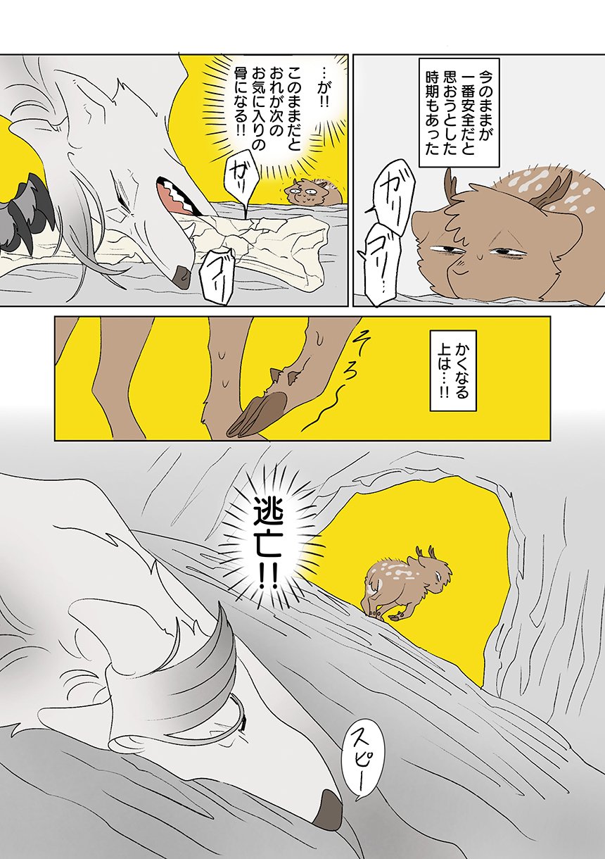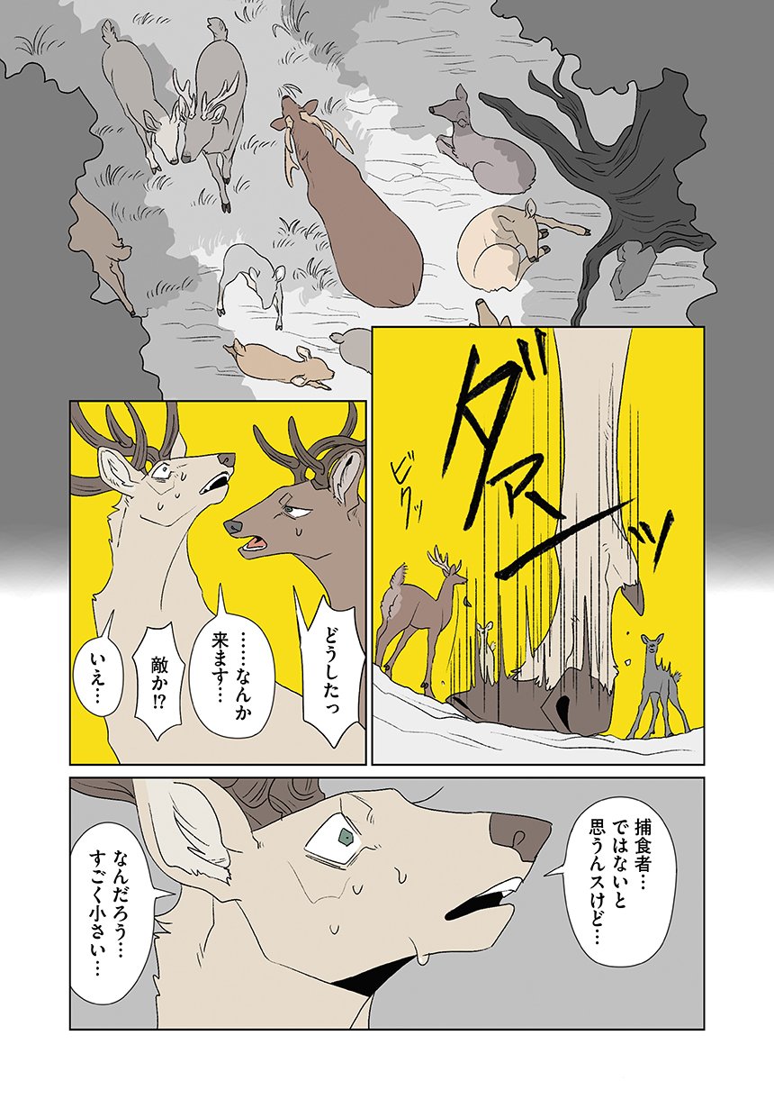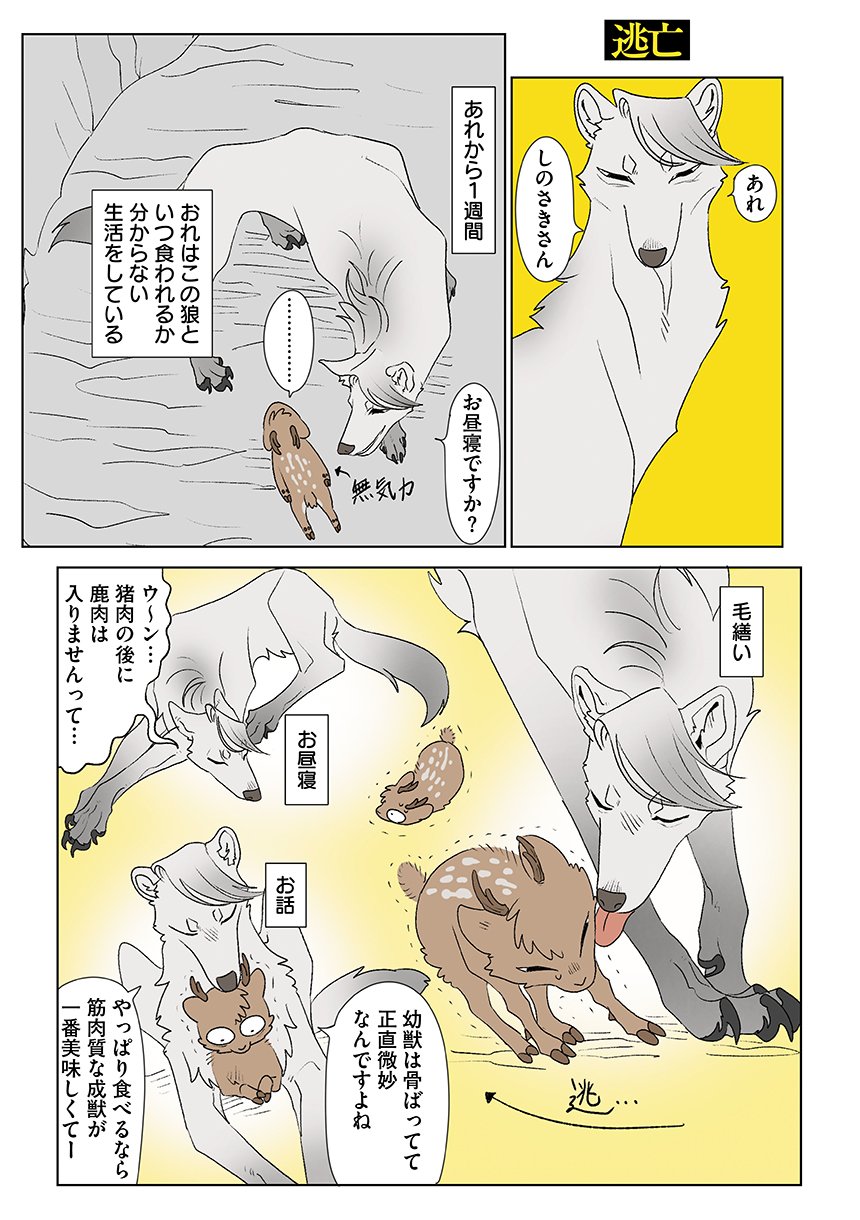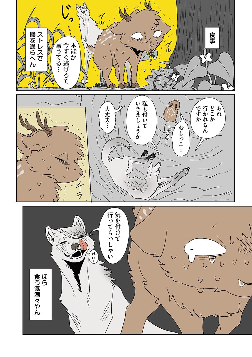 群れを追い出されたシカ・しのさきは、森で命を落としかけた瞬間、通りがかったオオカミ・みなせに救われる。