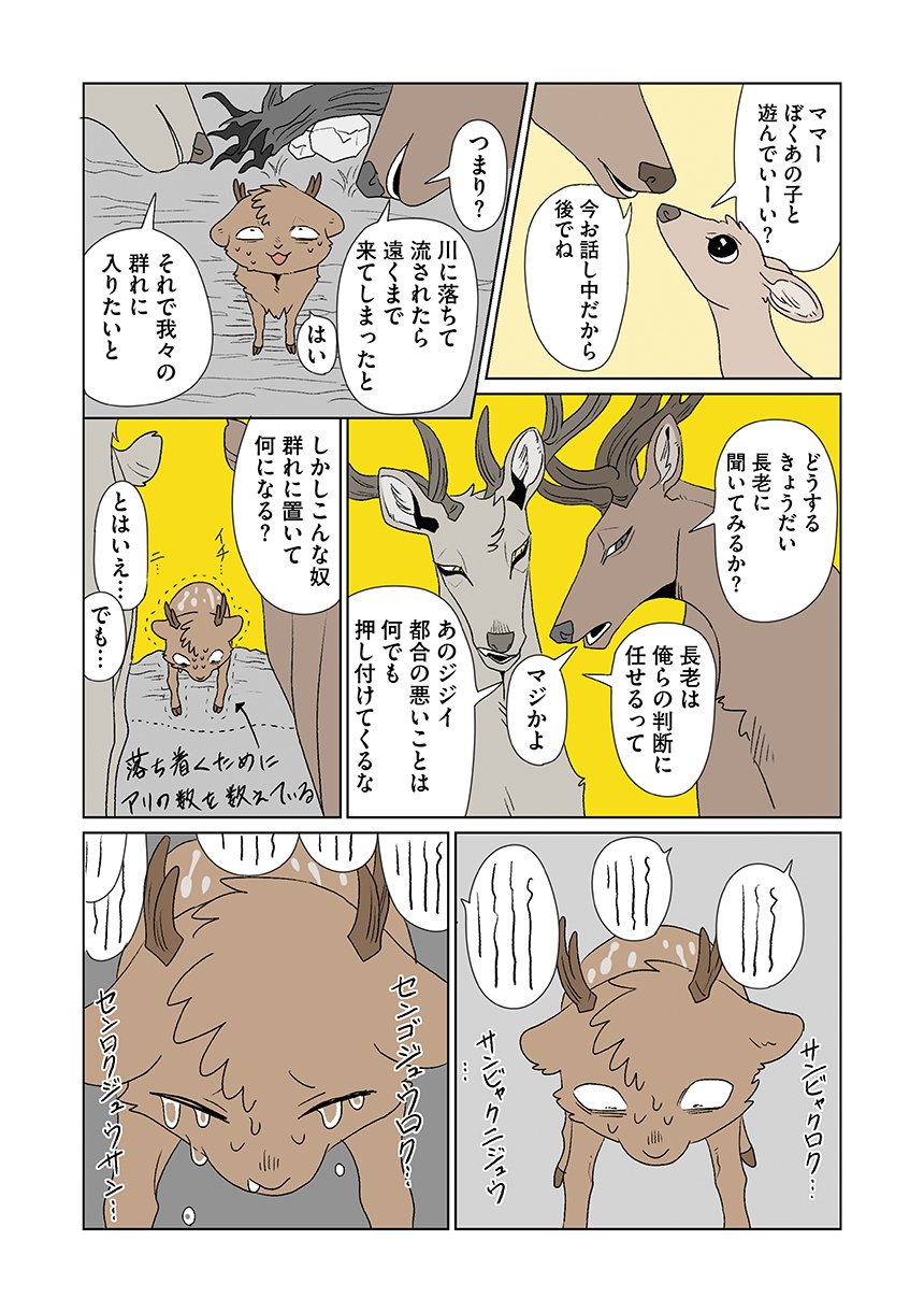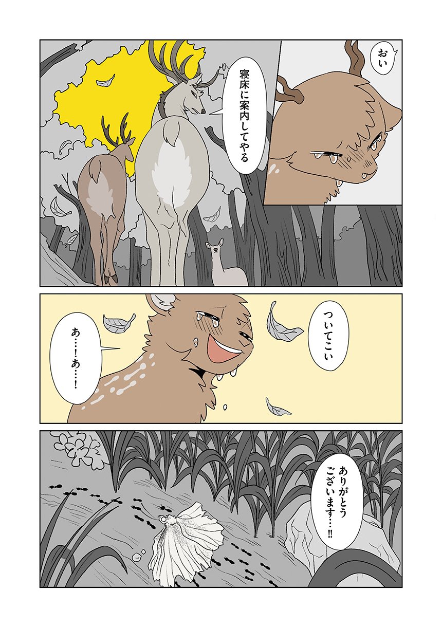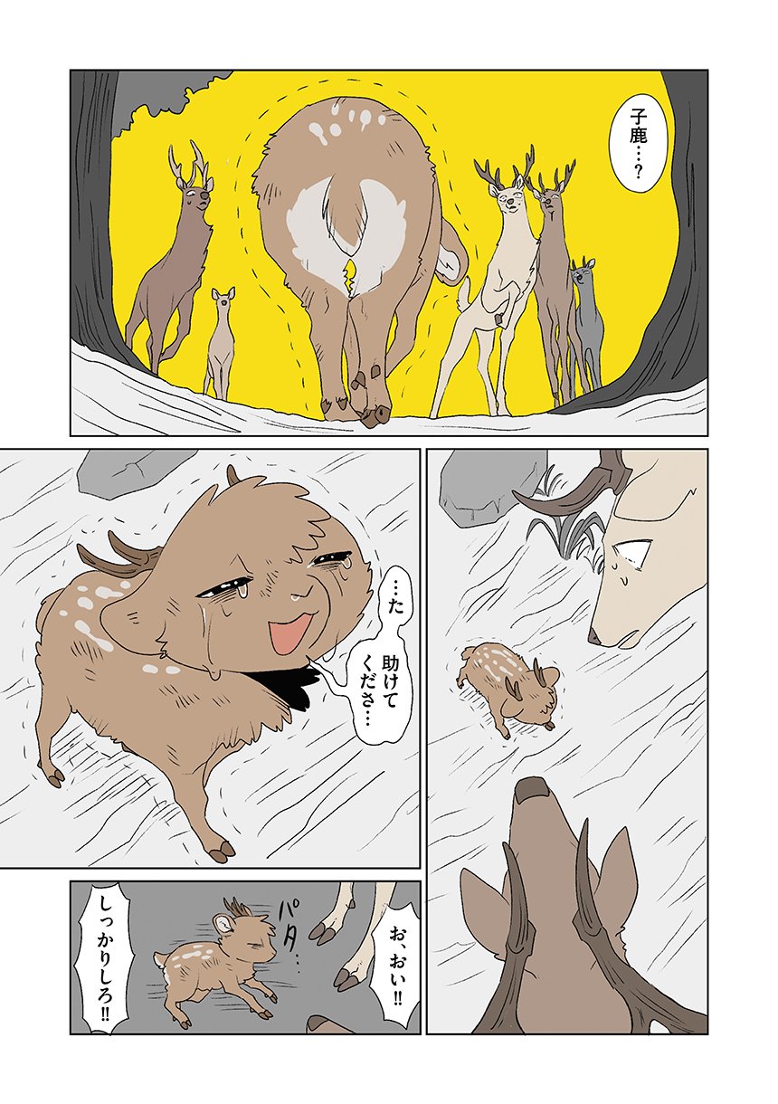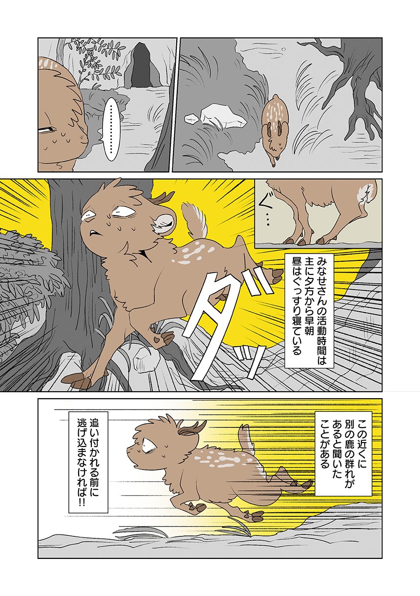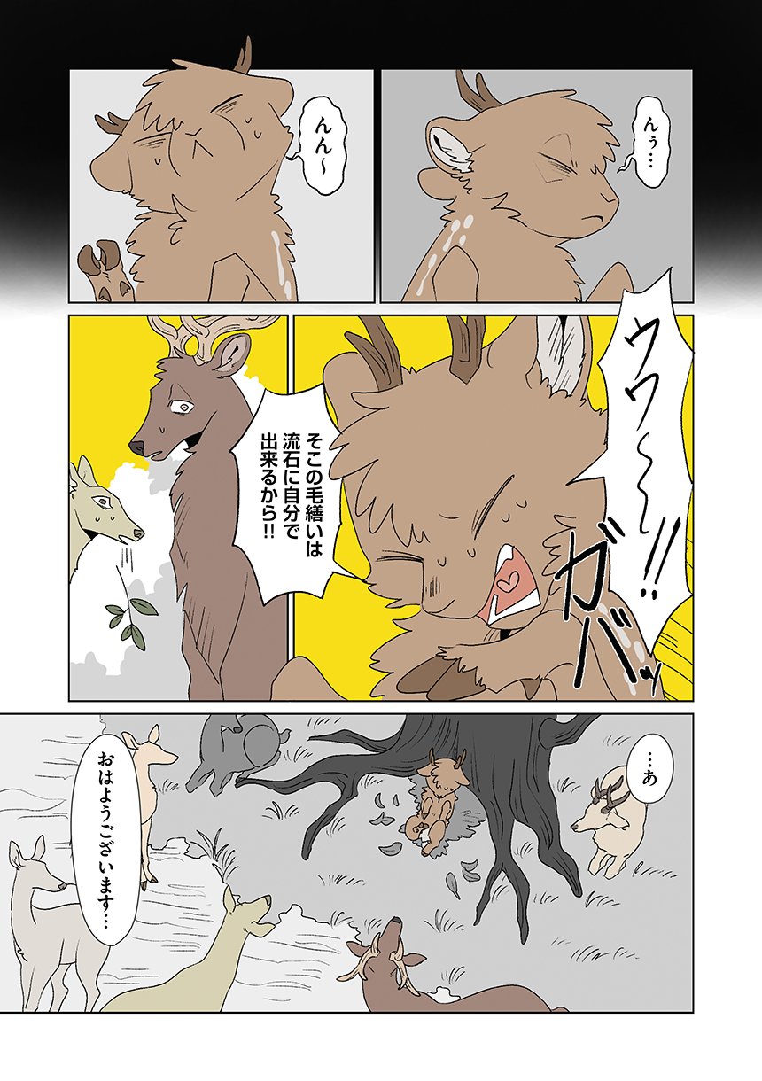 群れを追い出されたシカ・しのさきは、森で命を落としかけた瞬間、通りがかったオオカミ・みなせに救われる。