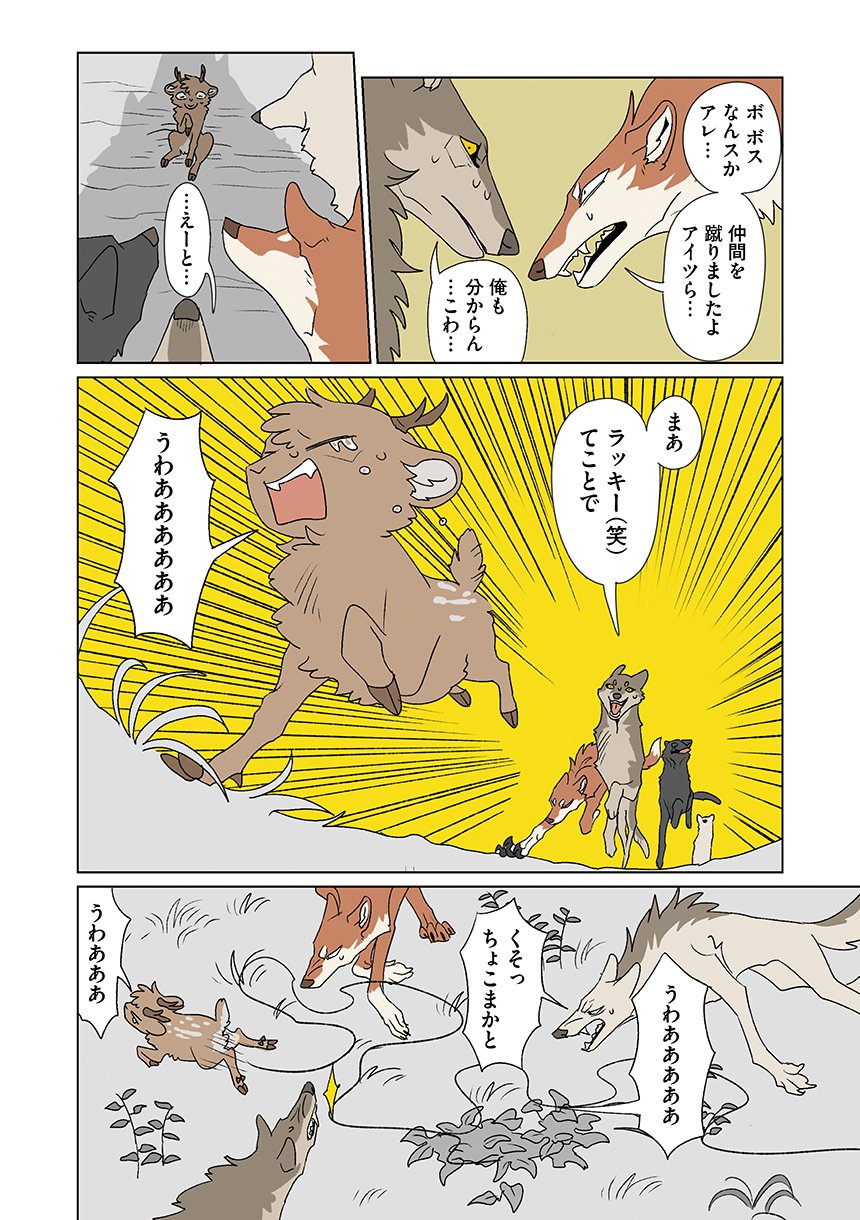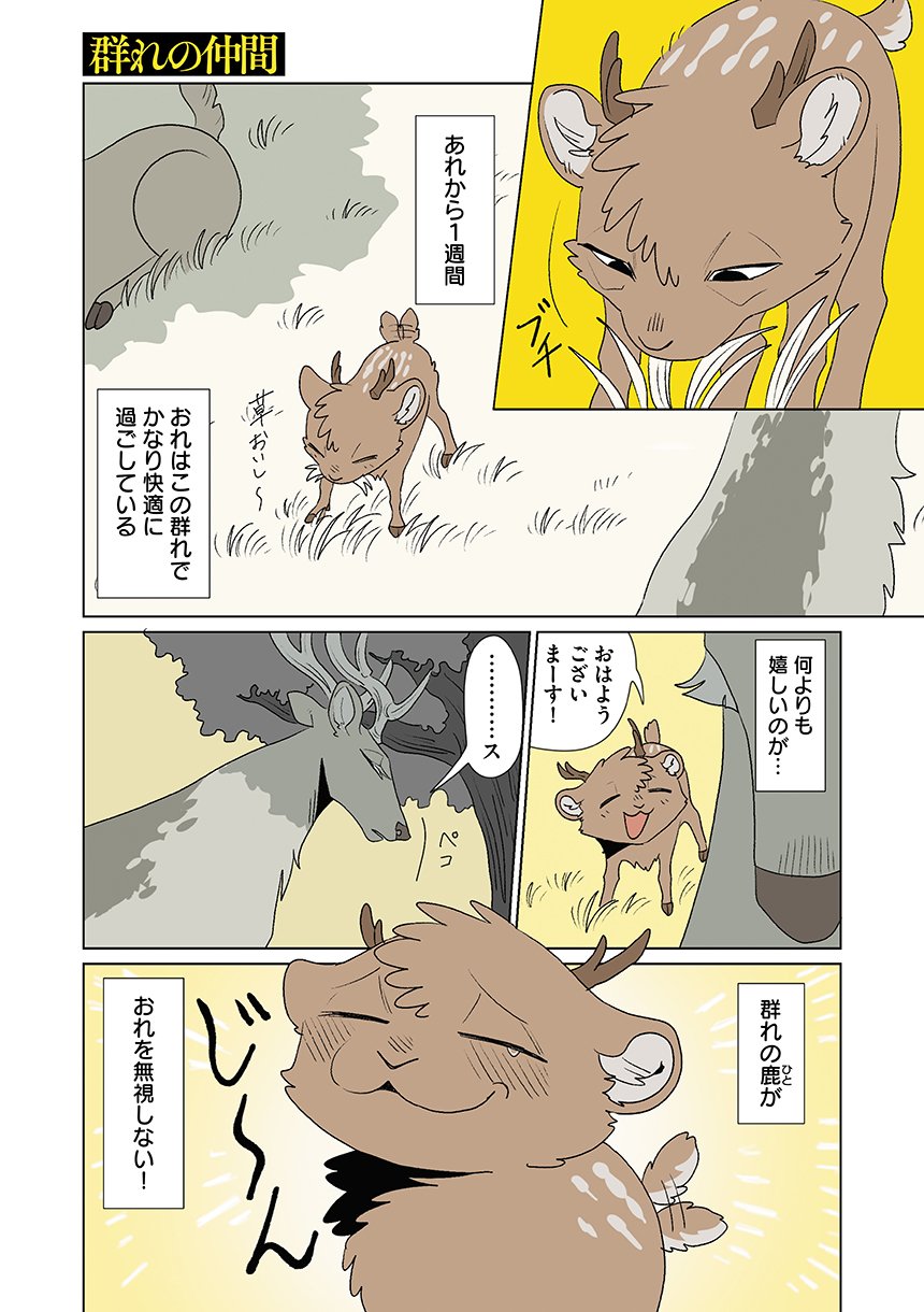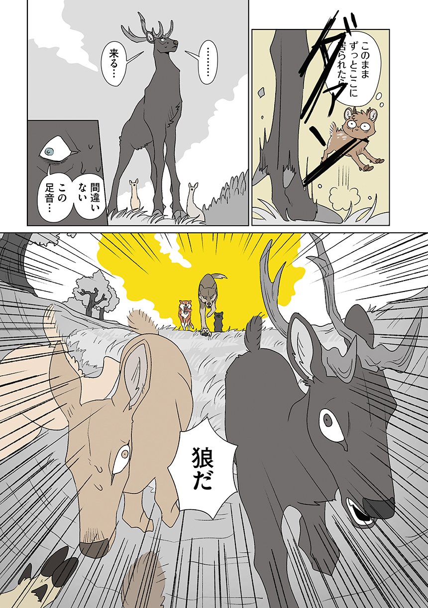 群れを追い出されたシカ・しのさきは、森で命を落としかけた瞬間、通りがかったオオカミ・みなせに救われる。