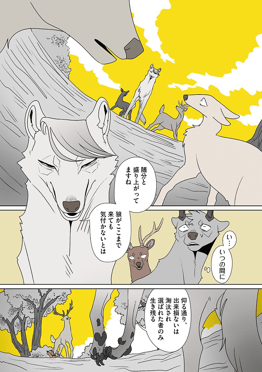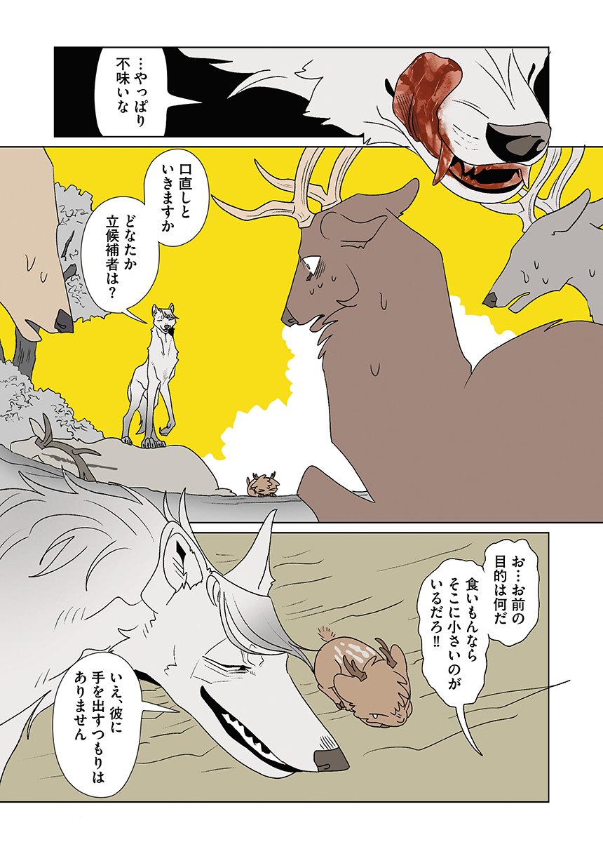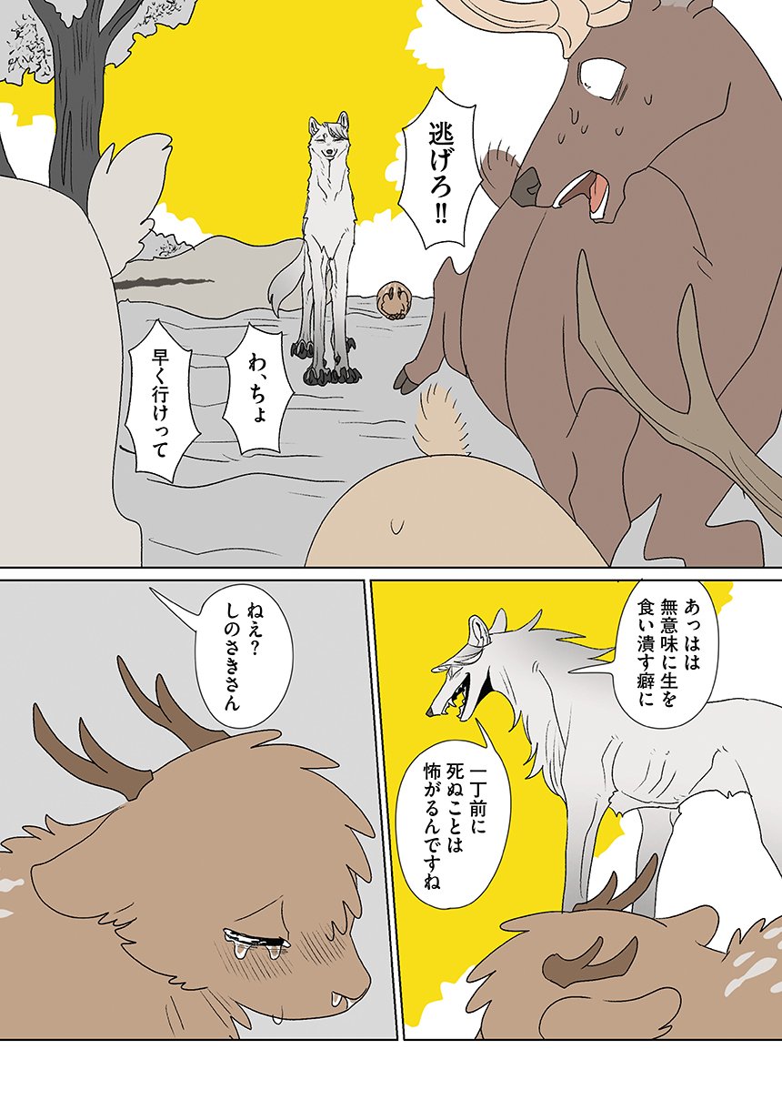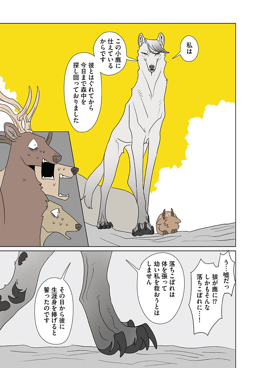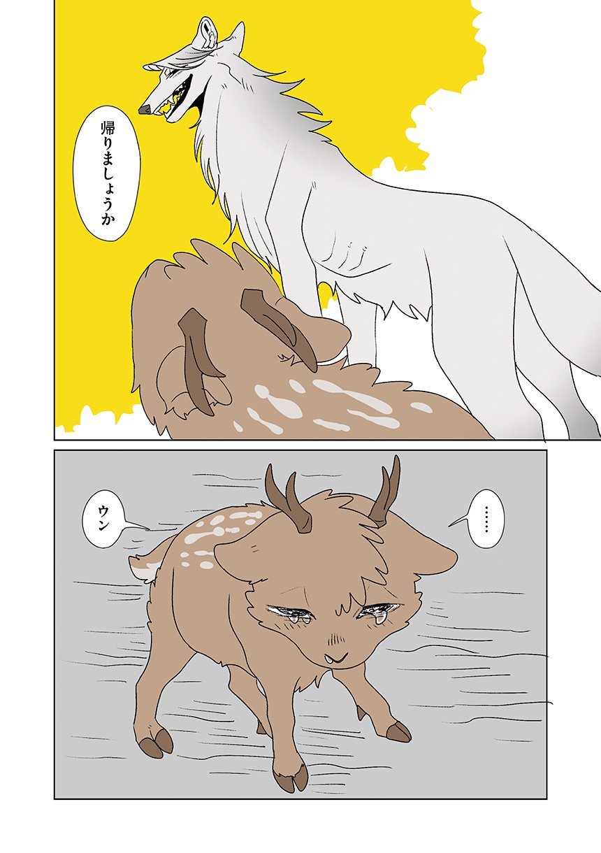 群れを追い出されたシカ・しのさきは、森で命を落としかけた瞬間、通りがかったオオカミ・みなせに救われる。