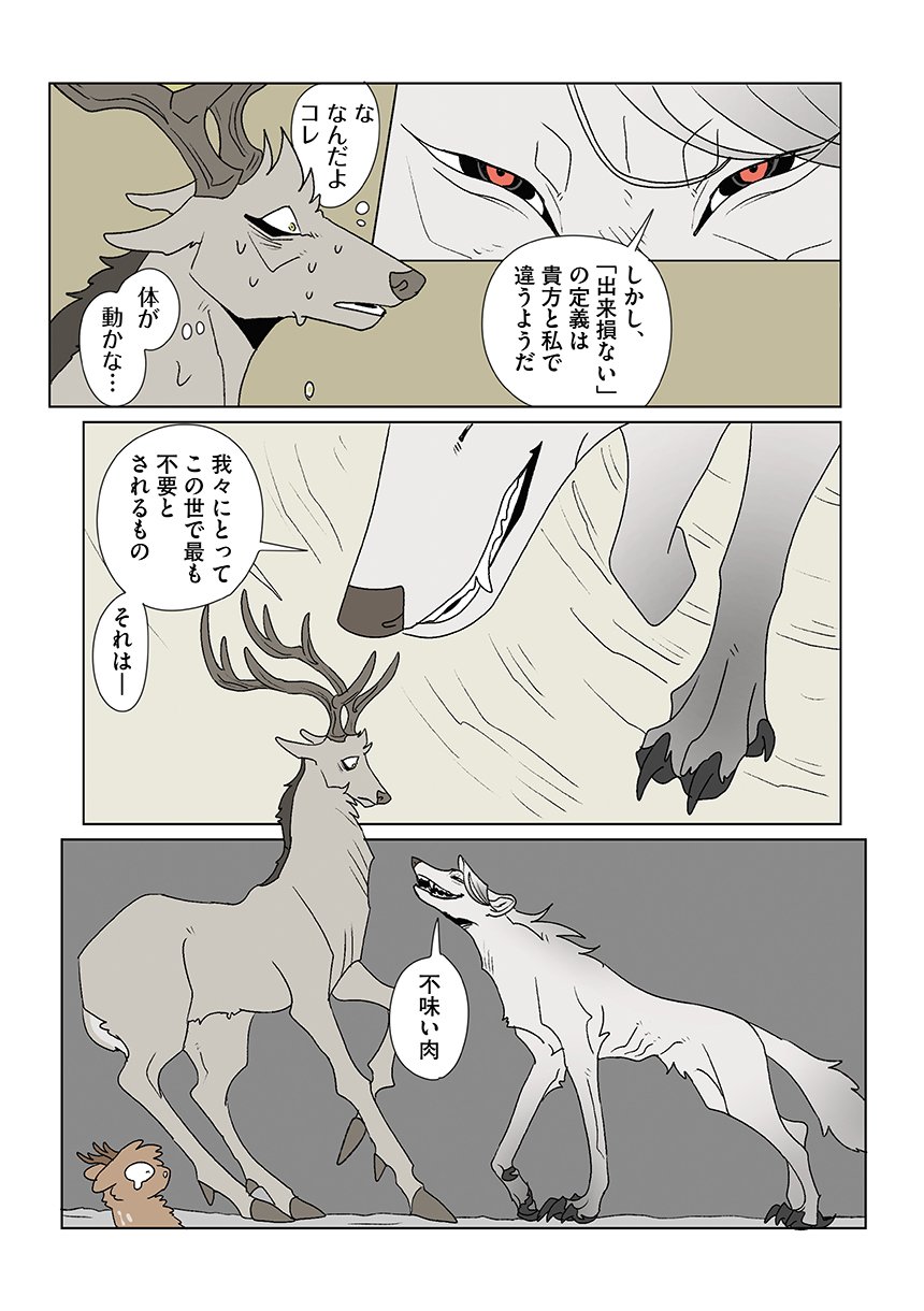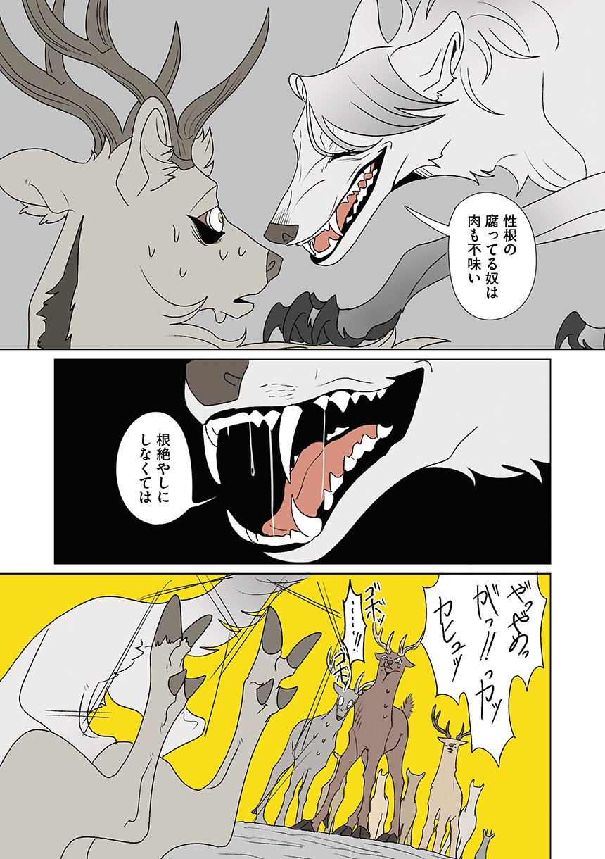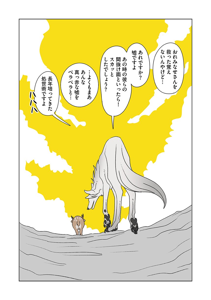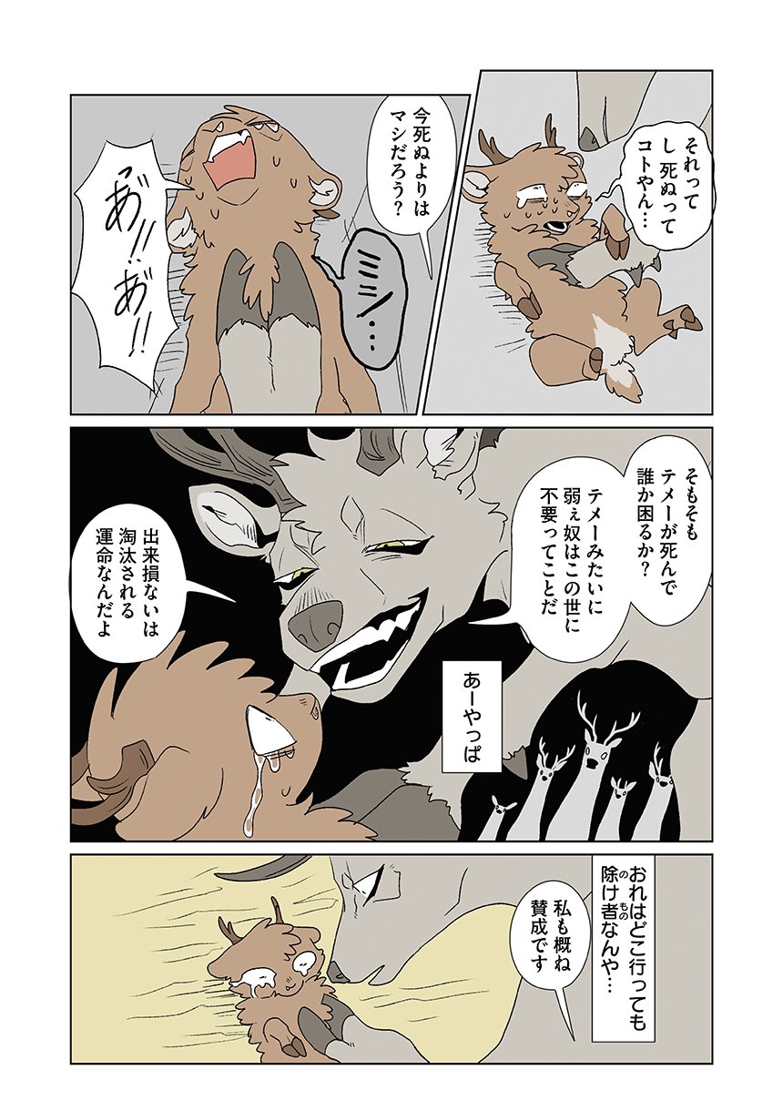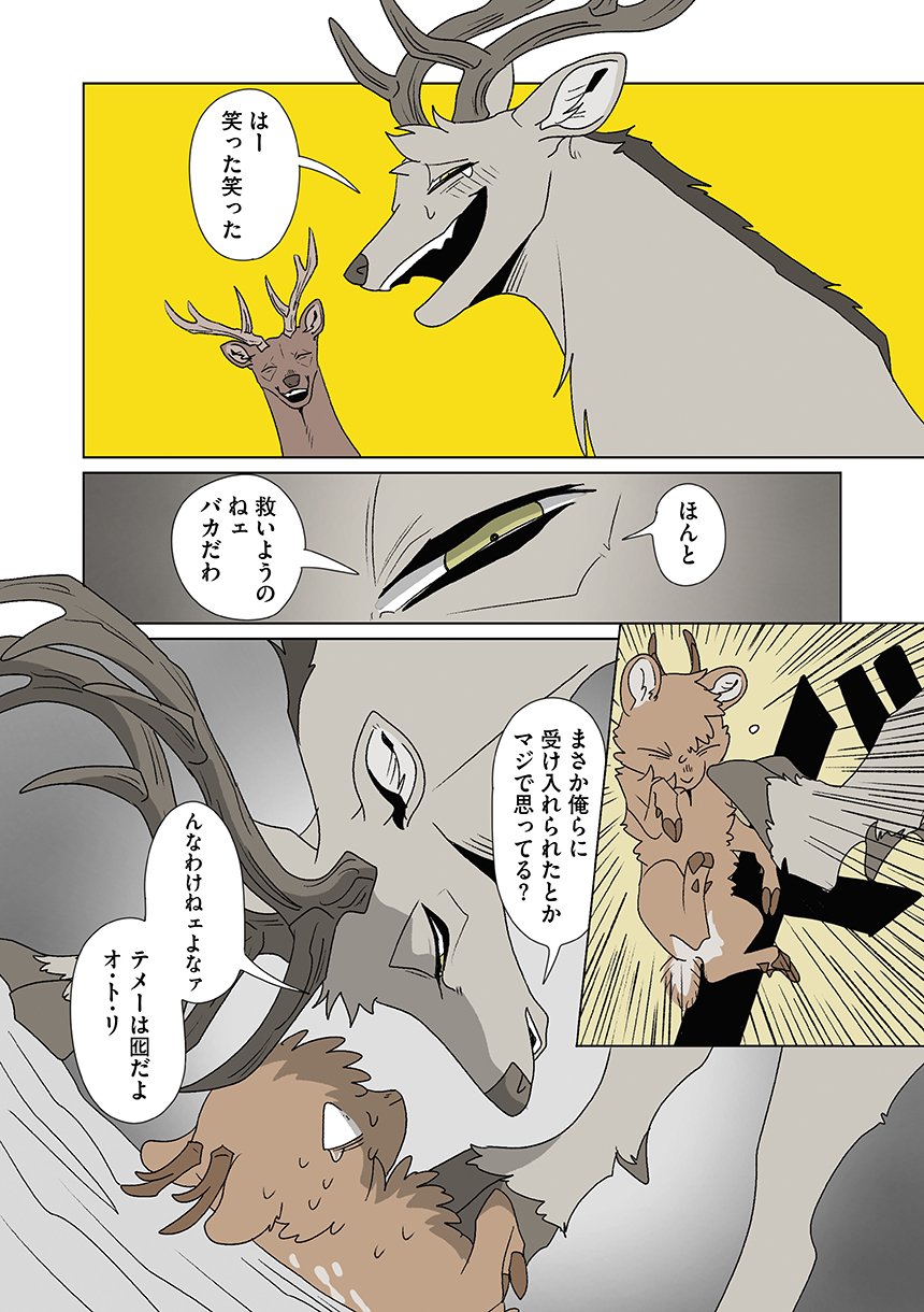 群れを追い出されたシカ・しのさきは、森で命を落としかけた瞬間、通りがかったオオカミ・みなせに救われる。