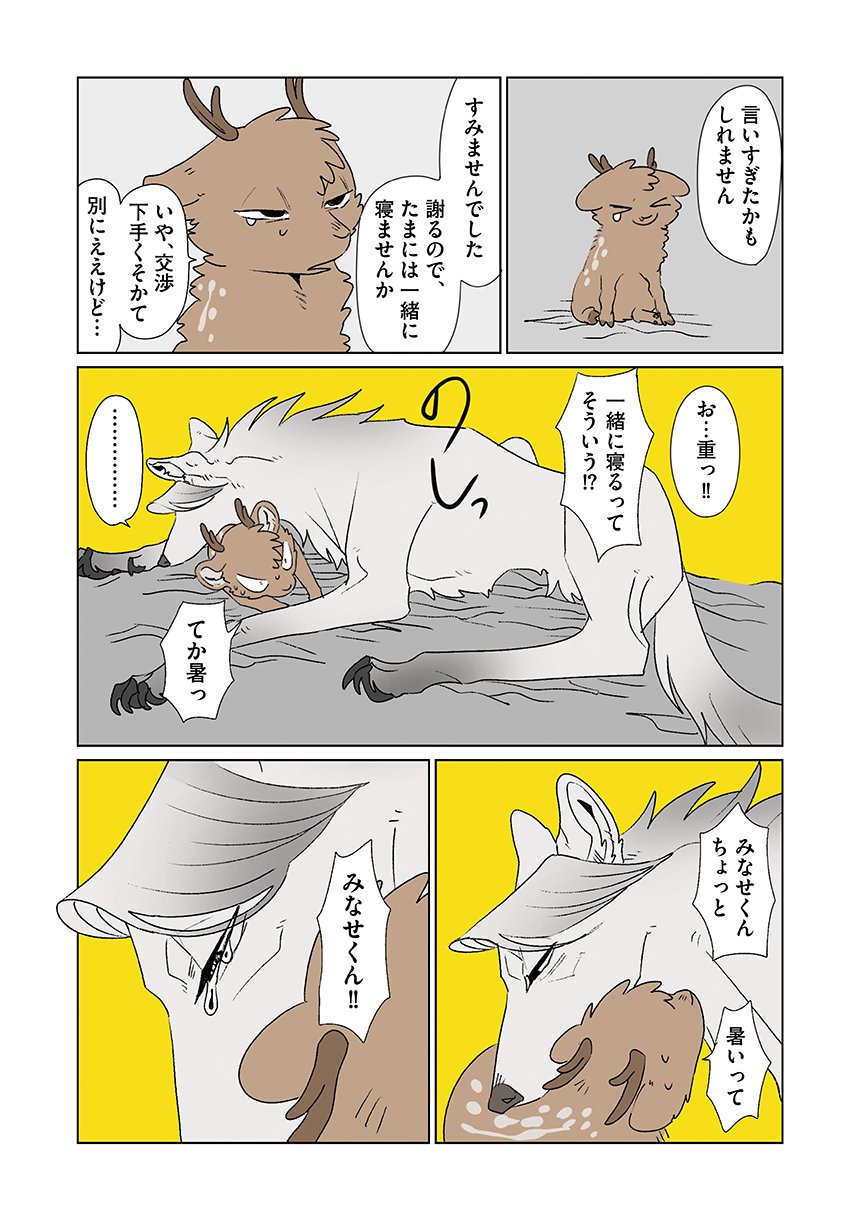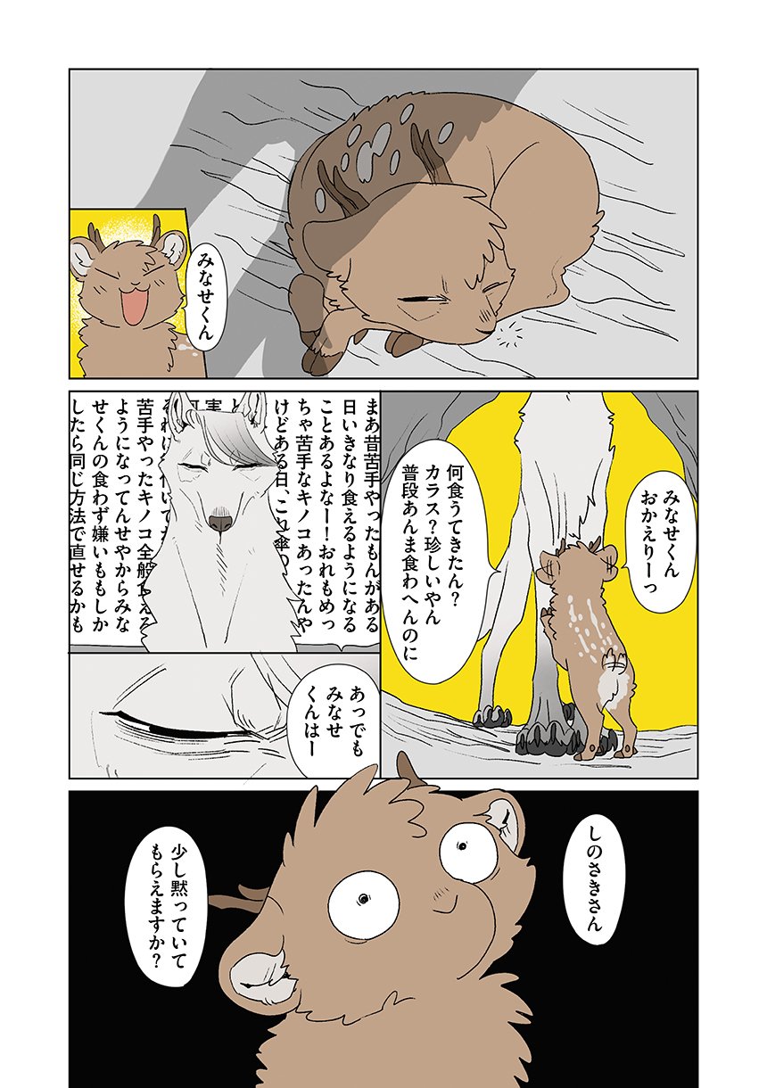 群れを追い出されたシカ・しのさきは、森で命を落としかけた瞬間、通りがかったオオカミ・みなせに救われる。