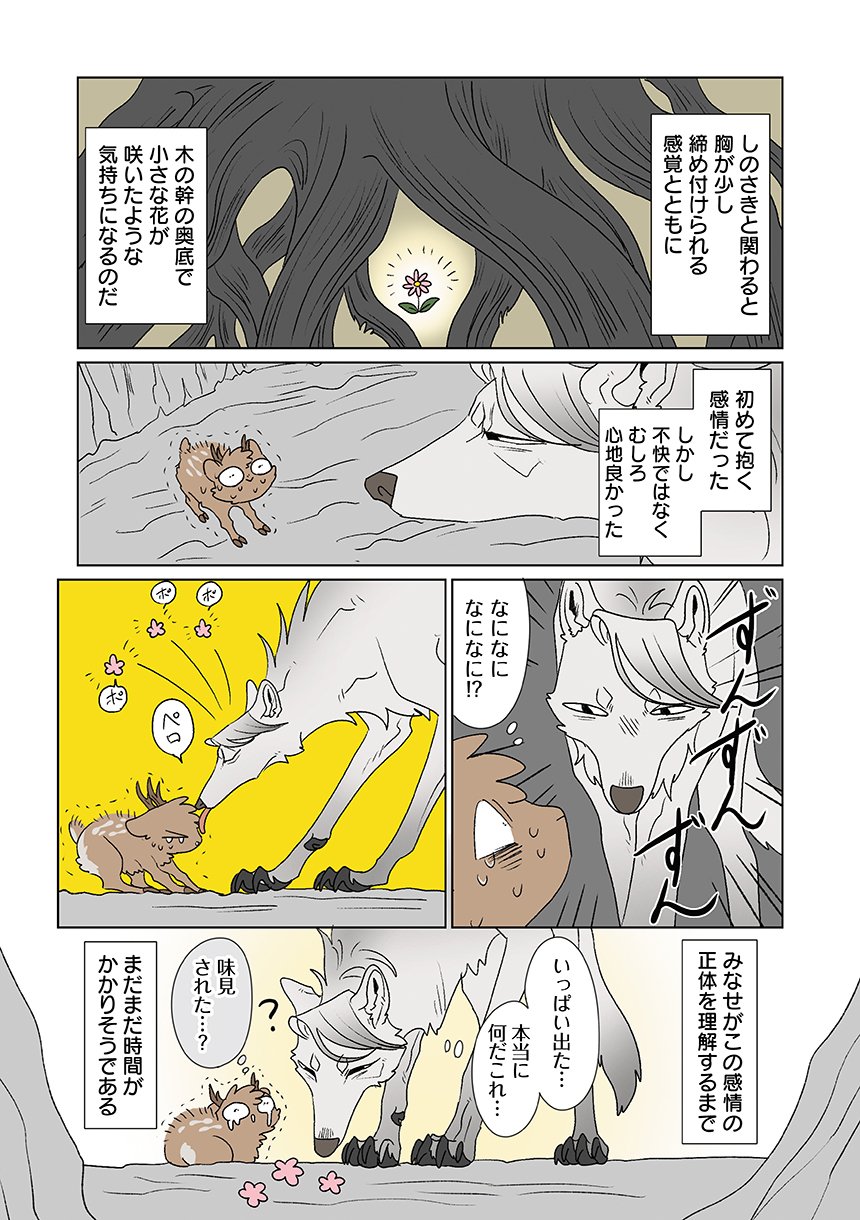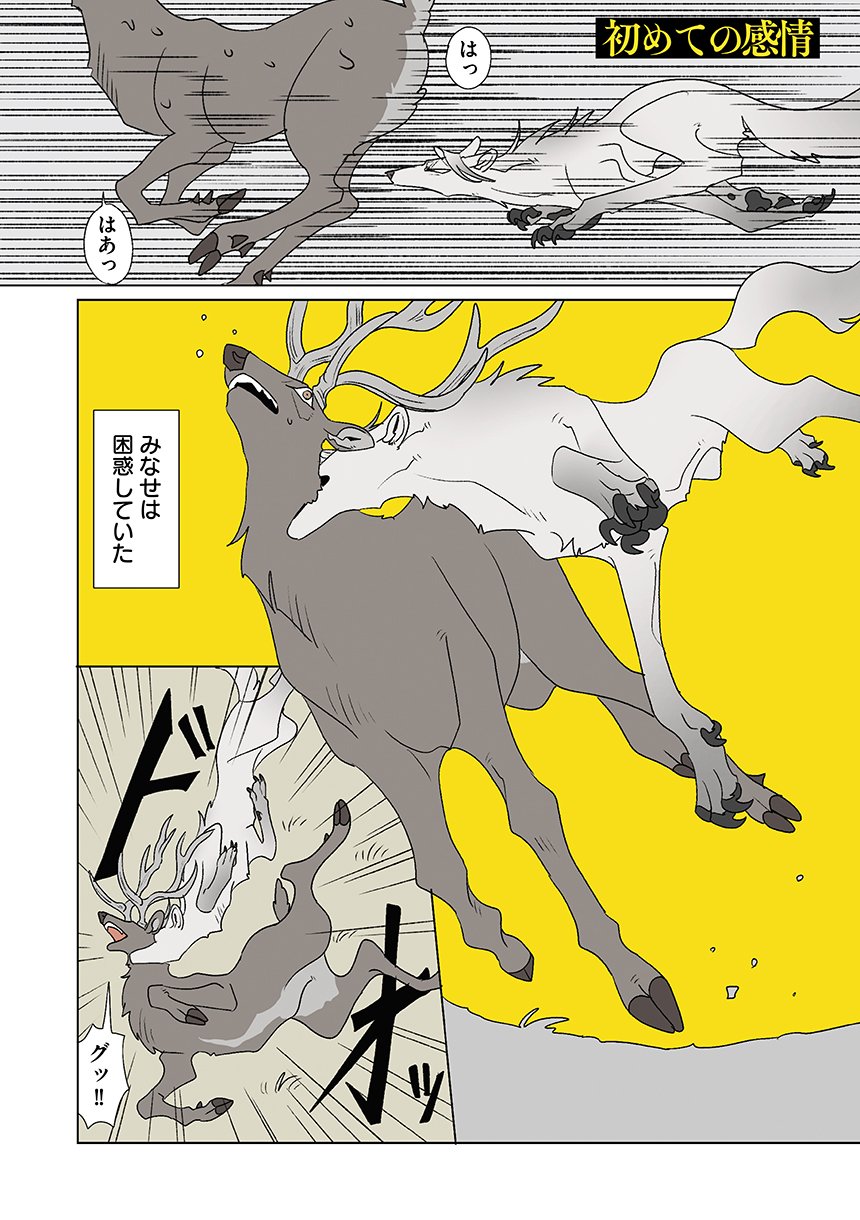 群れを追い出されたシカ・しのさきは、森で命を落としかけた瞬間、通りがかったオオカミ・みなせに救われる。