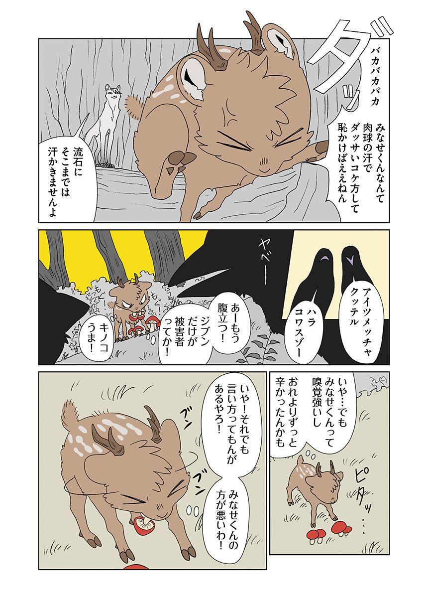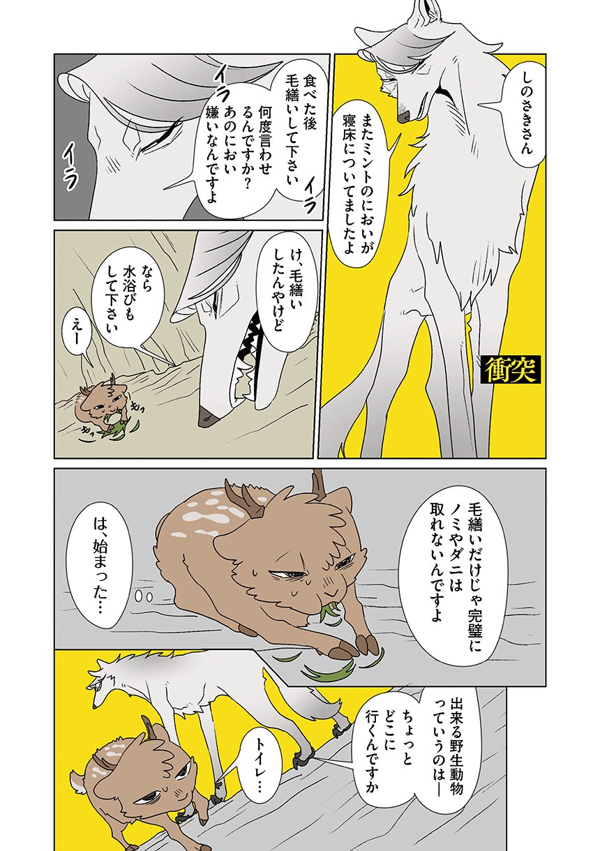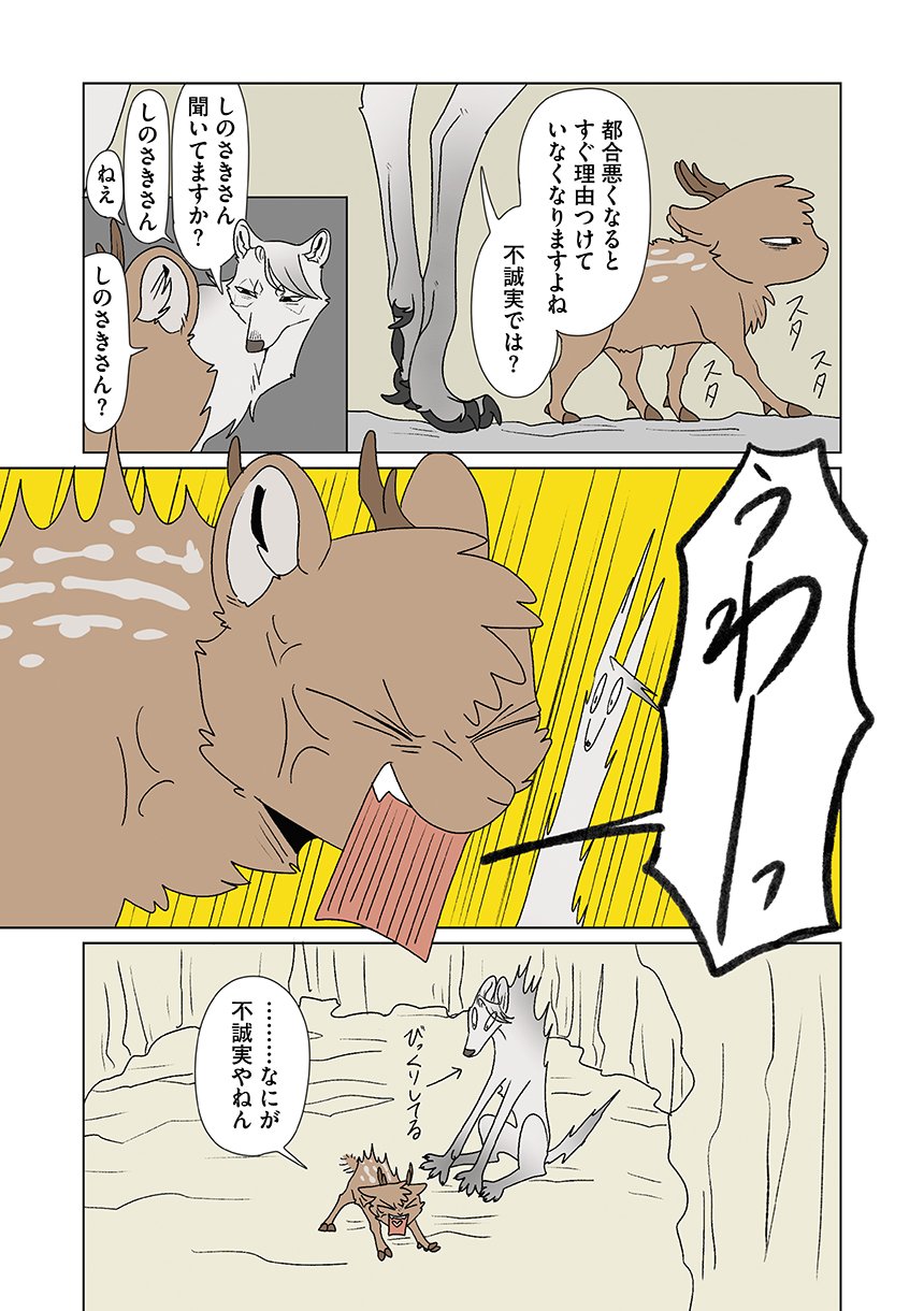 群れを追い出されたシカ・しのさきは、森で命を落としかけた瞬間、通りがかったオオカミ・みなせに救われる。