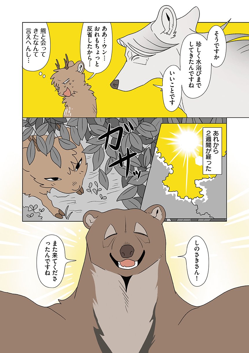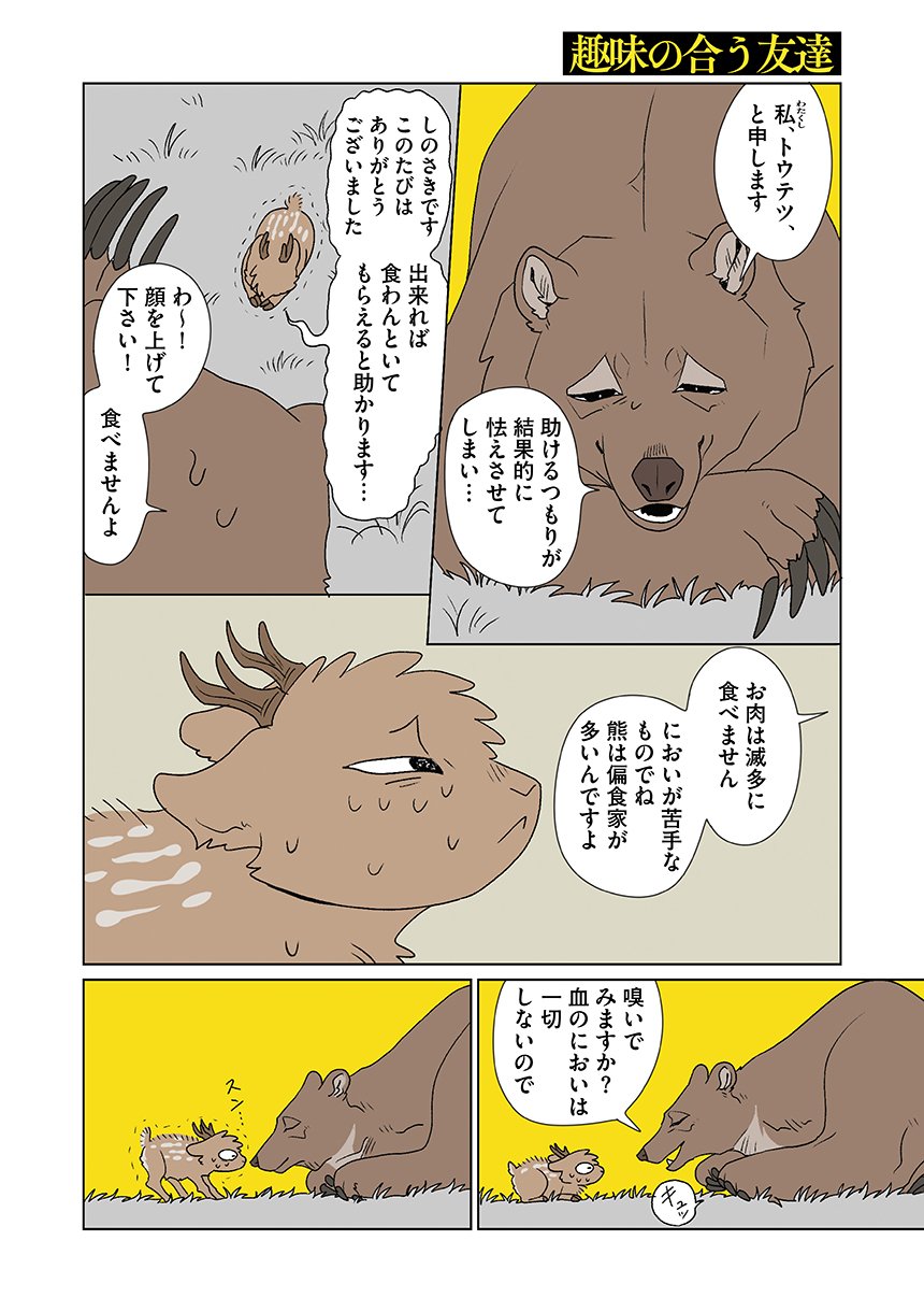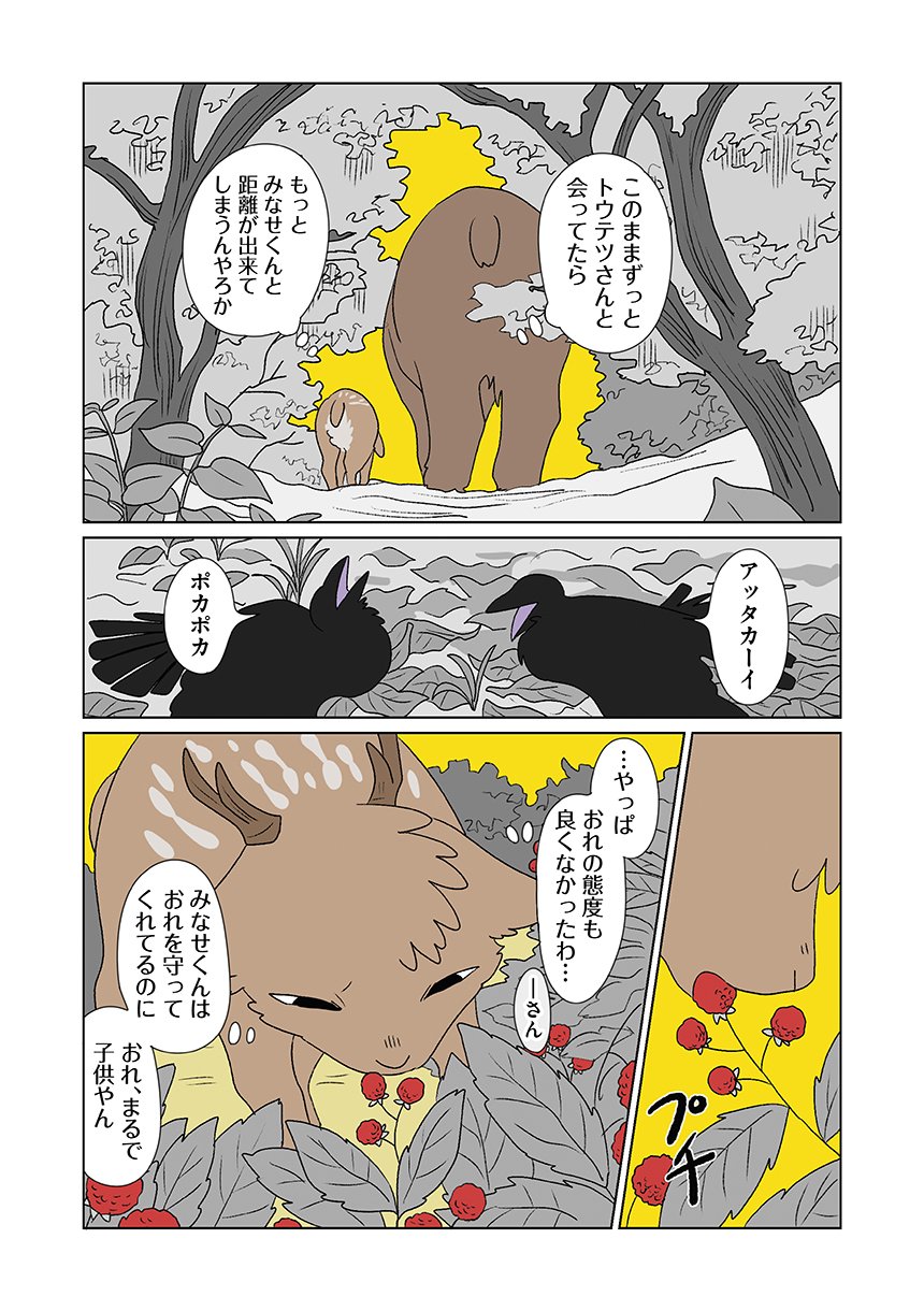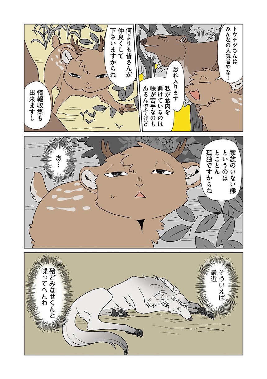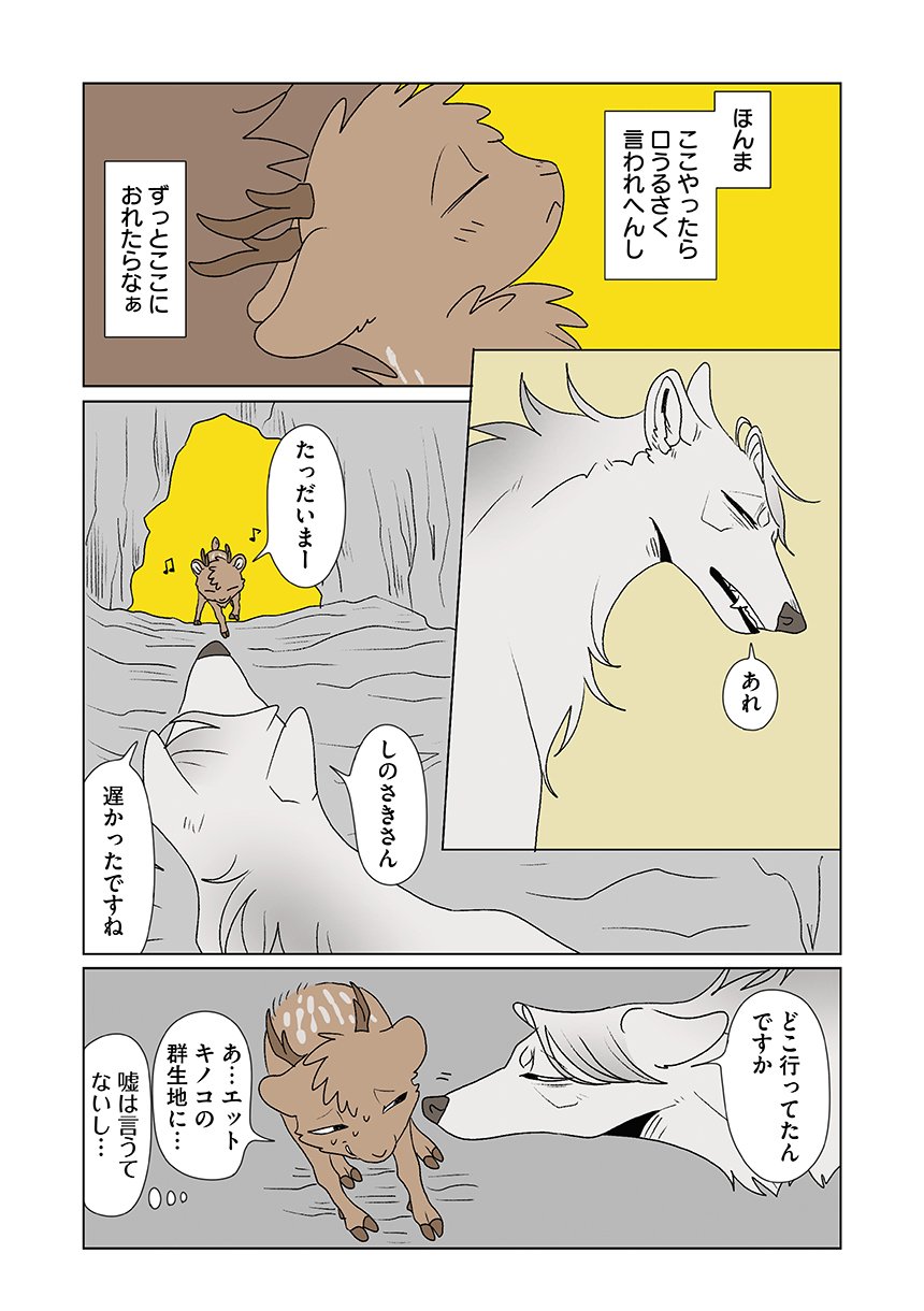 群れを追い出されたシカ・しのさきは、森で命を落としかけた瞬間、通りがかったオオカミ・みなせに救われる。