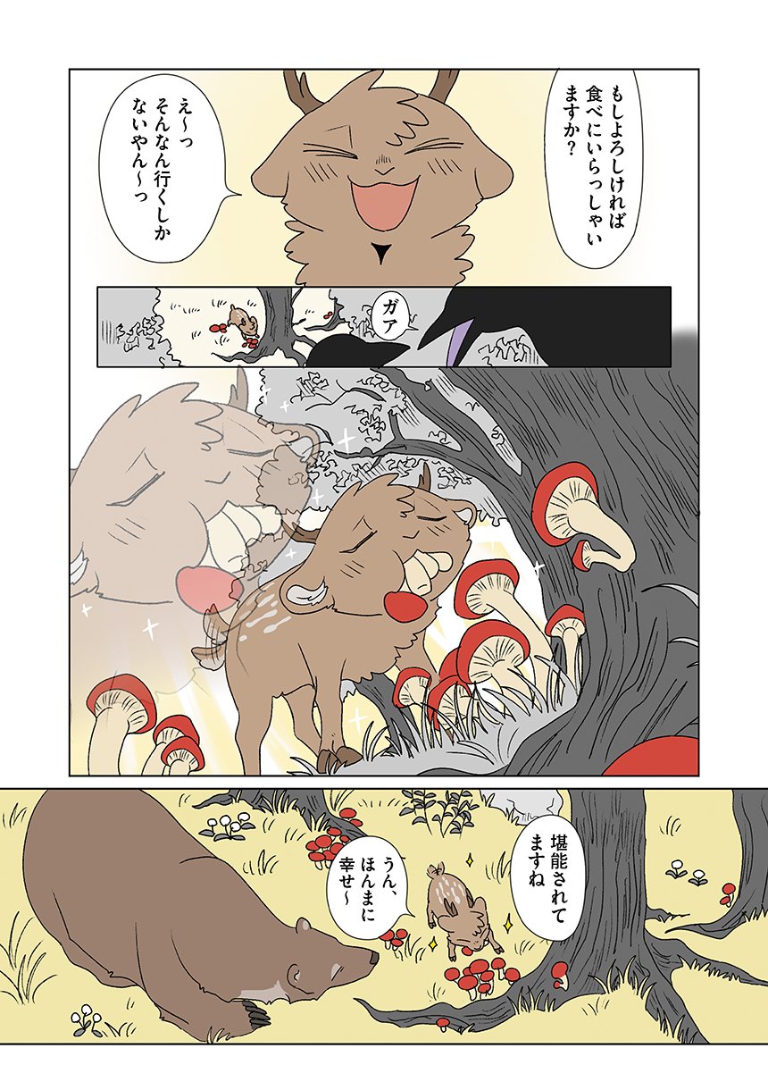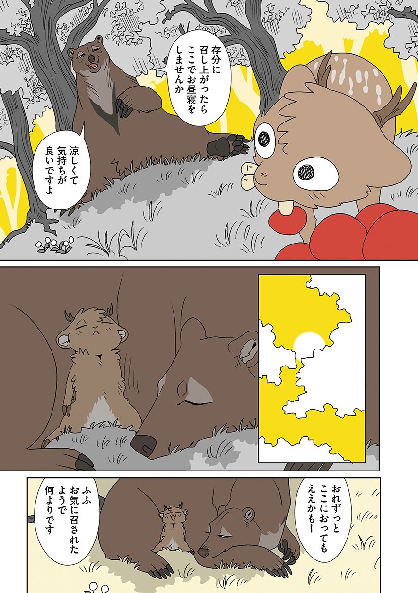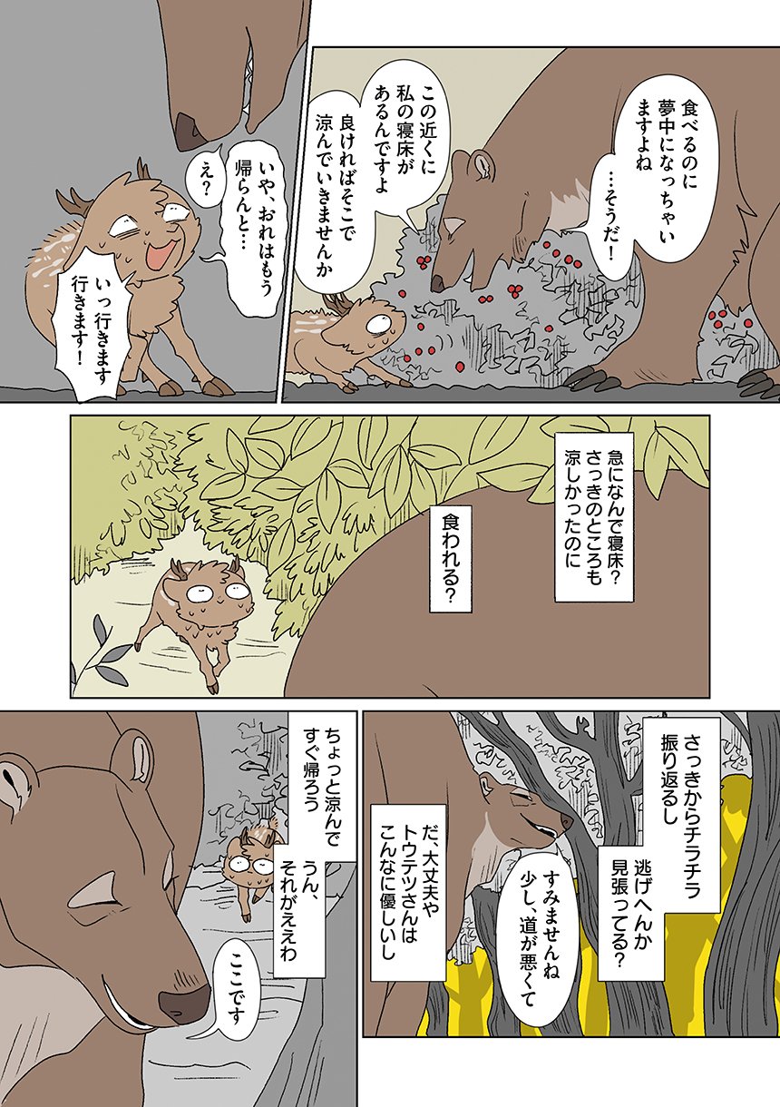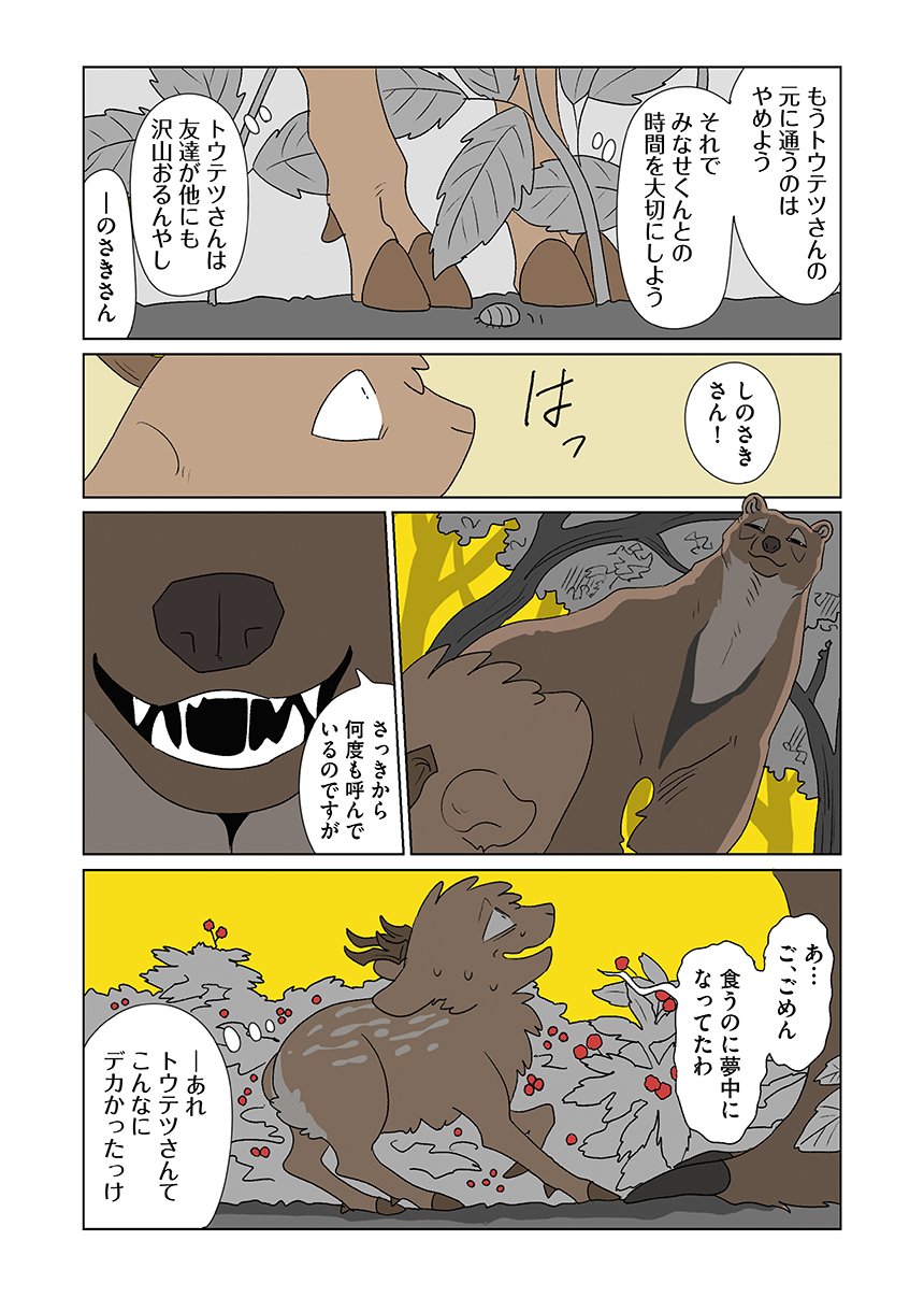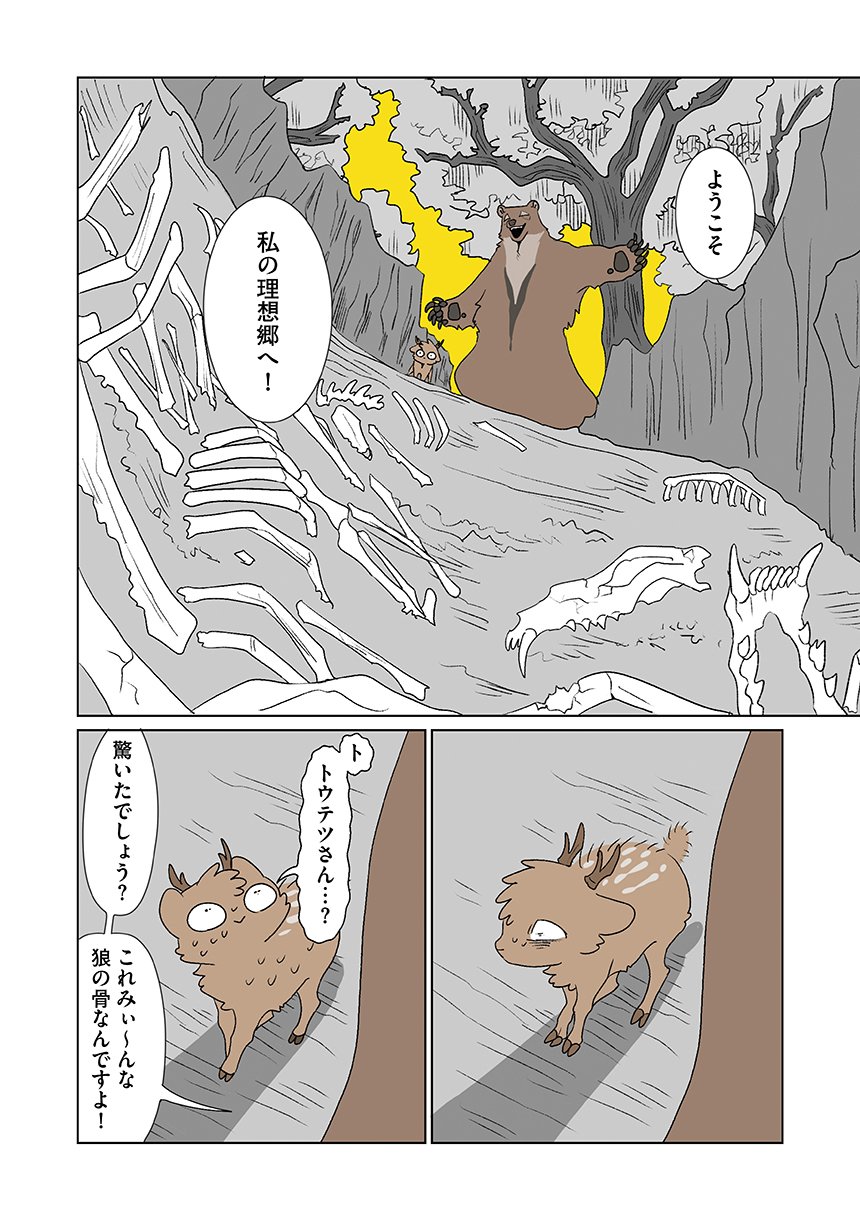群れを追い出されたシカ・しのさきは、森で命を落としかけた瞬間、通りがかったオオカミ・みなせに救われる。