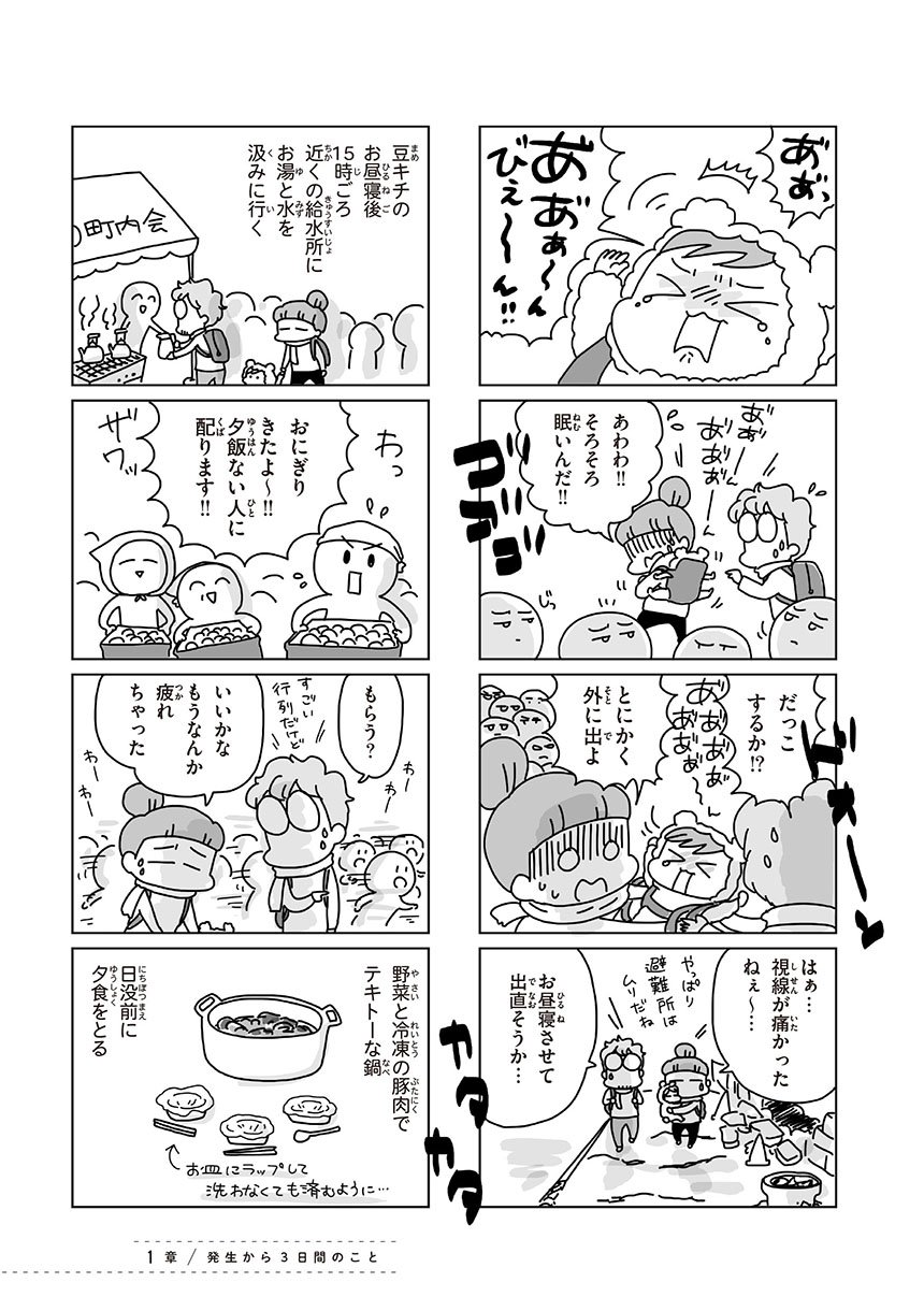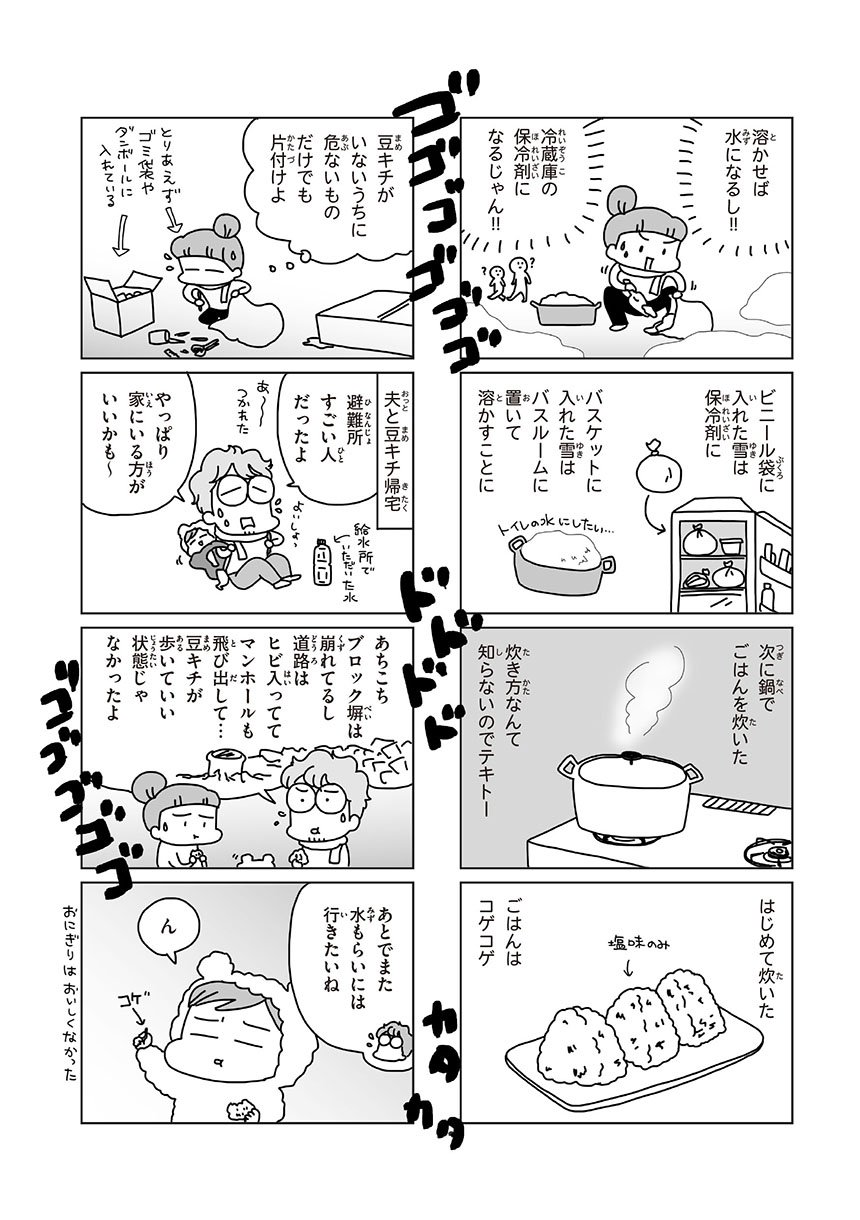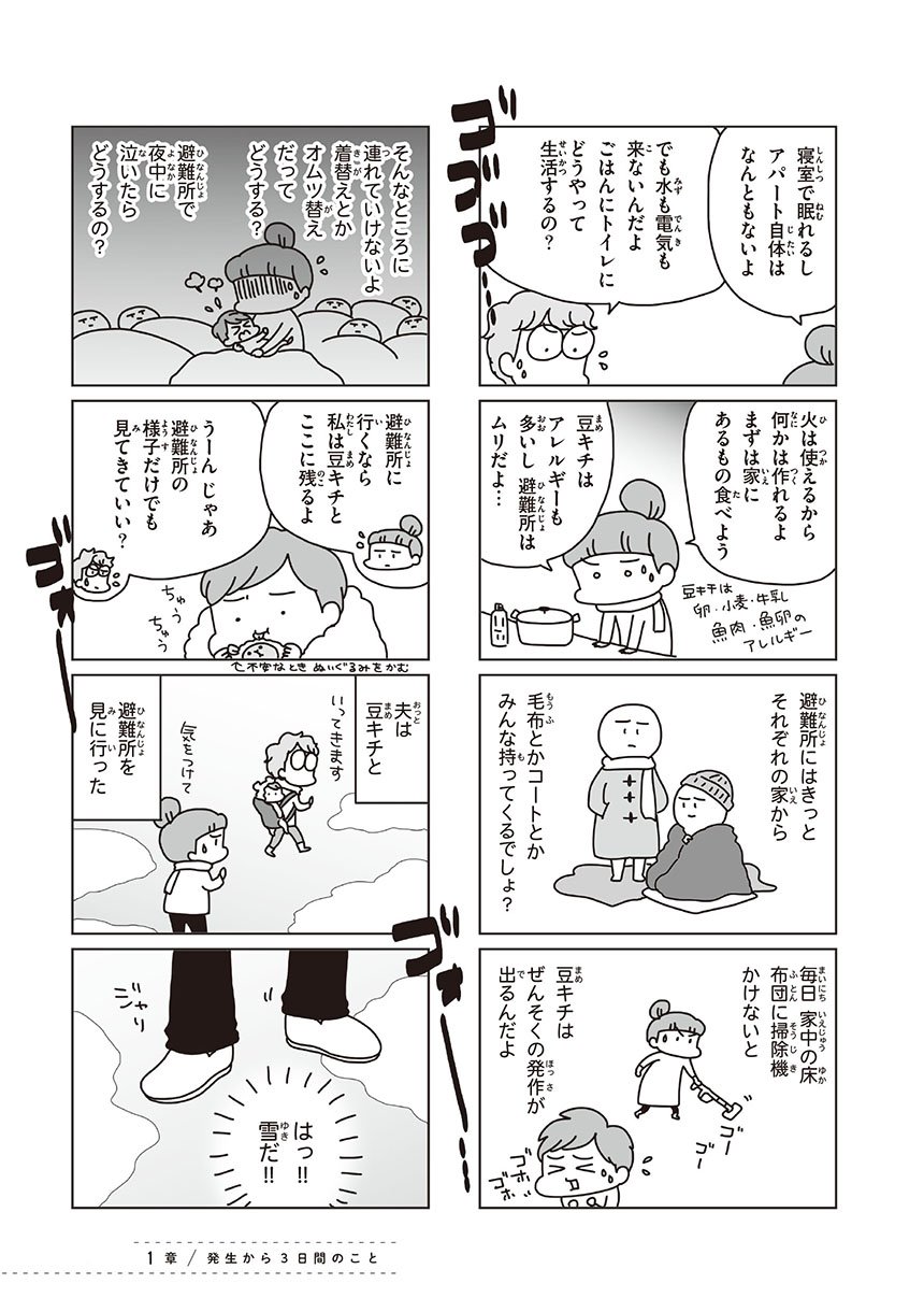 東日本大震災で、突然日常を奪われた1歳の息子と20代の夫婦。子の夜泣きやアレルギーなどから避難所生活をあきらめて自宅避難で乗り越えた家族の、3月11日から4月1日までの実録コミックエッセイ。