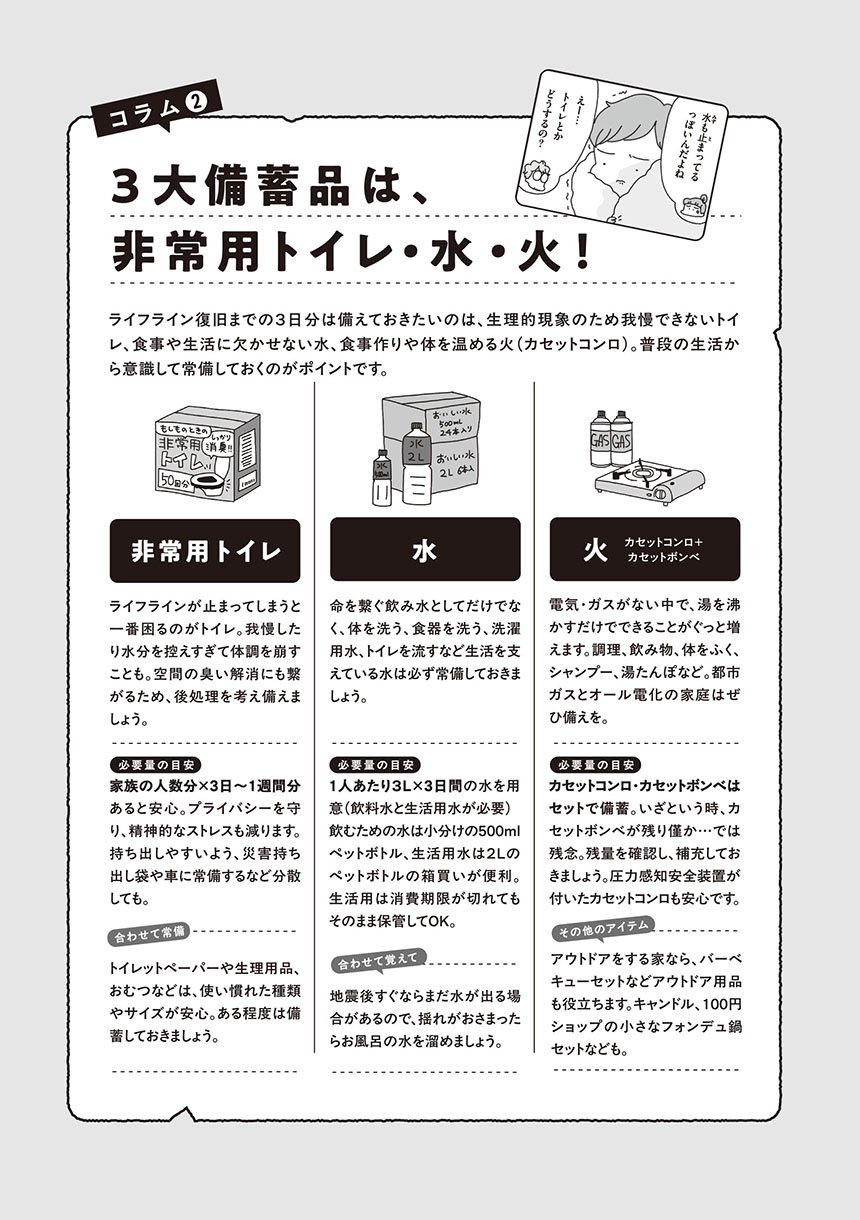 自宅避難だった自分が語るのは申し訳ないと、これまで語ることを控えていた著者。けれど、この地震大国で、実は意外と多いかもしれない自宅避難者の日常を知ってもらうことで、防災の備えの大切さを一人でも多くの人に知ってもらうことができたら…という気持ちで、当時を振り返ります。世界がひっくり返るような地震が起きても、人間はお腹も減るしトイレにも行きたくなるし、赤ちゃんは夜泣きする。命のことを考えながら、電気や水がない中で今日のごはんのことも考えている。混乱しながらも生活を続けた約3週間の日記コミックです。マンガの合間には、現在は防災士としても活動する著者の今すぐ実践できる自宅防災アイデアコラムも充実!