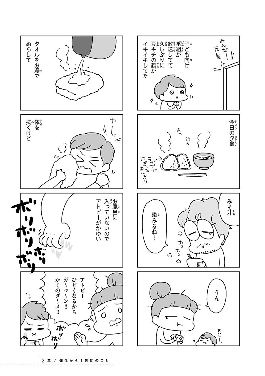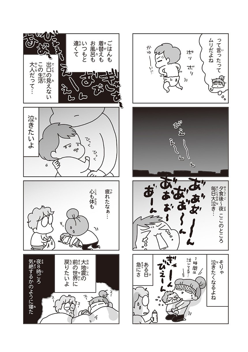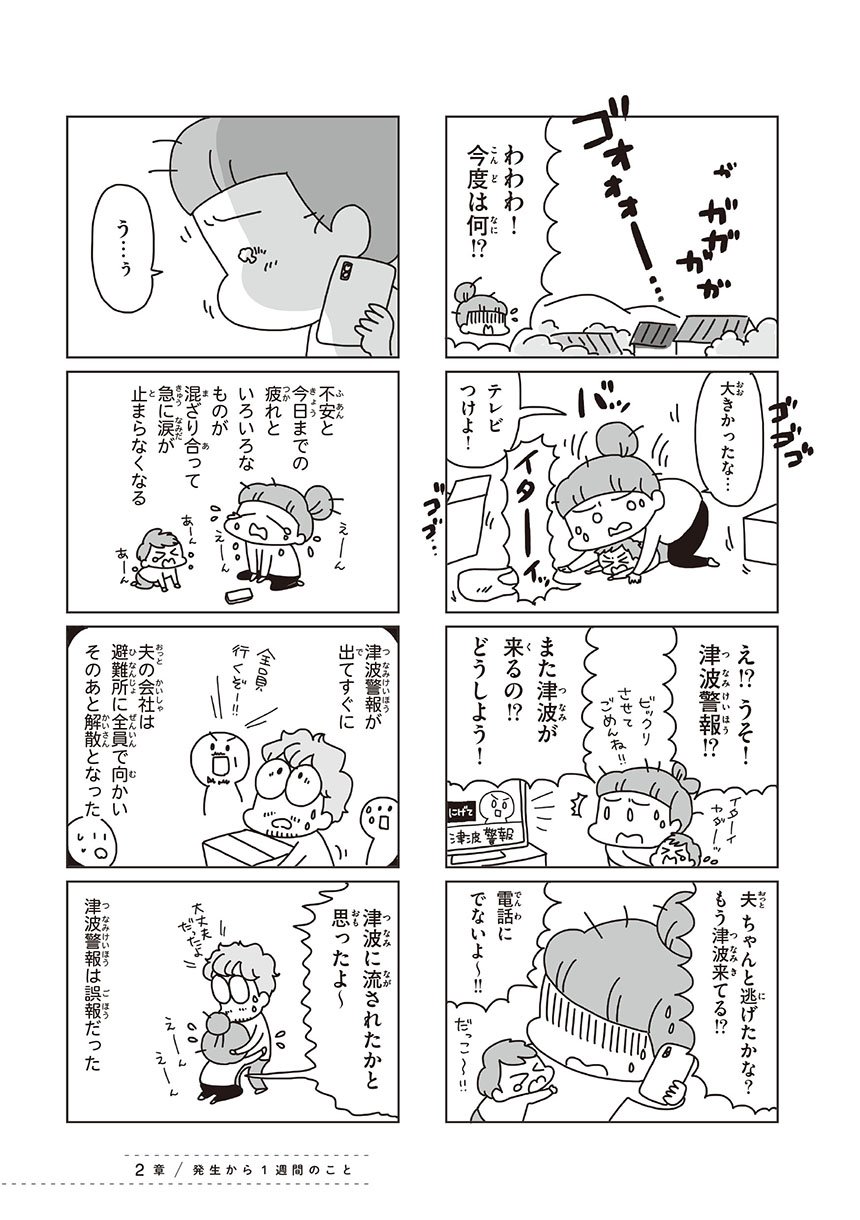 東日本大震災で、突然日常を奪われた1歳の息子と20代の夫婦。子の夜泣きやアレルギーなどから避難所生活をあきらめて自宅避難で乗り越えた家族の、3月11日から4月1日までの実録コミックエッセイ。