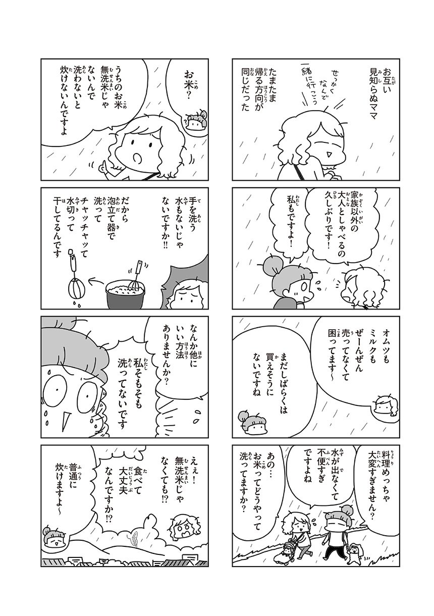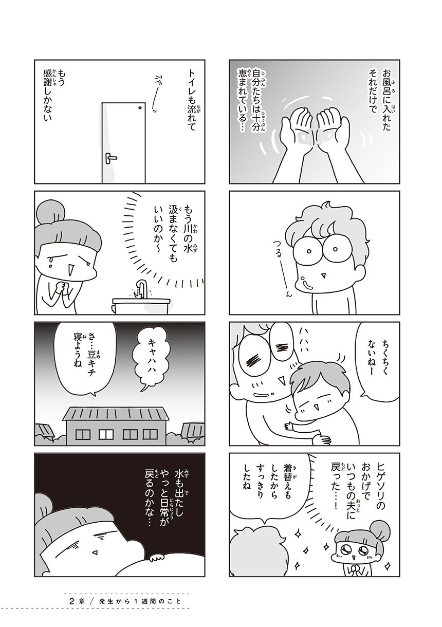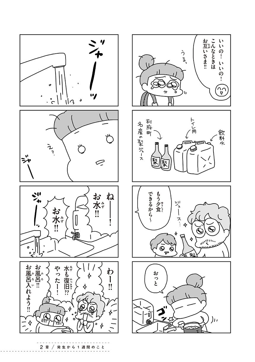 自宅避難だった自分が語るのは申し訳ないと、これまで語ることを控えていた著者。けれど、この地震大国で、実は意外と多いかもしれない自宅避難者の日常を知ってもらうことで、防災の備えの大切さを一人でも多くの人に知ってもらうことができたら…という気持ちで、当時を振り返ります。世界がひっくり返るような地震が起きても、人間はお腹も減るしトイレにも行きたくなるし、赤ちゃんは夜泣きする。命のことを考えながら、電気や水がない中で今日のごはんのことも考えている。混乱しながらも生活を続けた約3週間の日記コミックです。マンガの合間には、現在は防災士としても活動する著者の今すぐ実践できる自宅防災アイデアコラムも充実!