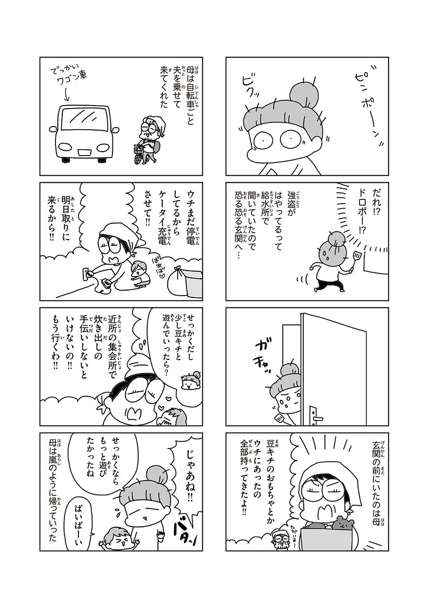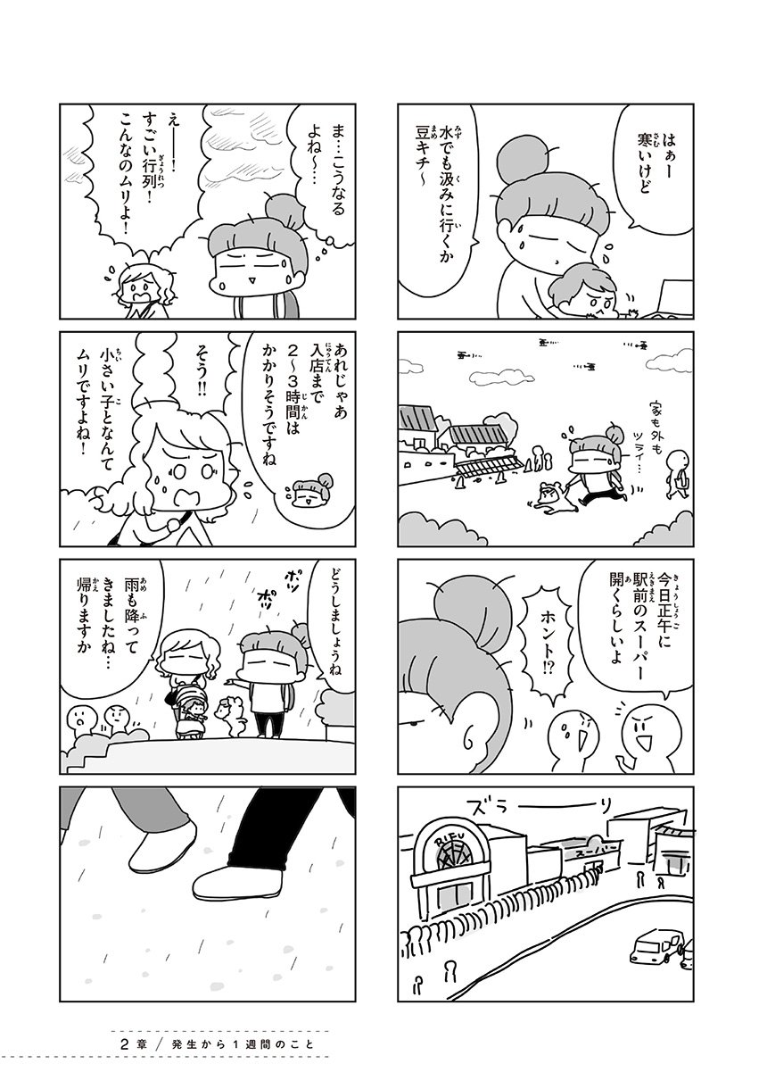 東日本大震災で、突然日常を奪われた1歳の息子と20代の夫婦。子の夜泣きやアレルギーなどから避難所生活をあきらめて自宅避難で乗り越えた家族の、3月11日から4月1日までの実録コミックエッセイ。