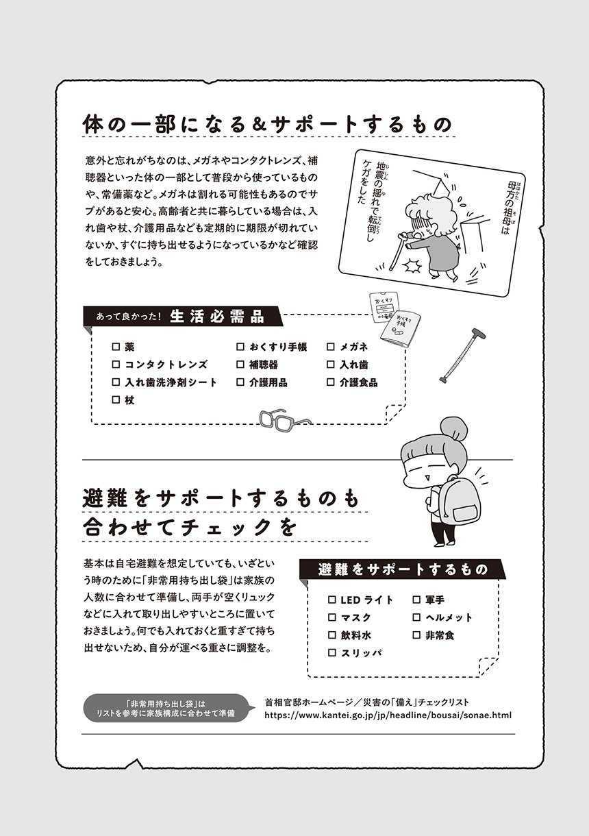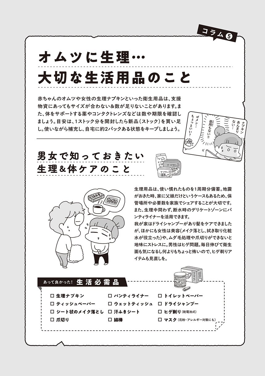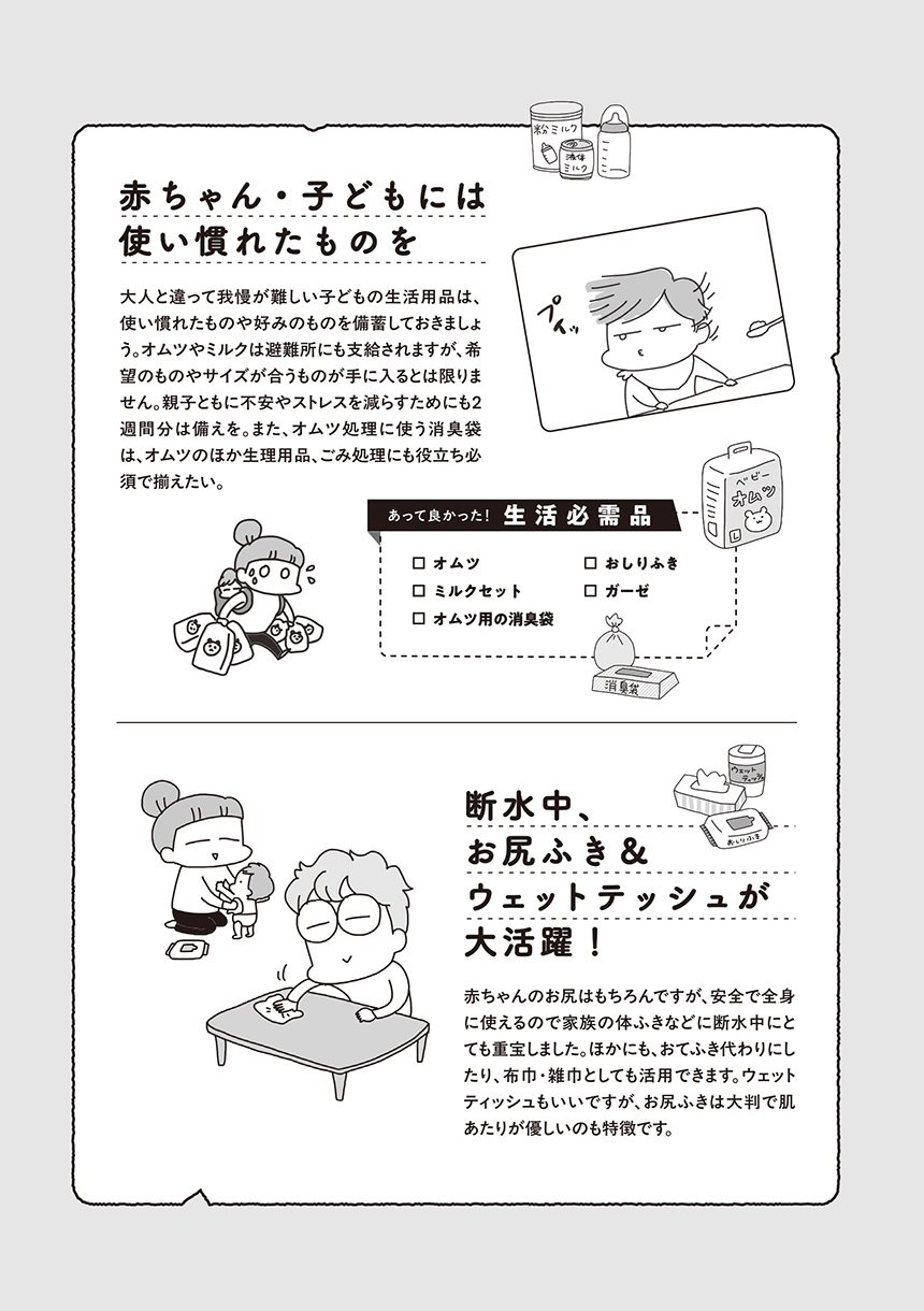 自宅避難だった自分が語るのは申し訳ないと、これまで語ることを控えていた著者。けれど、この地震大国で、実は意外と多いかもしれない自宅避難者の日常を知ってもらうことで、防災の備えの大切さを一人でも多くの人に知ってもらうことができたら…という気持ちで、当時を振り返ります。世界がひっくり返るような地震が起きても、人間はお腹も減るしトイレにも行きたくなるし、赤ちゃんは夜泣きする。命のことを考えながら、電気や水がない中で今日のごはんのことも考えている。混乱しながらも生活を続けた約3週間の日記コミックです。マンガの合間には、現在は防災士としても活動する著者の今すぐ実践できる自宅防災アイデアコラムも充実!