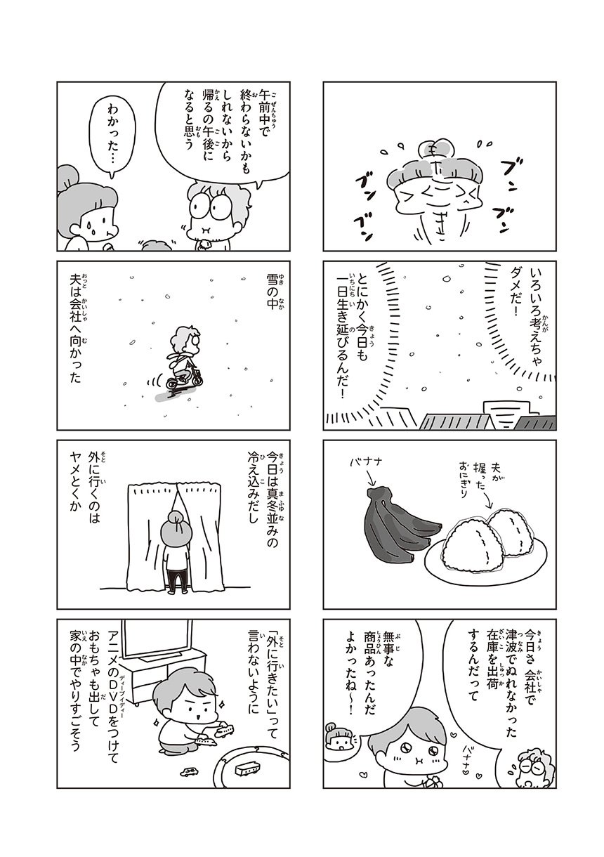 東日本大震災で、突然日常を奪われた1歳の息子と20代の夫婦。子の夜泣きやアレルギーなどから避難所生活をあきらめて自宅避難で乗り越えた家族の、3月11日から4月1日までの実録コミックエッセイ。