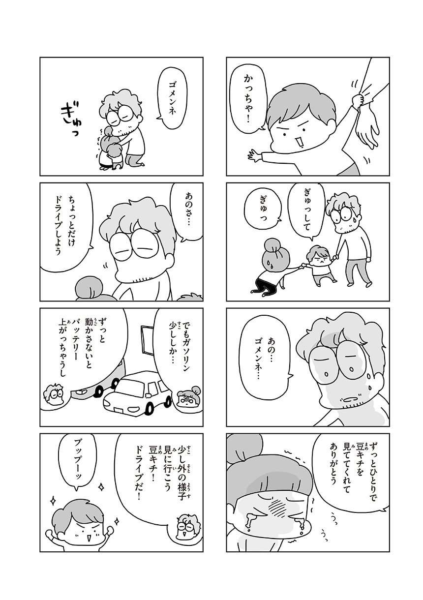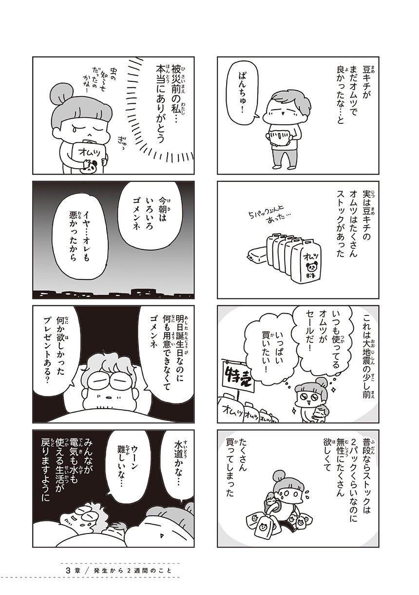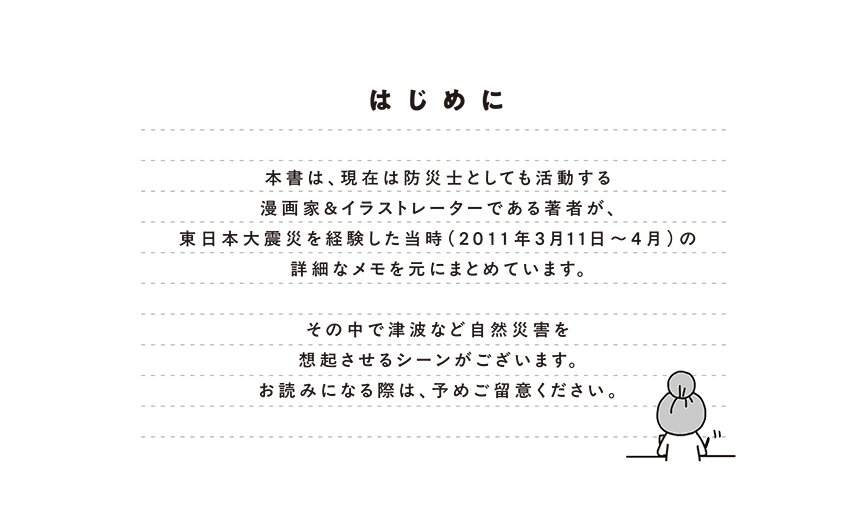 東日本大震災で、突然日常を奪われた1歳の息子と20代の夫婦。子の夜泣きやアレルギーなどから避難所生活をあきらめて自宅避難で乗り越えた家族の、3月11日から4月1日までの実録コミックエッセイ。