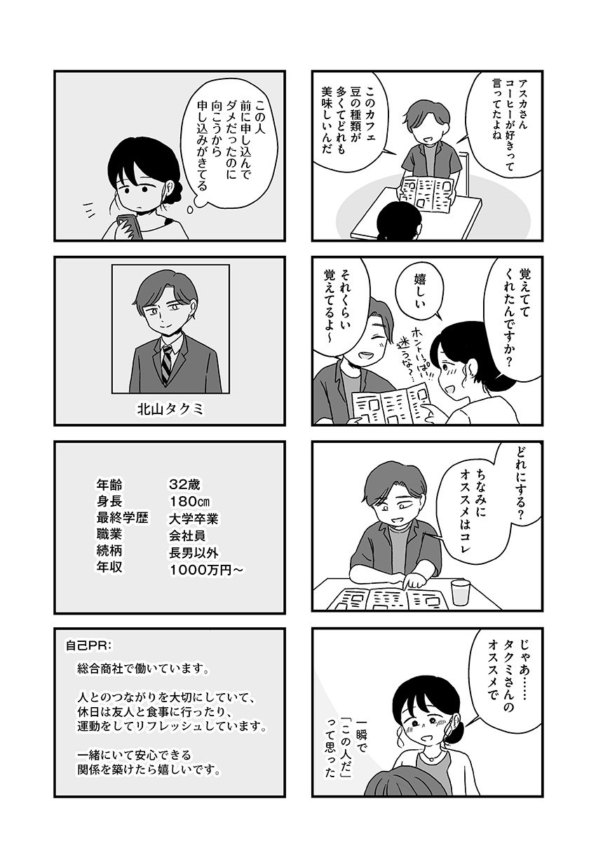 結婚に興味ゼロだった渡辺アスカ(29歳)は、周りの友人たちの変化から婚活を始め、結婚相談所へ行くことに。そこで出会ったどこか冴えない公務員・山本。アスカは山本から猛烈なアプローチを受けるものの、どこか物足りなさを感じ、関係を進めるべきか悩んでいた。そんなとき、今までで一番気の合う高スペックエリート・北山が現れ、アスカの婚活に一筋の光が差し込むのだが―――。「婚活は相手探しじゃありません、自分探しですよ」。容姿、年齢、年収、学歴、家柄…「理想」という名の呪いに憑りつかれ、次第に自分を見失っていくアスカがたどり着いたひとつの答えとは。綿密な取材をもとに現代の婚活のリアルを描いたセミフィクション。