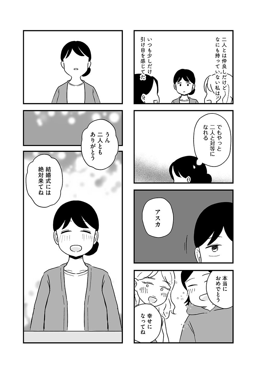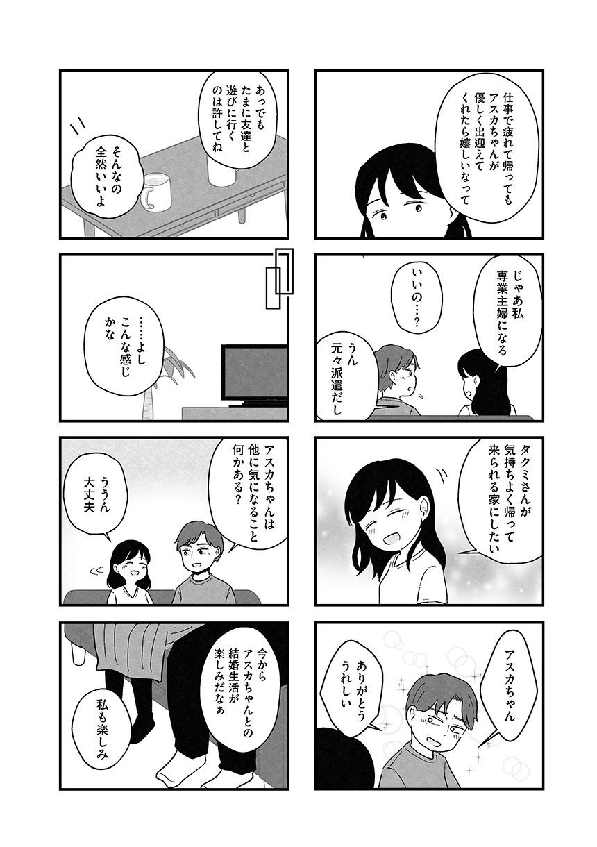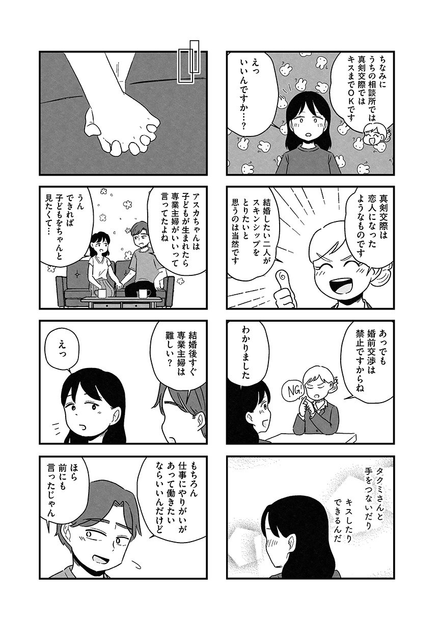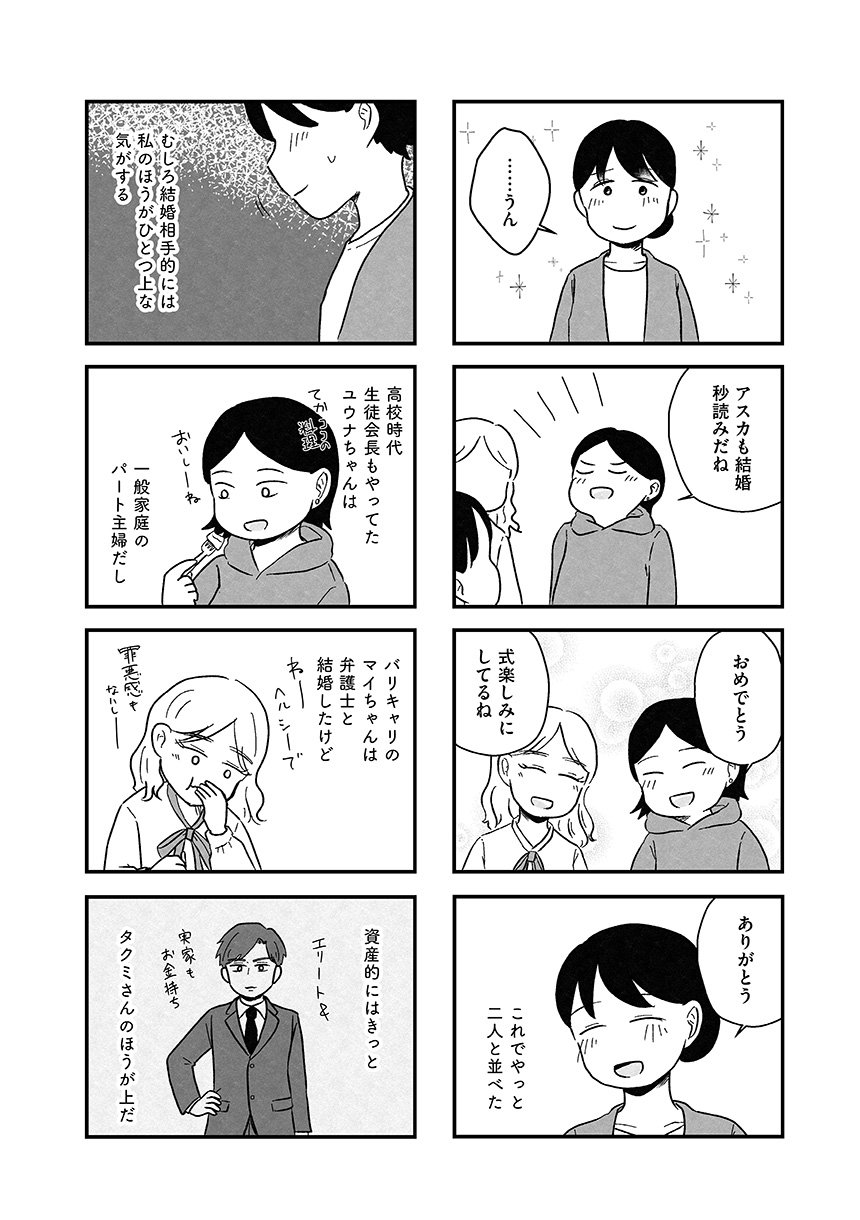 結婚に興味ゼロだった渡辺アスカ(29歳)は、周りの友人たちの変化から婚活を始め、結婚相談所へ行くことに。そこで出会ったどこか冴えない公務員・山本。アスカは山本から猛烈なアプローチを受けるものの、どこか物足りなさを感じ、関係を進めるべきか悩んでいた。そんなとき、今までで一番気の合う高スペックエリート・北山が現れ、アスカの婚活に一筋の光が差し込むのだが―――。「婚活は相手探しじゃありません、自分探しですよ」。容姿、年齢、年収、学歴、家柄…「理想」という名の呪いに憑りつかれ、次第に自分を見失っていくアスカがたどり着いたひとつの答えとは。綿密な取材をもとに現代の婚活のリアルを描いたセミフィクション。