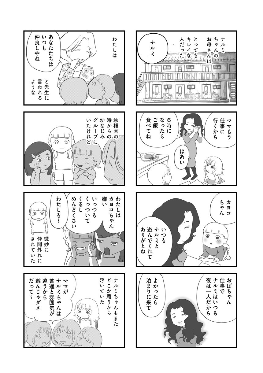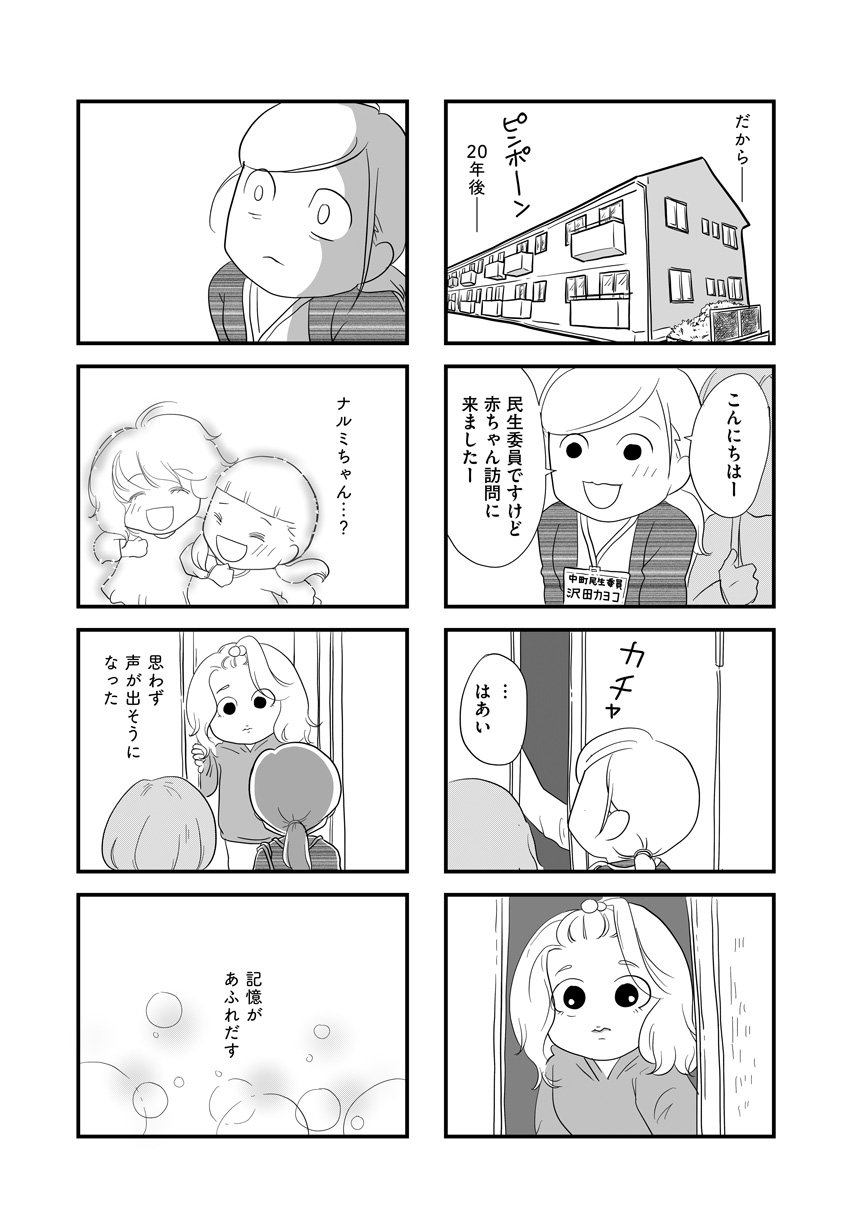 「こんにちは、民生委員の赤ちゃん訪問です」。ドアを開けてくれたアカネと初めて会った時、カヨコは息が止まりそうになった。幼少期の友達のナルミとあまりにも似ていたから。ナルミとその母親はある日突然いなくなった。家の家財道具はそのまま、学校にはピアニカも絵の具も置いたまま、二人だけがひっそりといなくなった。大人になったカヨコが赤ちゃん訪問で出会ったアカネは、十代の若いお母さんで親戚も友達もいない土地で初めての子育てに苦労しているように見えた。ナルミとアカネの境遇が似ていると感じたカヨコは、どうしても他人事とは思えずアカネの手助けをしたいと思うのだが……。かつて自分の前から忽然と消えたナルミの心の声を自分は聞いていただろうか。大人になった自分は、ナルミの生き写しであるかのようなアカネに手を差し伸べることができるだろうか。無縁社会に落ちてしまった母と子供を葛藤しながら見つめる渾身のセミフィクションコミックエッセイ。