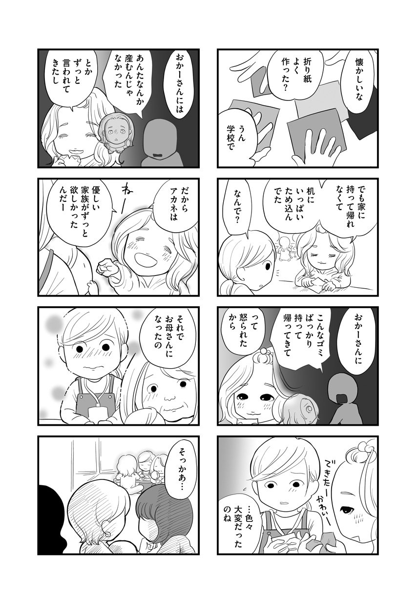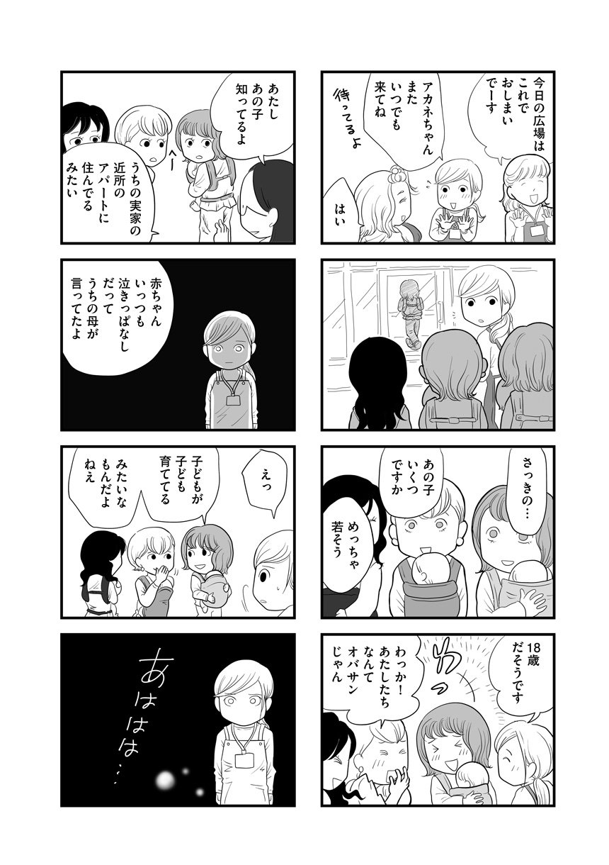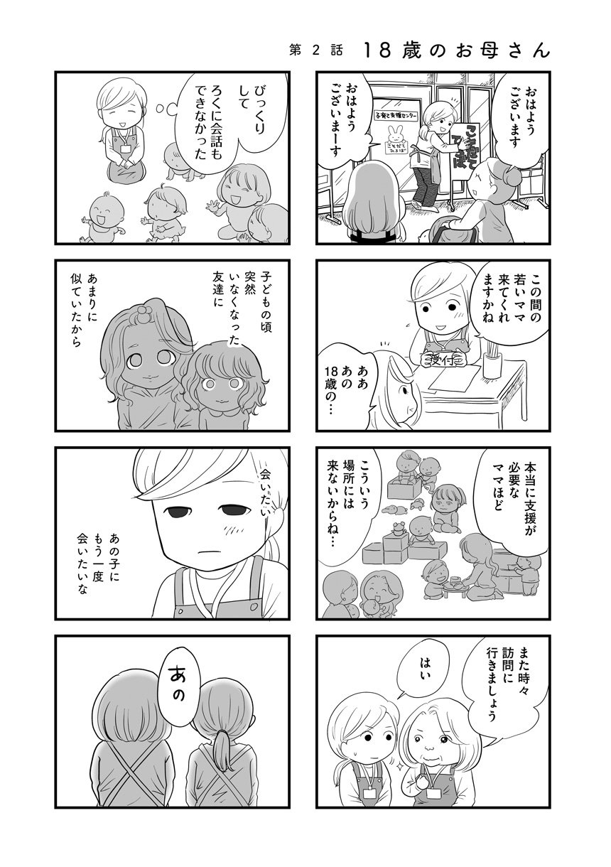 「こんにちは、民生委員の赤ちゃん訪問です」。ドアを開けてくれたアカネと初めて会った時、カヨコは息が止まりそうになった。幼少期の友達のナルミとあまりにも似ていたから。ナルミとその母親はある日突然いなくなった。家の家財道具はそのまま、学校にはピアニカも絵の具も置いたまま、二人だけがひっそりといなくなった。大人になったカヨコが赤ちゃん訪問で出会ったアカネは、十代の若いお母さんで親戚も友達もいない土地で初めての子育てに苦労しているように見えた。ナルミとアカネの境遇が似ていると感じたカヨコは、どうしても他人事とは思えずアカネの手助けをしたいと思うのだが……。かつて自分の前から忽然と消えたナルミの心の声を自分は聞いていただろうか。大人になった自分は、ナルミの生き写しであるかのようなアカネに手を差し伸べることができるだろうか。無縁社会に落ちてしまった母と子供を葛藤しながら見つめる渾身のセミフィクションコミックエッセイ。