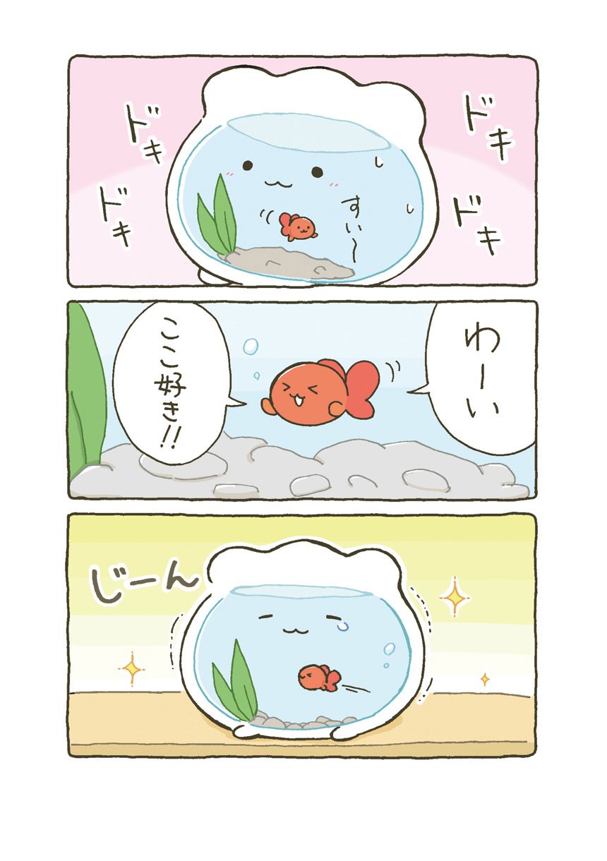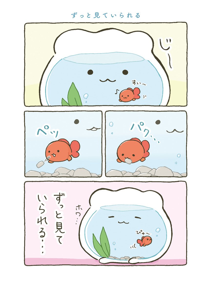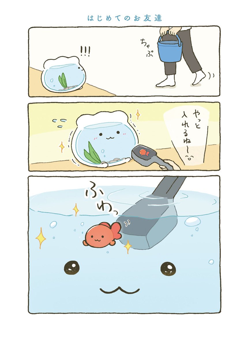 はじめてできた大切な大切なお友達とずーっといっしょの日常がはじまります。すぐに転んで泣いちゃうけれど、金魚くんのためにがんばれ金魚鉢ちゃん!