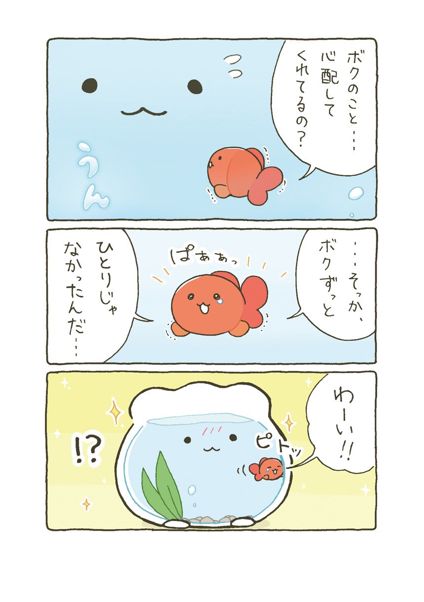 はじめてできた大切な大切なお友達とずーっといっしょの日常がはじまります。すぐに転んで泣いちゃうけれど、金魚くんのためにがんばれ金魚鉢ちゃん!