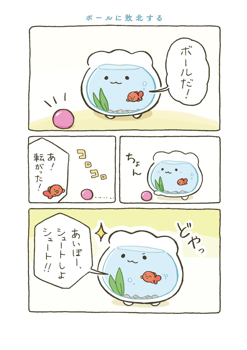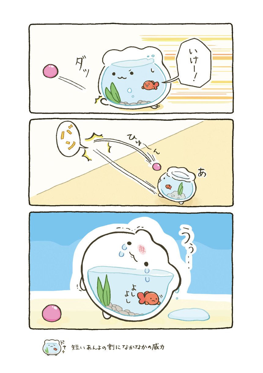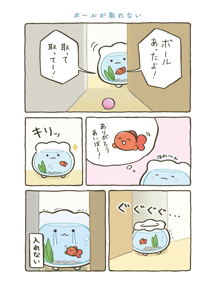 はじめてできた大切な大切なお友達とずーっといっしょの日常がはじまります。すぐに転んで泣いちゃうけれど、金魚くんのためにがんばれ金魚鉢ちゃん!