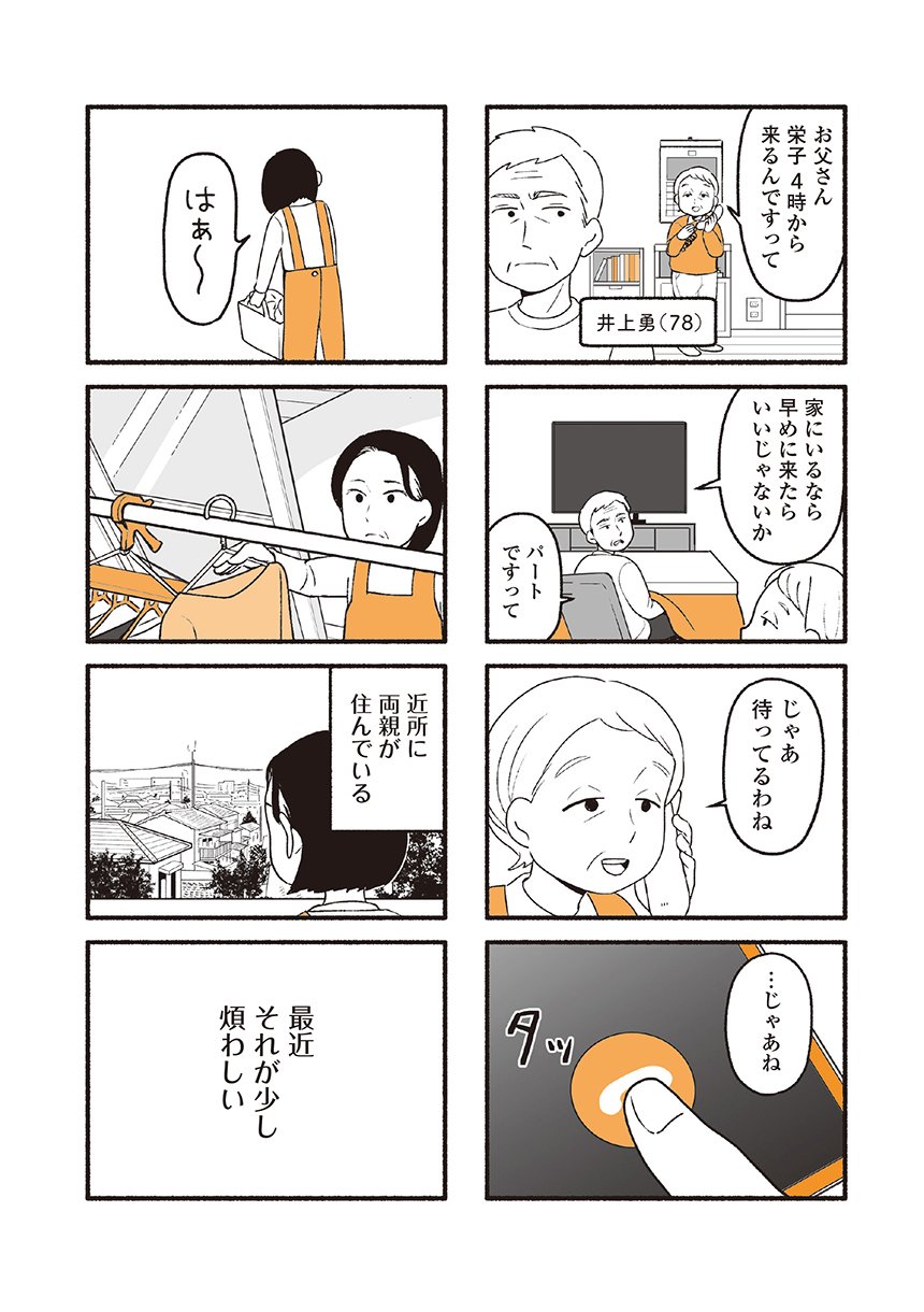 娘も巣立ち、パートで働きながら、定年退職間近の夫と二人で暮らしている栄子(54歳)は、近くに住む80代の父と母の老害っぷりに頭を悩ませている。