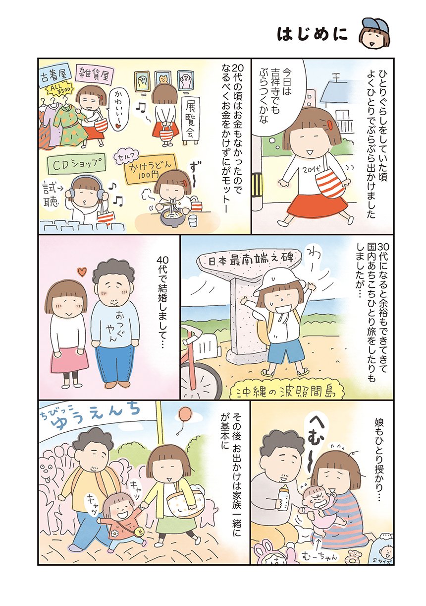 子どもが小学生になって自由時間が作れるようになった著者。ある日、貝拾いで間違って家に連れてきてしまった『やどかり』が気になり、夫と娘を送りだした後、ひとりでお台場の海へ『やどかり』を戻しに行く。その帰り道「せっかくお台場まで来たし、帰りはレインボーブリッジを歩いてみようかな…」とふと思い立ち、ドキドキ緊張しながらも潮風を感じながら橋を歩く。「こんな風に、一人で自分の時間を使うっていつぶりだろう…」 。独身時代はひとり旅で全国を旅した著者が、この日をきっかけに久し振りにお出かけを再開。大人になったけれど、やっぱりアタフタしたり緊張したりしながら、行ってみたい、やってみたいを叶えていきます。