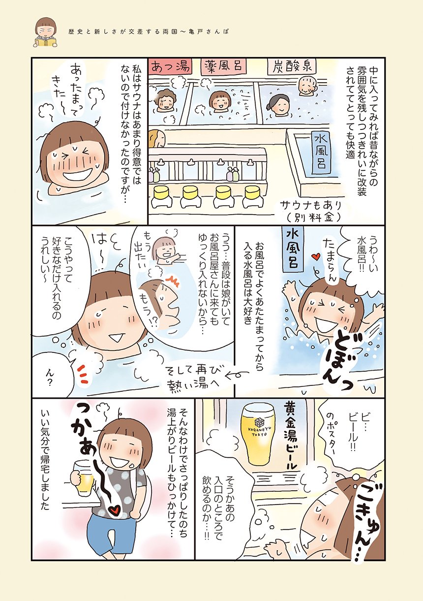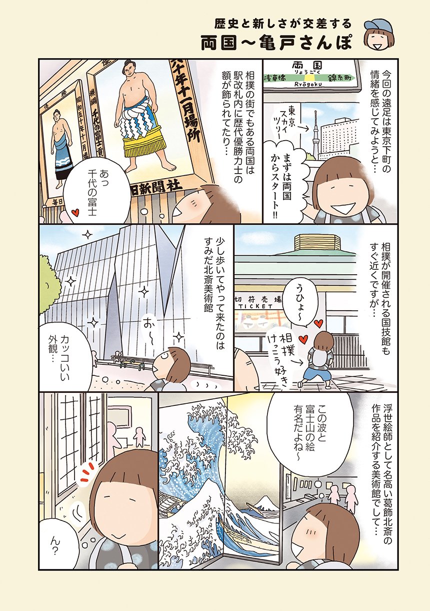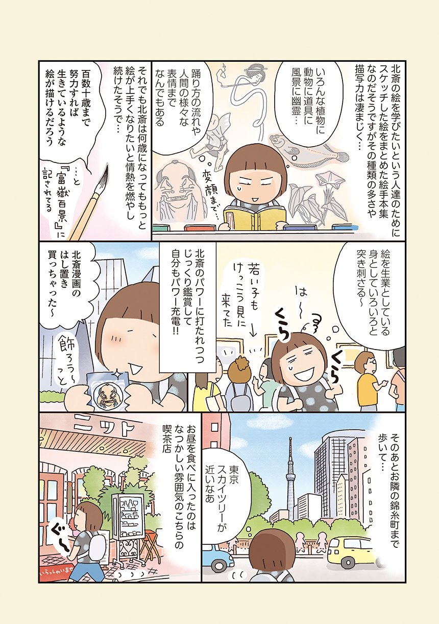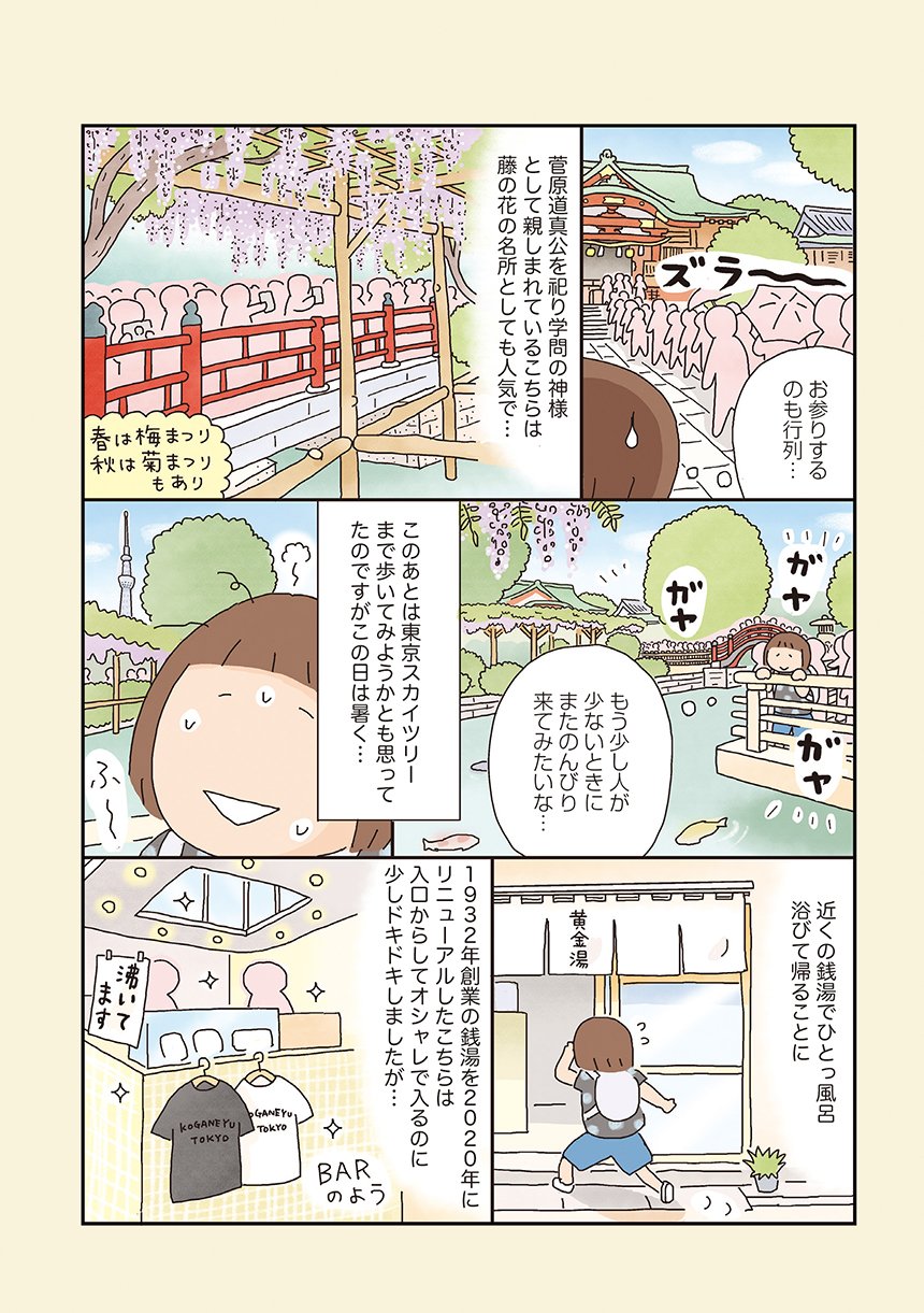 子どもが小学生になって自由時間が作れるようになった著者。ある日、貝拾いで間違って家に連れてきてしまった『やどかり』が気になり、夫と娘を送りだした後、ひとりでお台場の海へ『やどかり』を戻しに行く。その帰り道「せっかくお台場まで来たし、帰りはレインボーブリッジを歩いてみようかな…」とふと思い立ち、ドキドキ緊張しながらも潮風を感じながら橋を歩く。「こんな風に、一人で自分の時間を使うっていつぶりだろう…」 。独身時代はひとり旅で全国を旅した著者が、この日をきっかけに久し振りにお出かけを再開。大人になったけれど、やっぱりアタフタしたり緊張したりしながら、行ってみたい、やってみたいを叶えていきます。