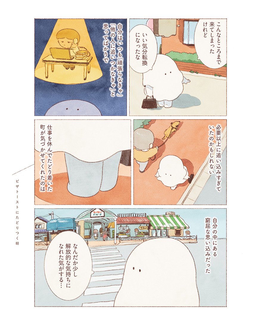 地方から上京し、就職活動中の大学生の主人公「私」は、「人生このままでいいのかな?」と悩みを感じ、気づいたらおばけの姿になってしまう。そんな将来への不安と向き合いながら、日々の中で、気分転換に私は小さな「旅」に出る。その過程で出会う人々や旅先でのおいしいごはんを通じて、少しずつ自分らしい生き方を選んでいく。そんな悩める「おばけ」の姿を描いた、あたたかくて優しい物語。