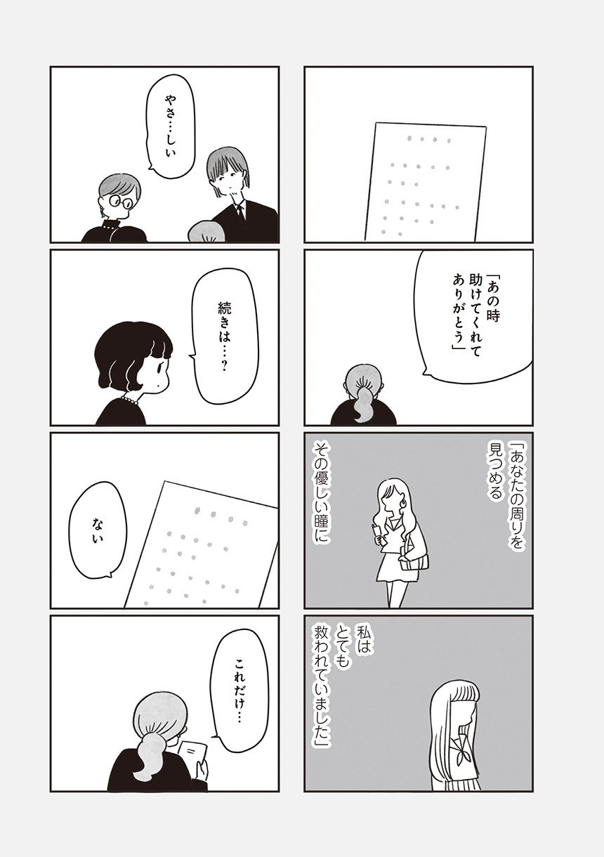40歳を過ぎたある日、地元を離れて暮らす私のもとにお葬式の招待状が届いた。結婚式の招待状みたいに華やかなそれの差出人は、亡くなった高校の同級生。名前に覚えはある…でも、なんで私?  本当の友達なんていないと思っていた男女4人の物語。それぞれが「高校生だった頃の私が今の私を見たらどう思うだろう」と、上手くいかない現実への思いを抱えて暮らしている。住む場所も生き方も異なる4人は、高校時代に一瞬だけ重なり合う瞬間があった。